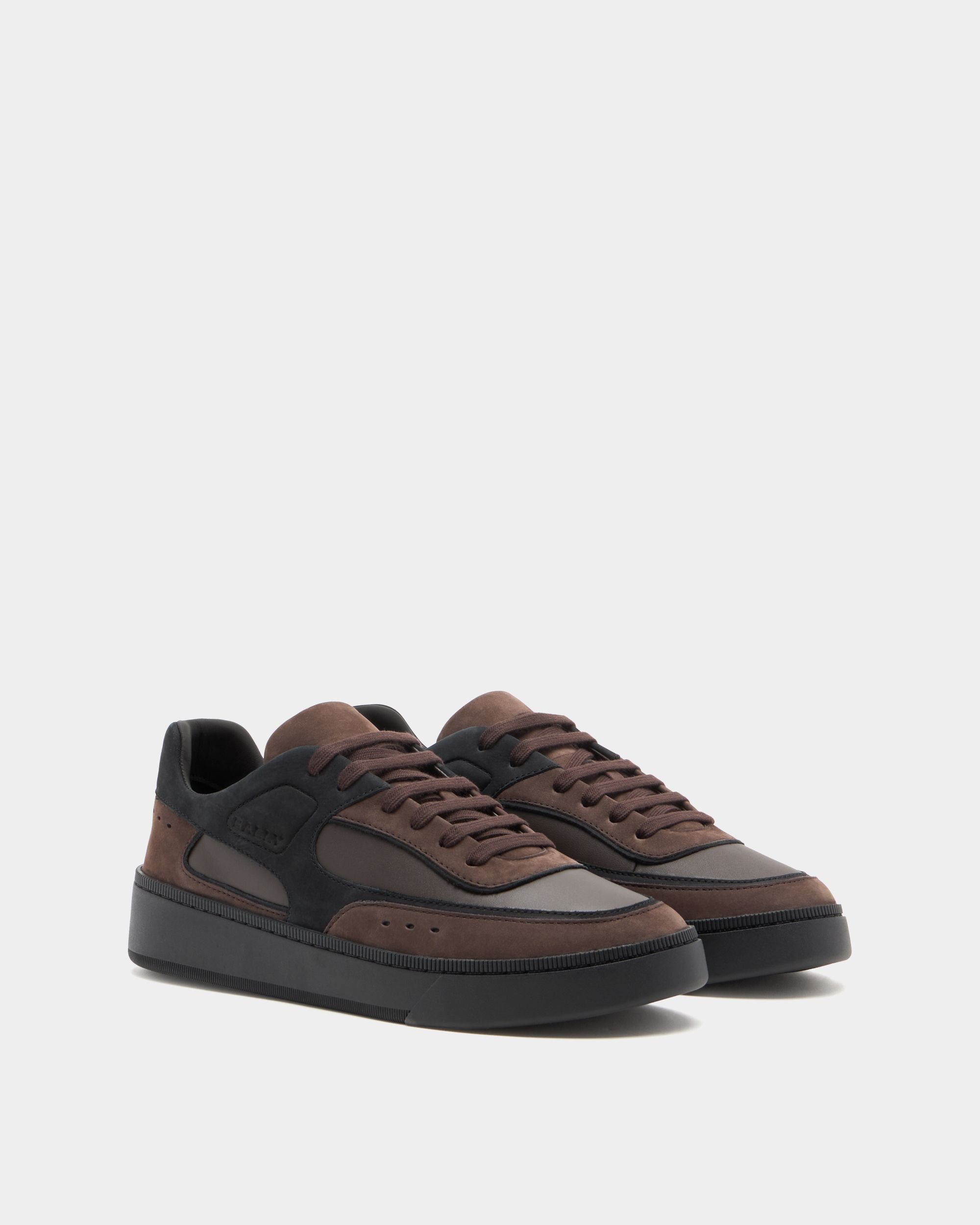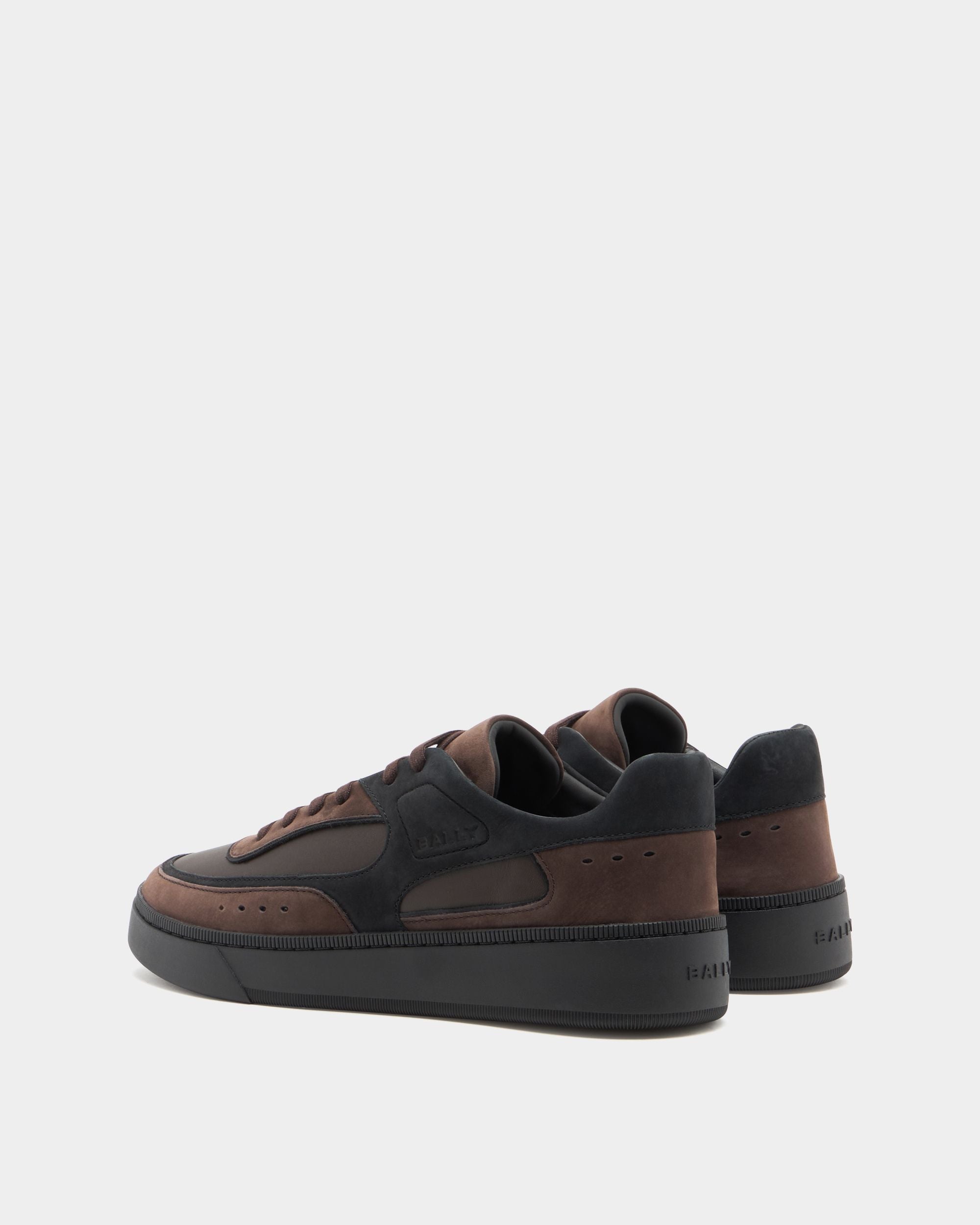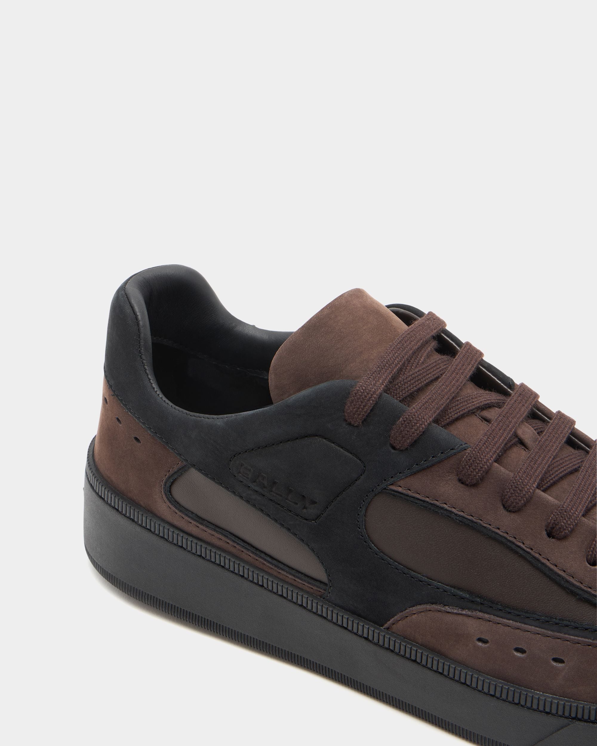 This Raise sneaker in Ebano and black nubuck is characterized by a comfortable and contemporary raised sole. Debossed Bally signifiers – the logo and Crest – embellish the side. tongue and heel for an iconic finish.
