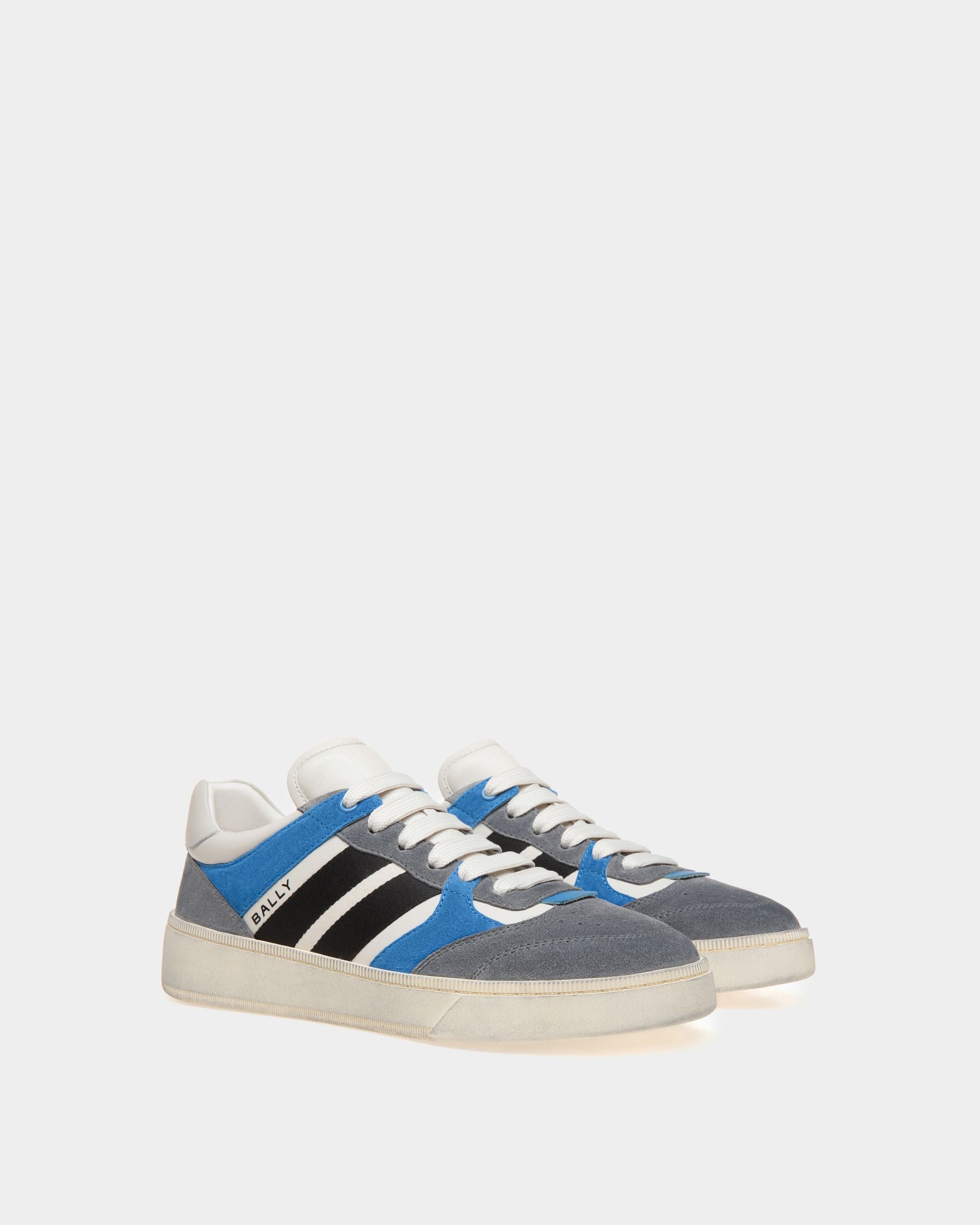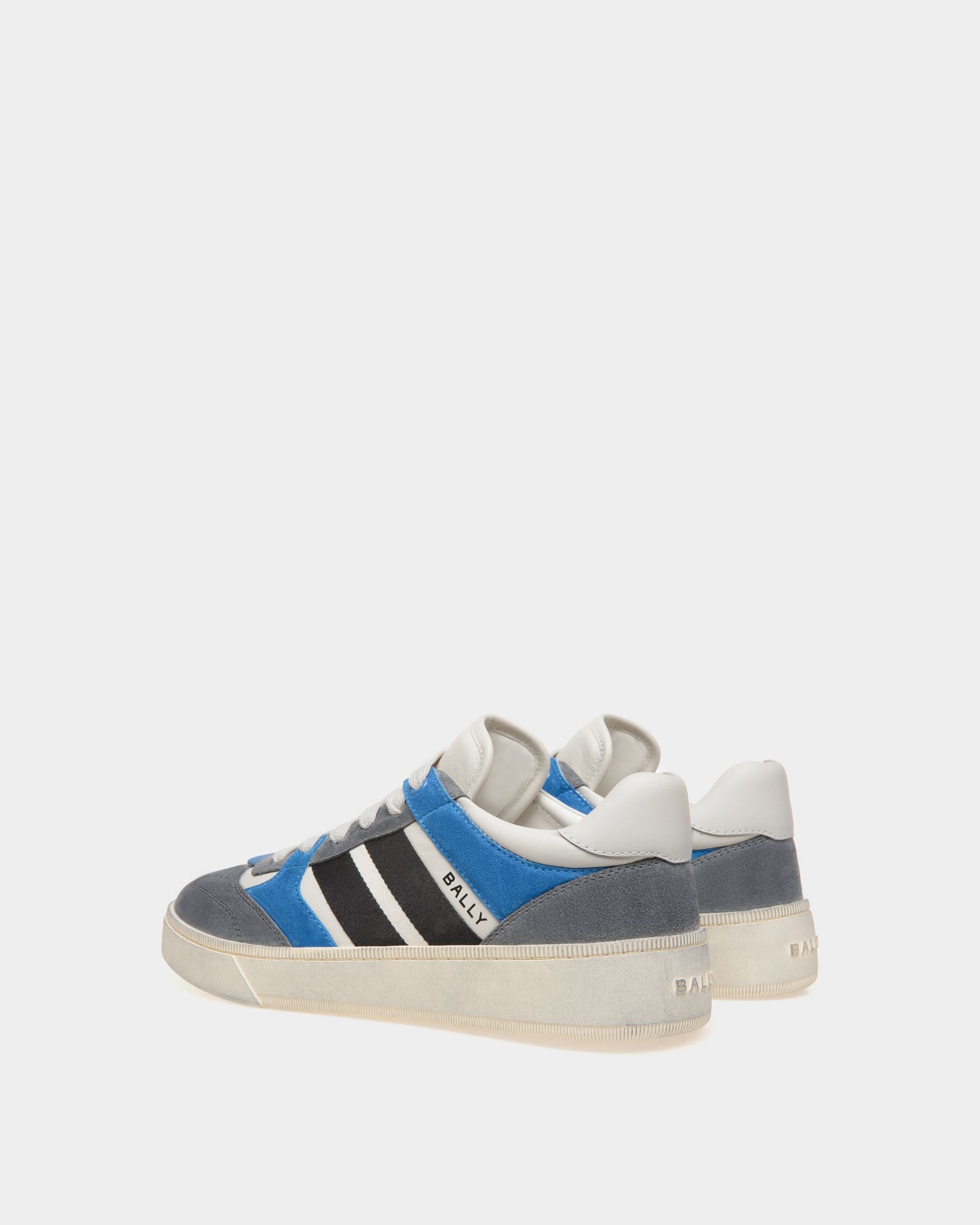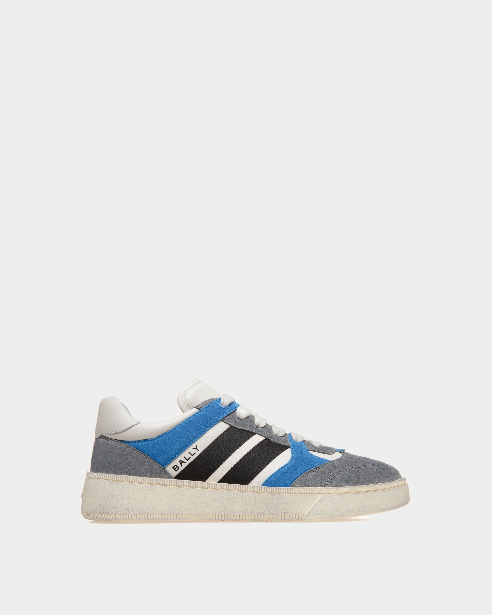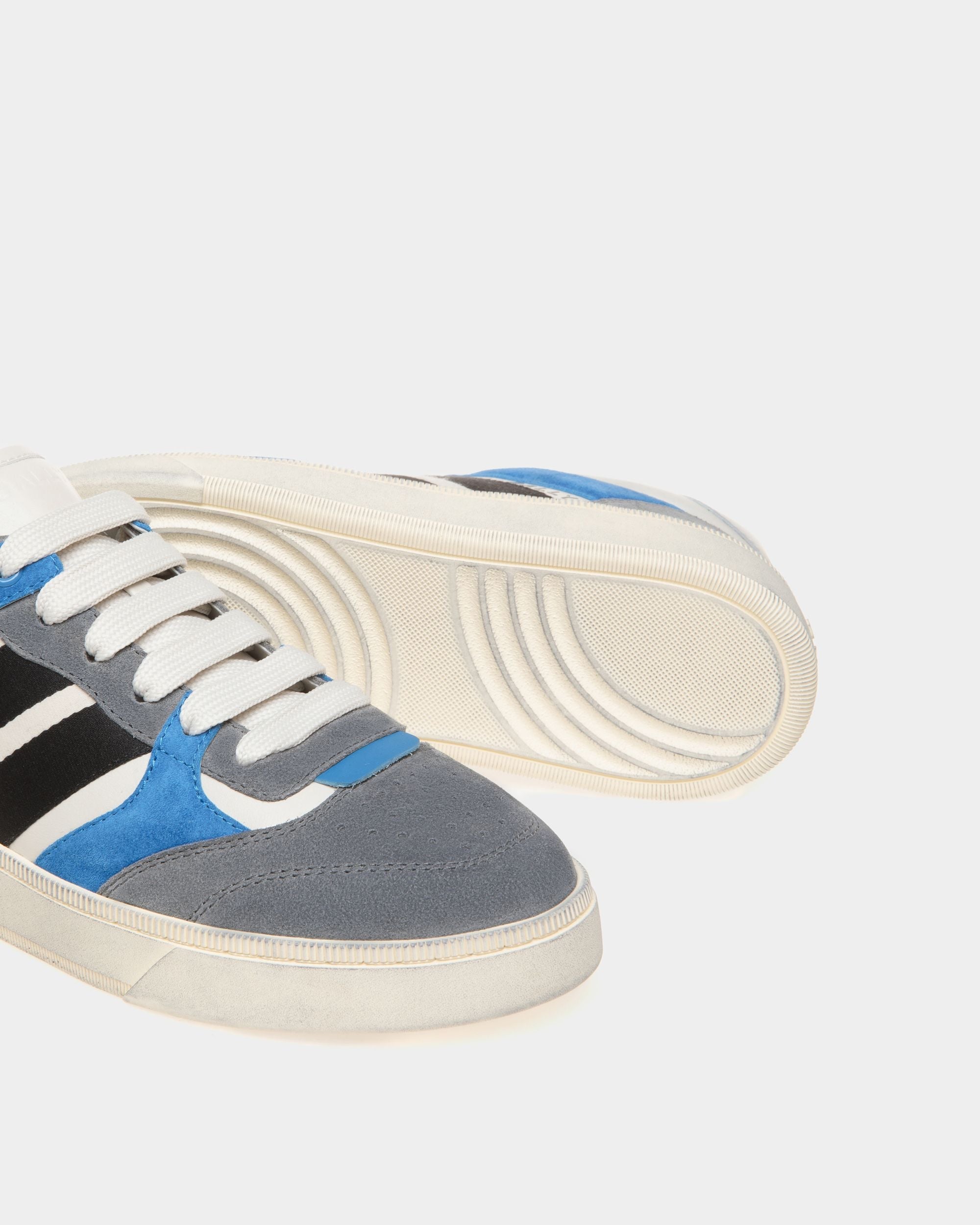 The Raise sneaker in grey. blue and white is crafted with premium suede. featuring a vibrant palette of colors. The durable rubber sole offers optimal comfort. with a contemporary lived-in look. A black and white Bally Ribbon trims the side of the upper.