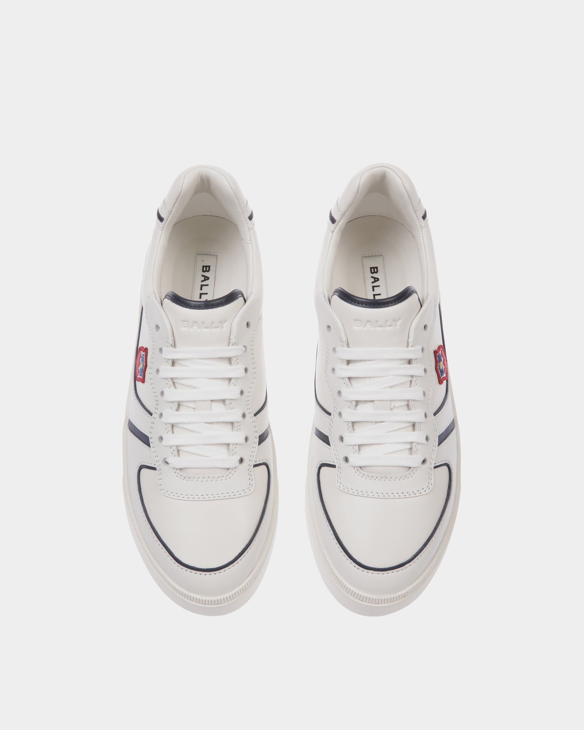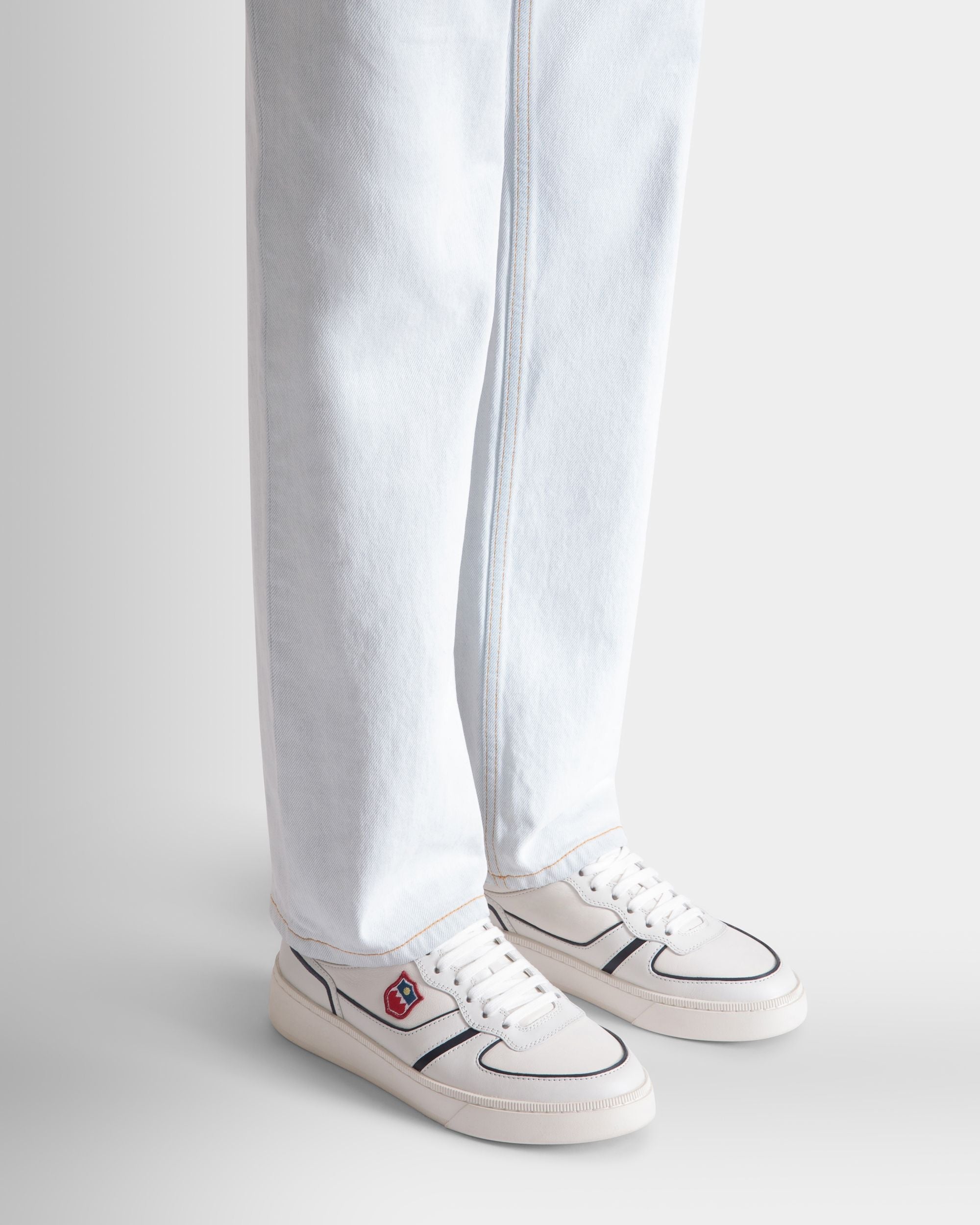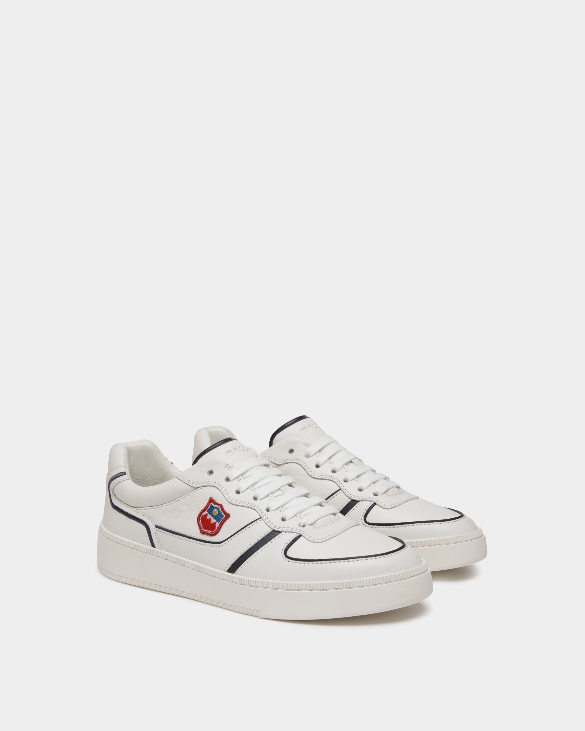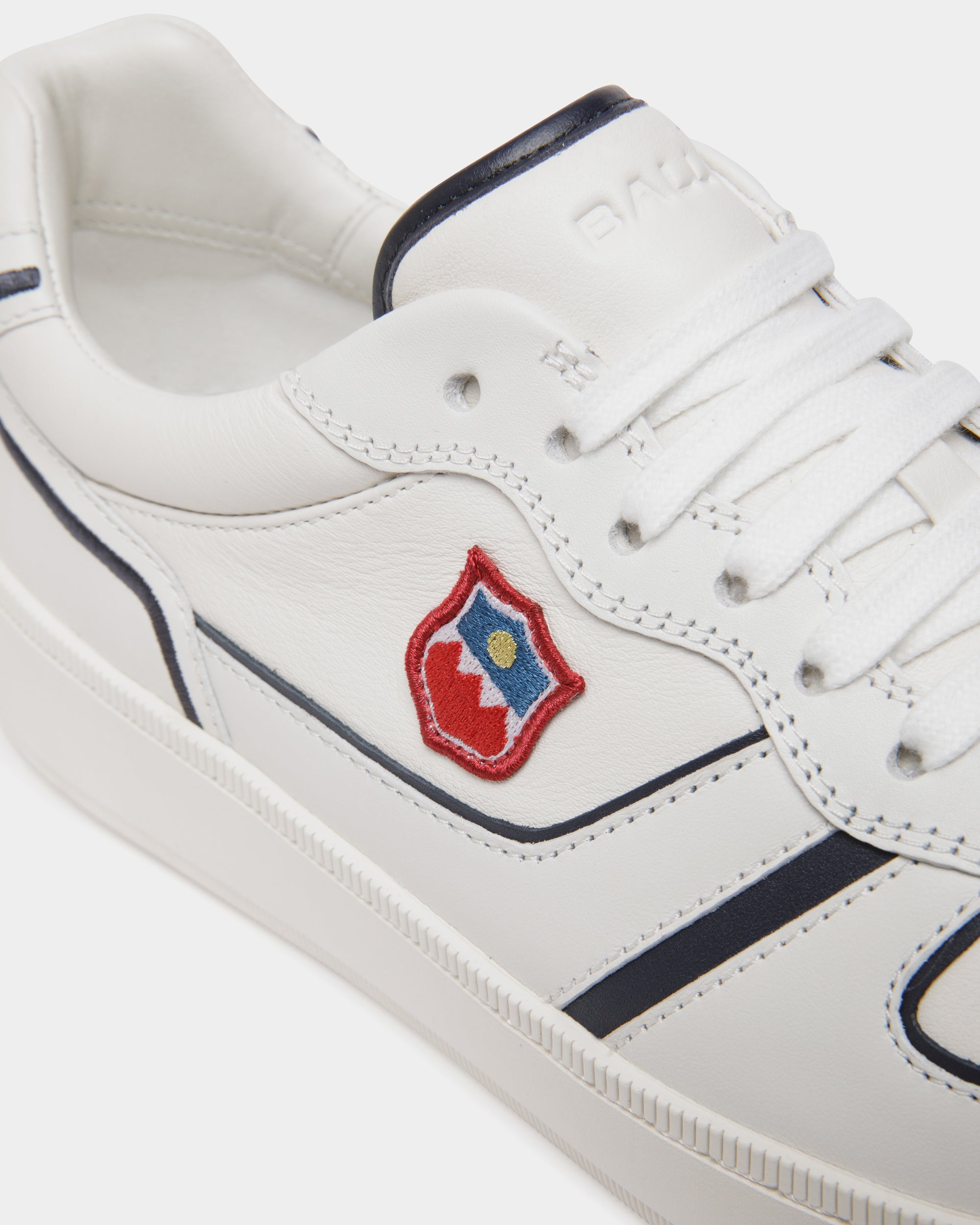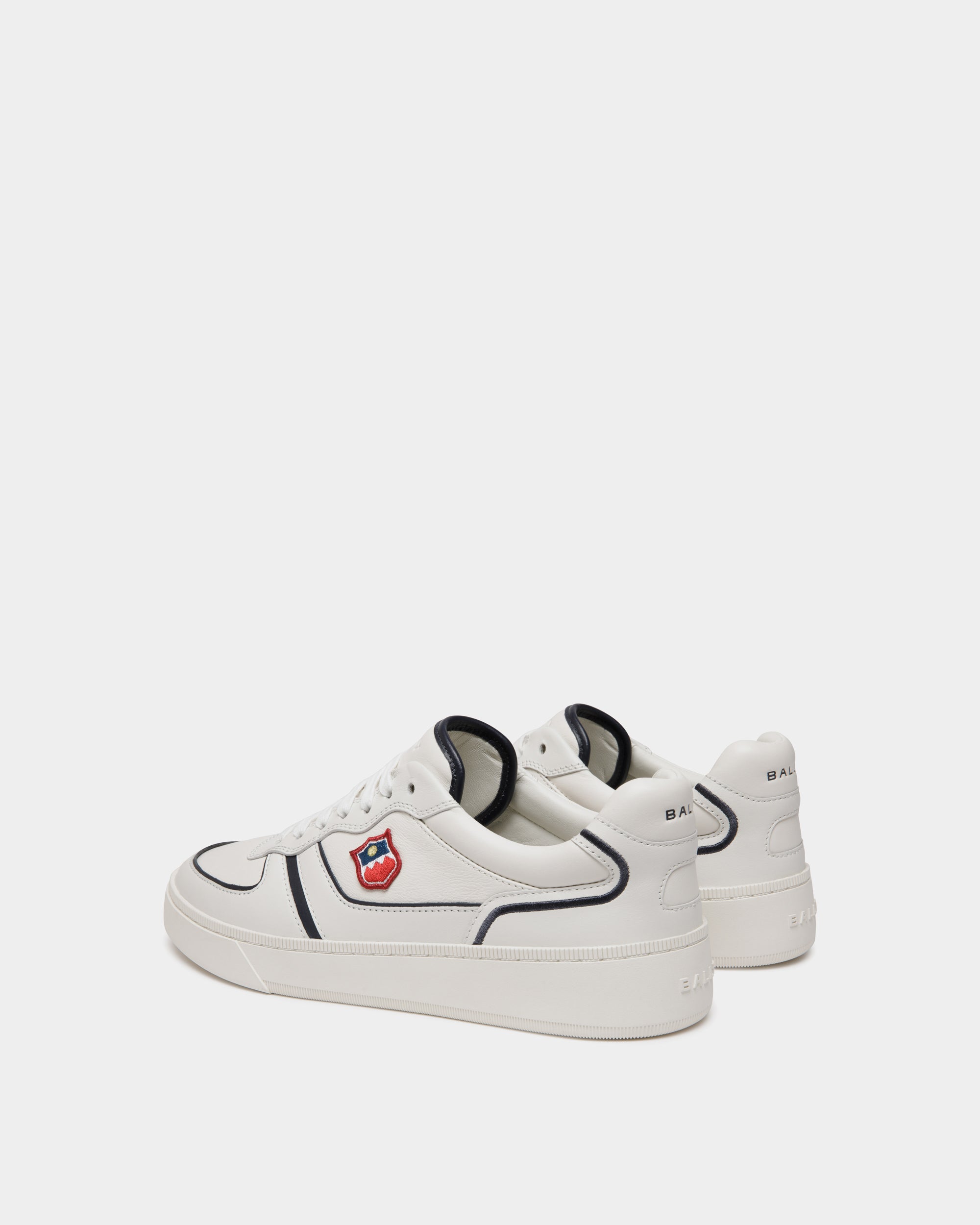 Contrast contours define this Raise sneaker in white and navy blue leather with a soft nappa-like finish. An embroidered Bally Crest patch embellishes the quarter.