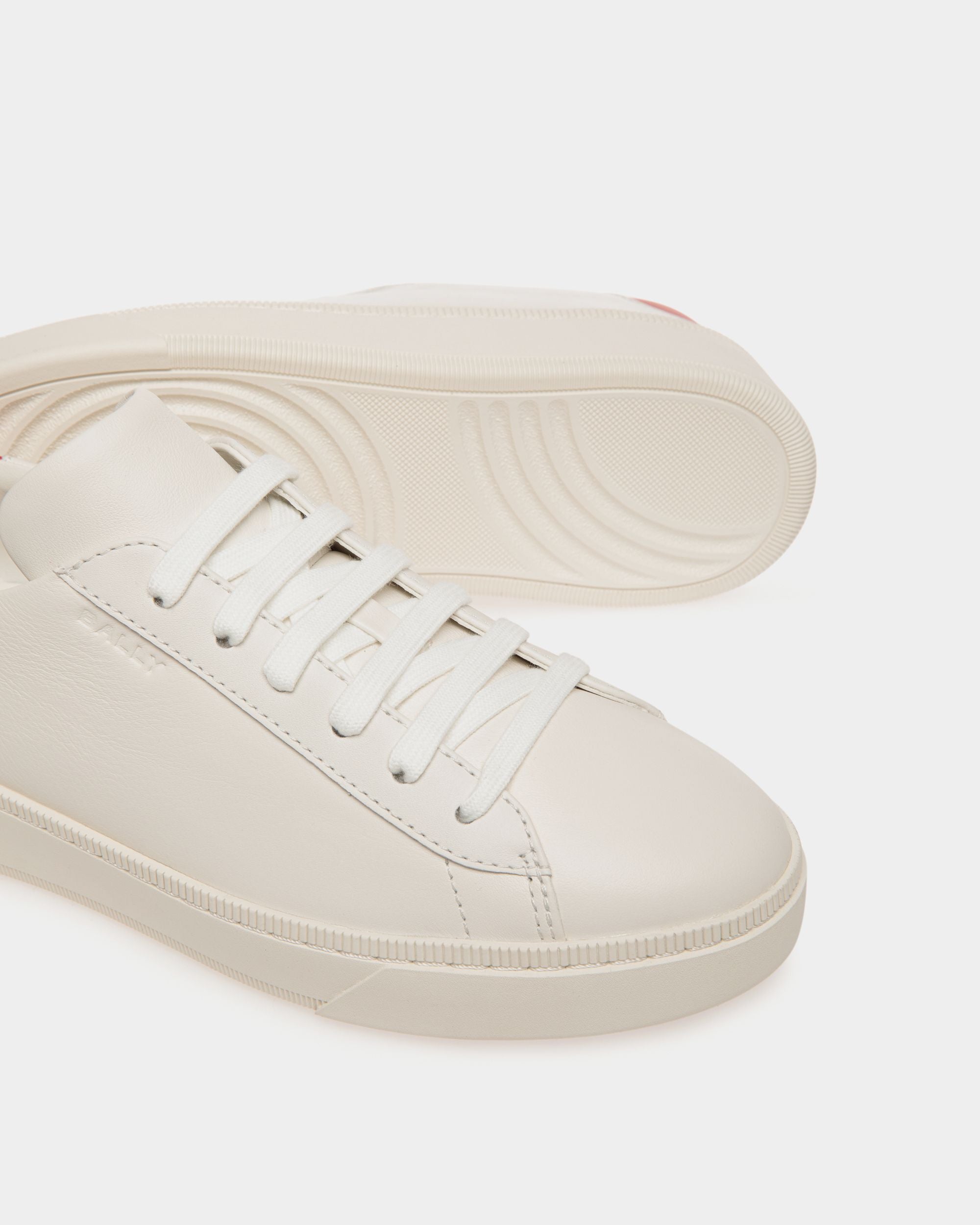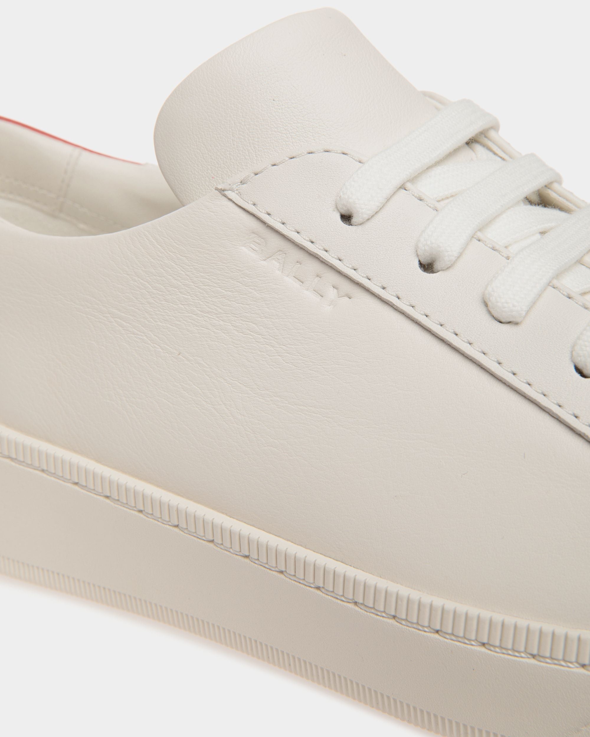 The calfskin upper of this white Raise sneaker is united with a raised rubber sole. The red heel tab adds an iconic pop of color.
