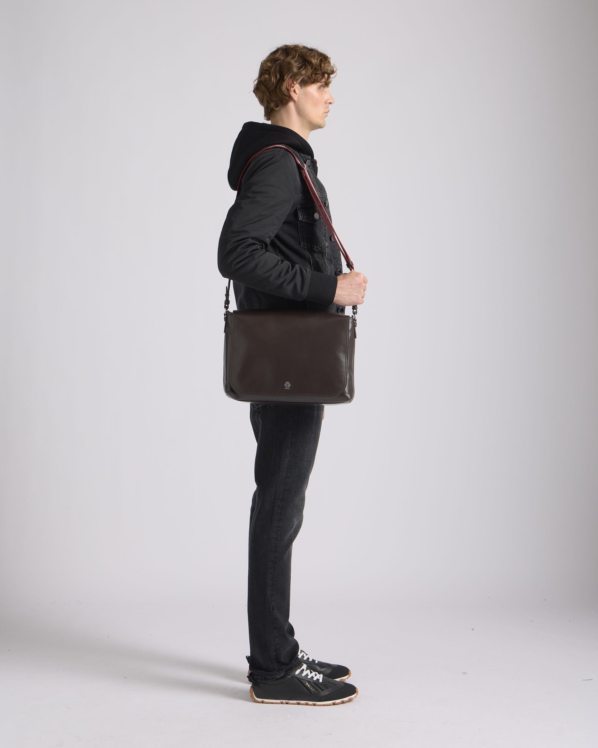 In Chocolate brown calfskin. the Ray crossbody bag has a timeless silhouette. A top handle in leather and an adjustable shoulder strap in red and white grosgrain seamlessly transition between hand and shoulder carry. The Bally Crest on the flap brings a touch of Swiss heritage to this versatile bag.