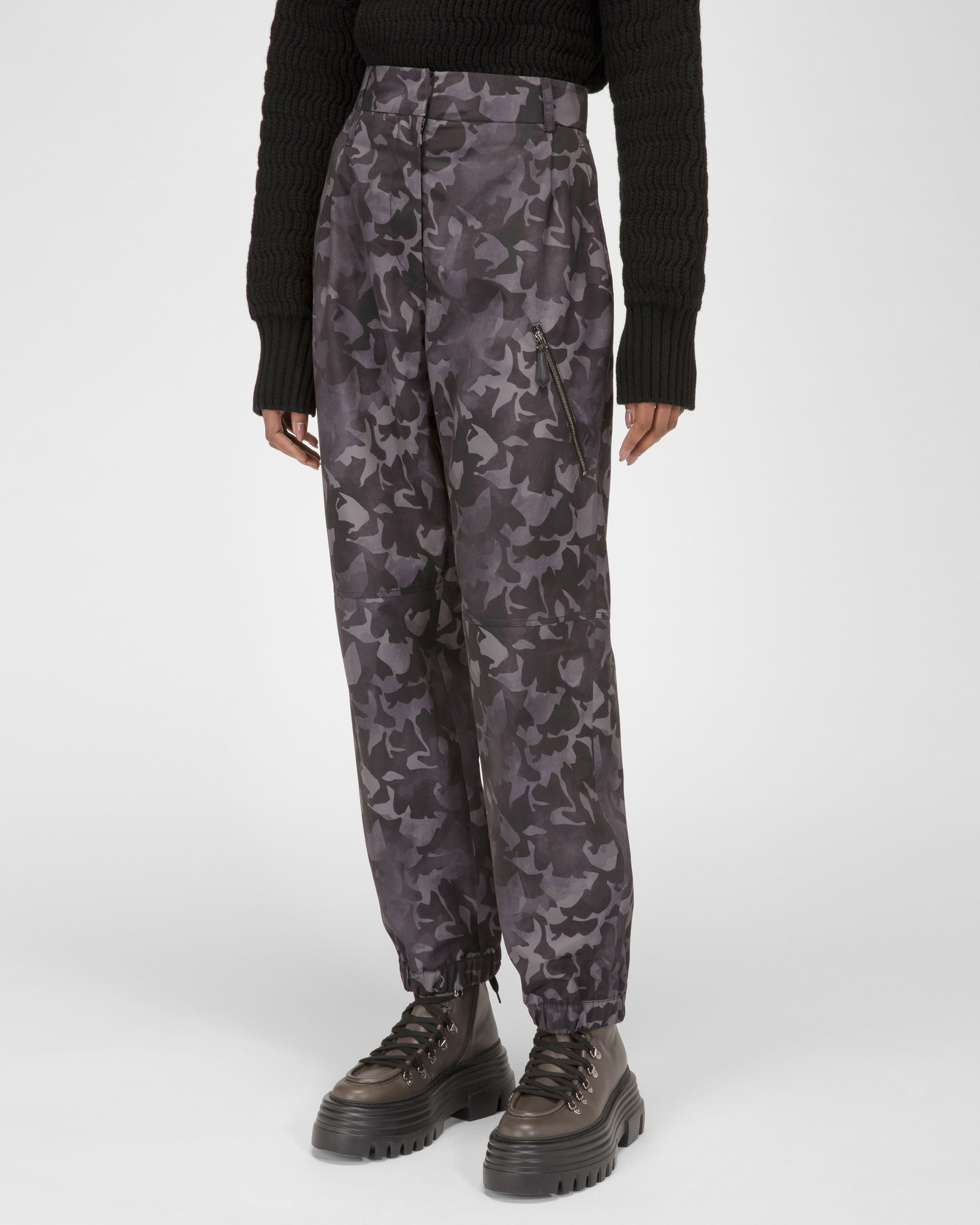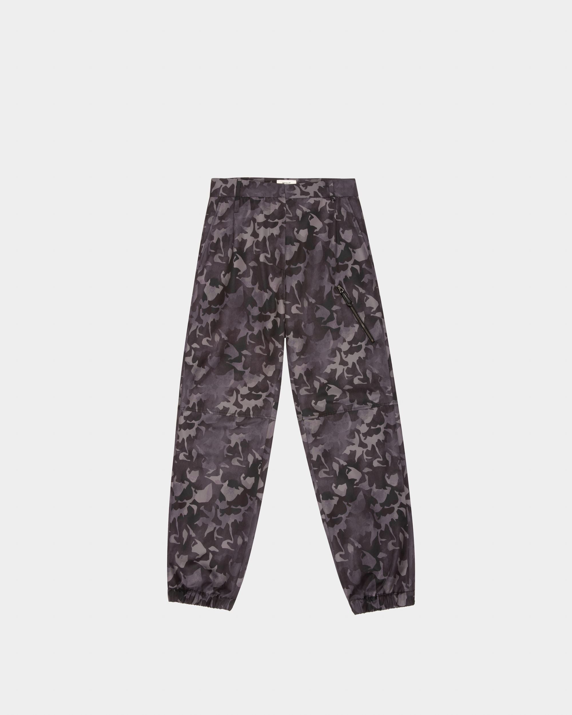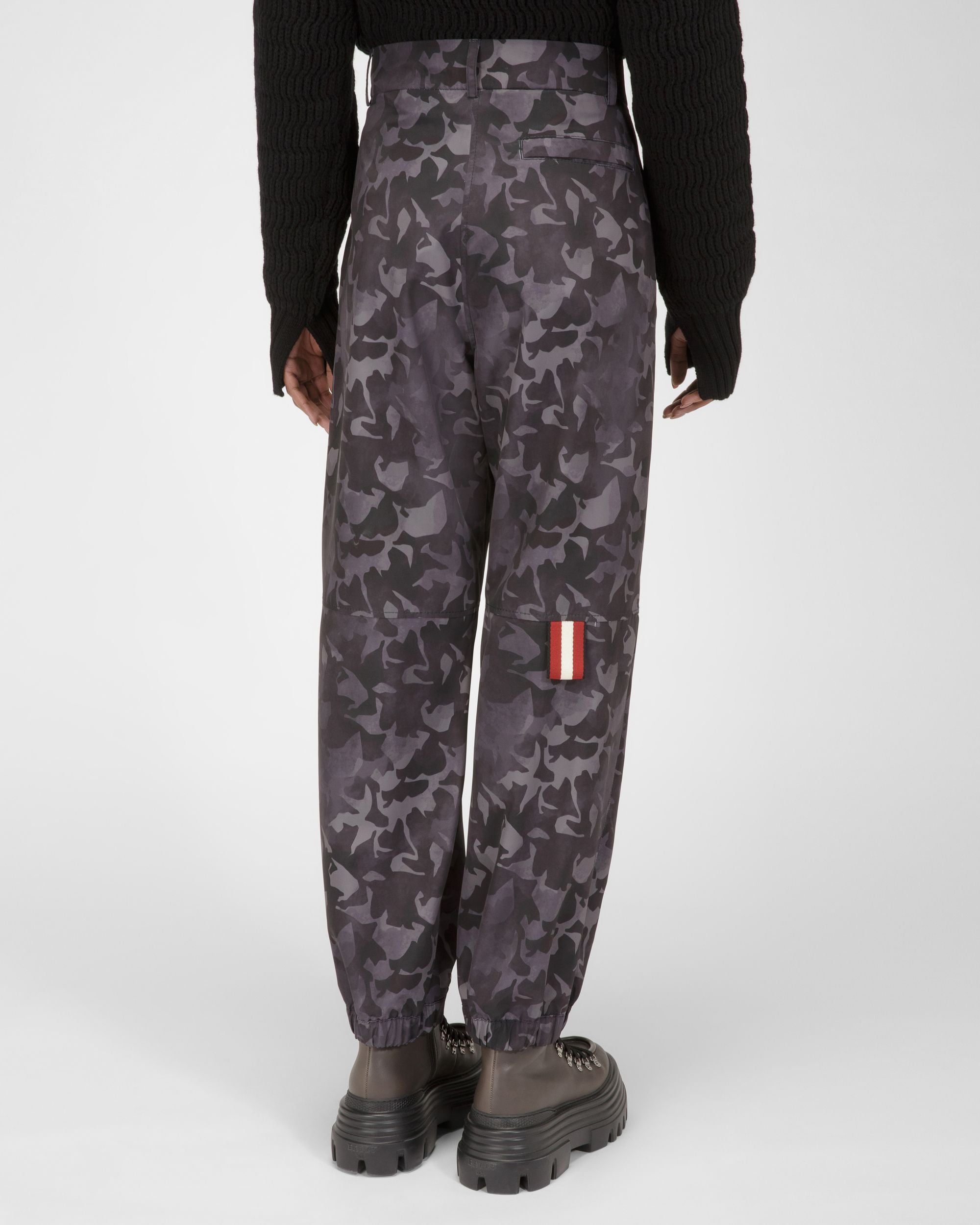 Made from recycled nylon in multitone black camouflage print. these joggers feature a number of signature details. such as the leather-trimmed pocket at the front and Bally Stripe loop at the back.