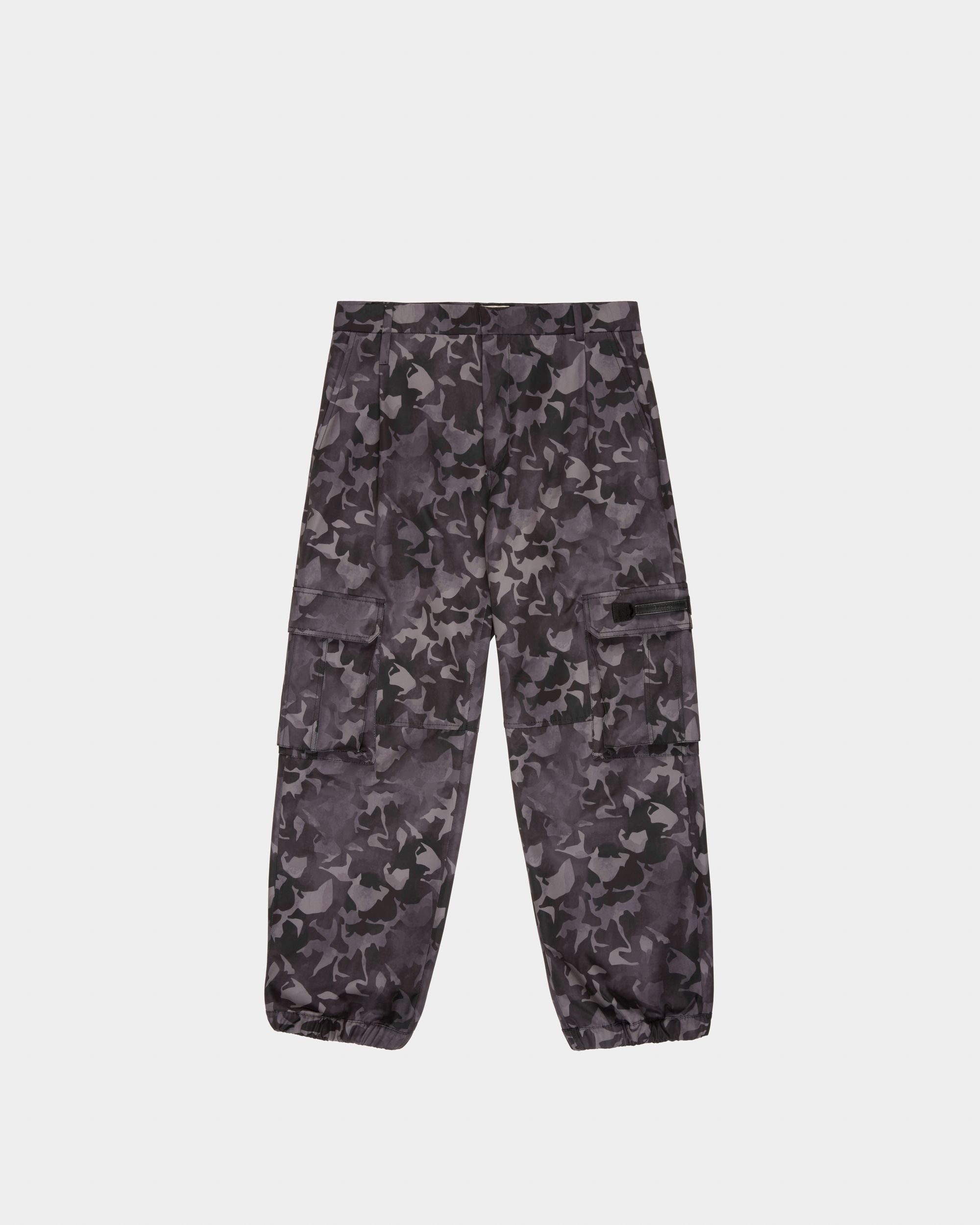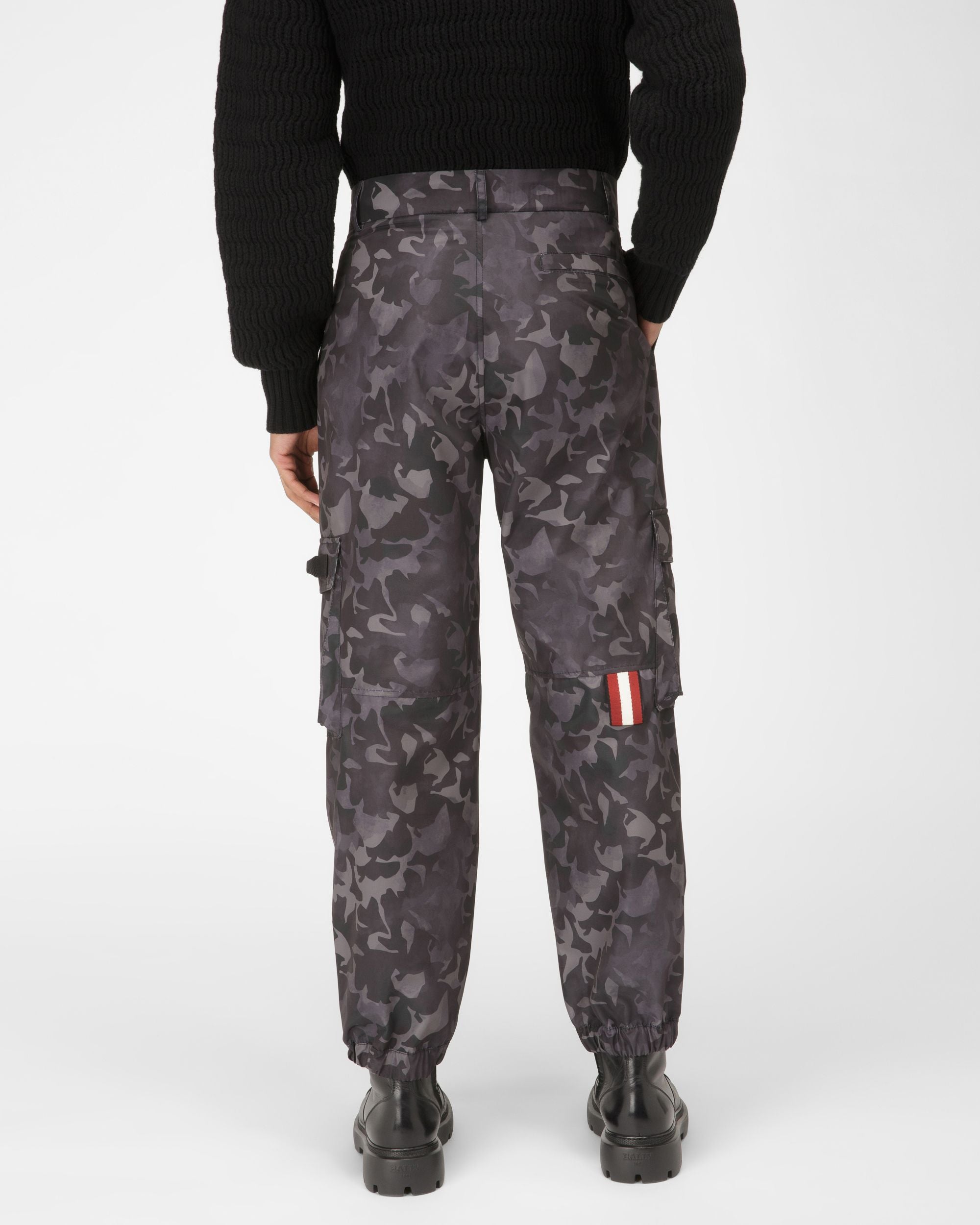 Crafted from recycled polyester adorned with a camouflage print in multitone black. these trousers channel a classic casual silhouette. complete with cargo pockets at the sides.Signature details include a logo-embossed leather hook and Bally Stripe jacquard loop.