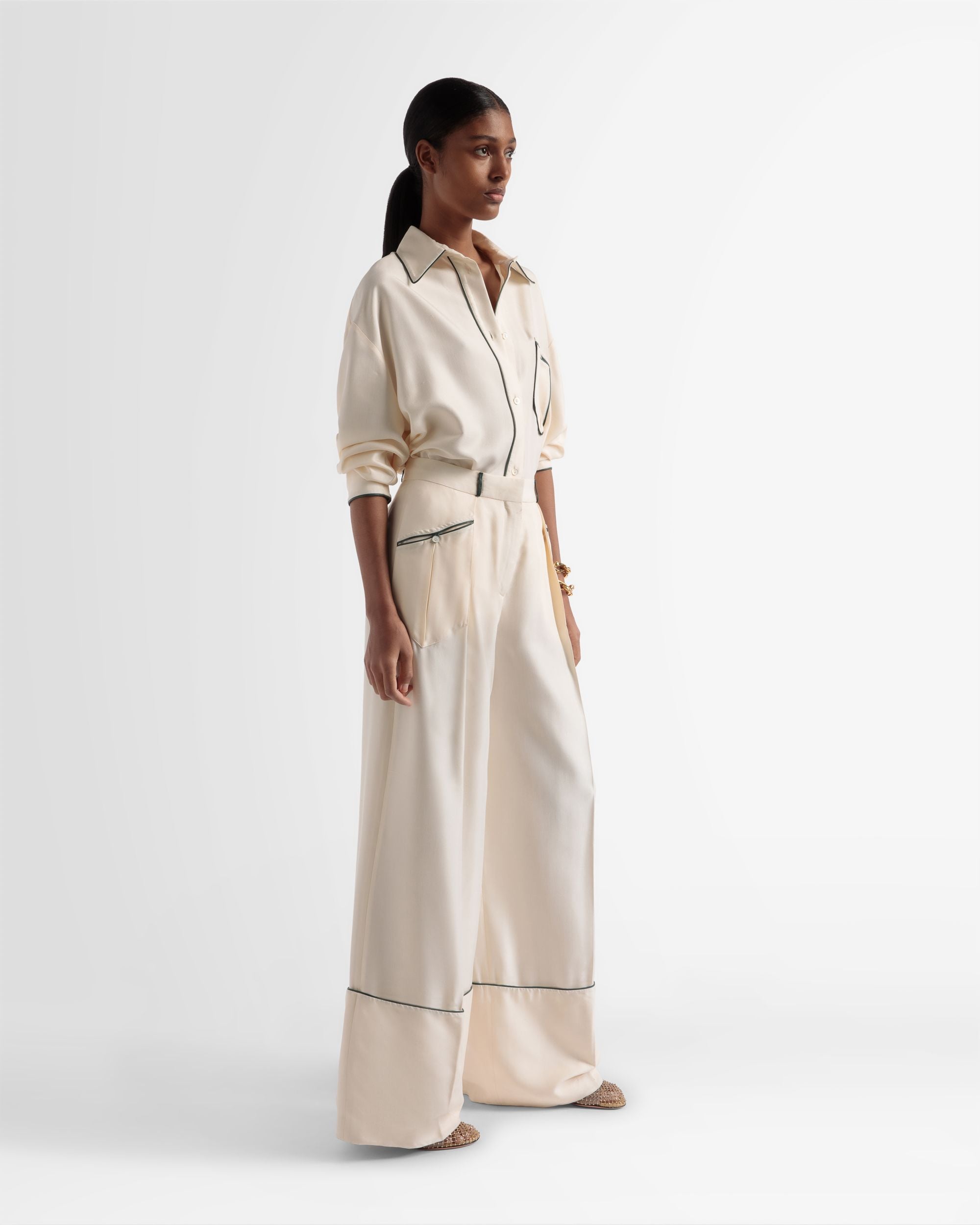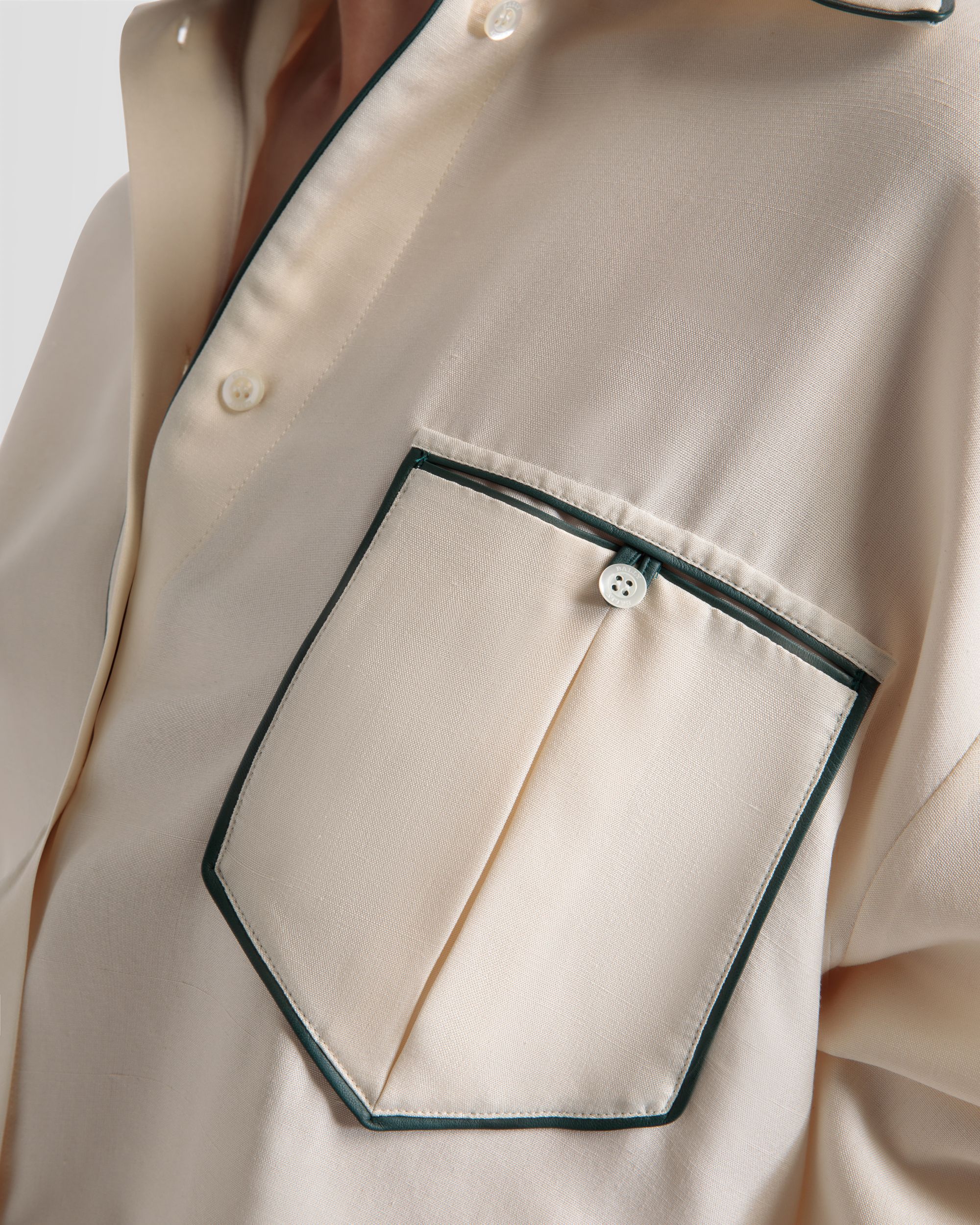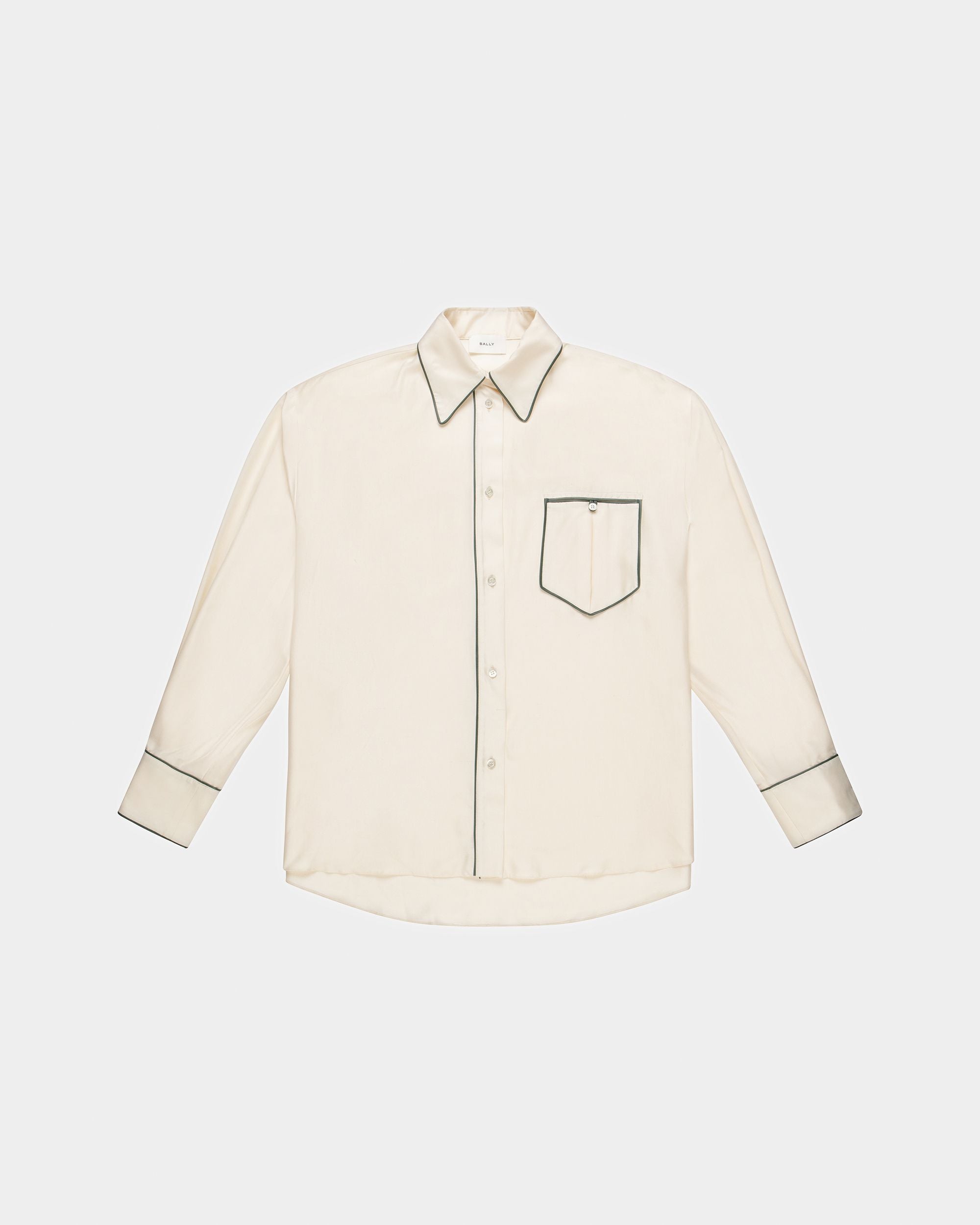 A modern take on shirting ??this relaxed-fitting style is complete with contrast leather piping and an oversized collar. It’s crafted from silk for a luxurious feel.