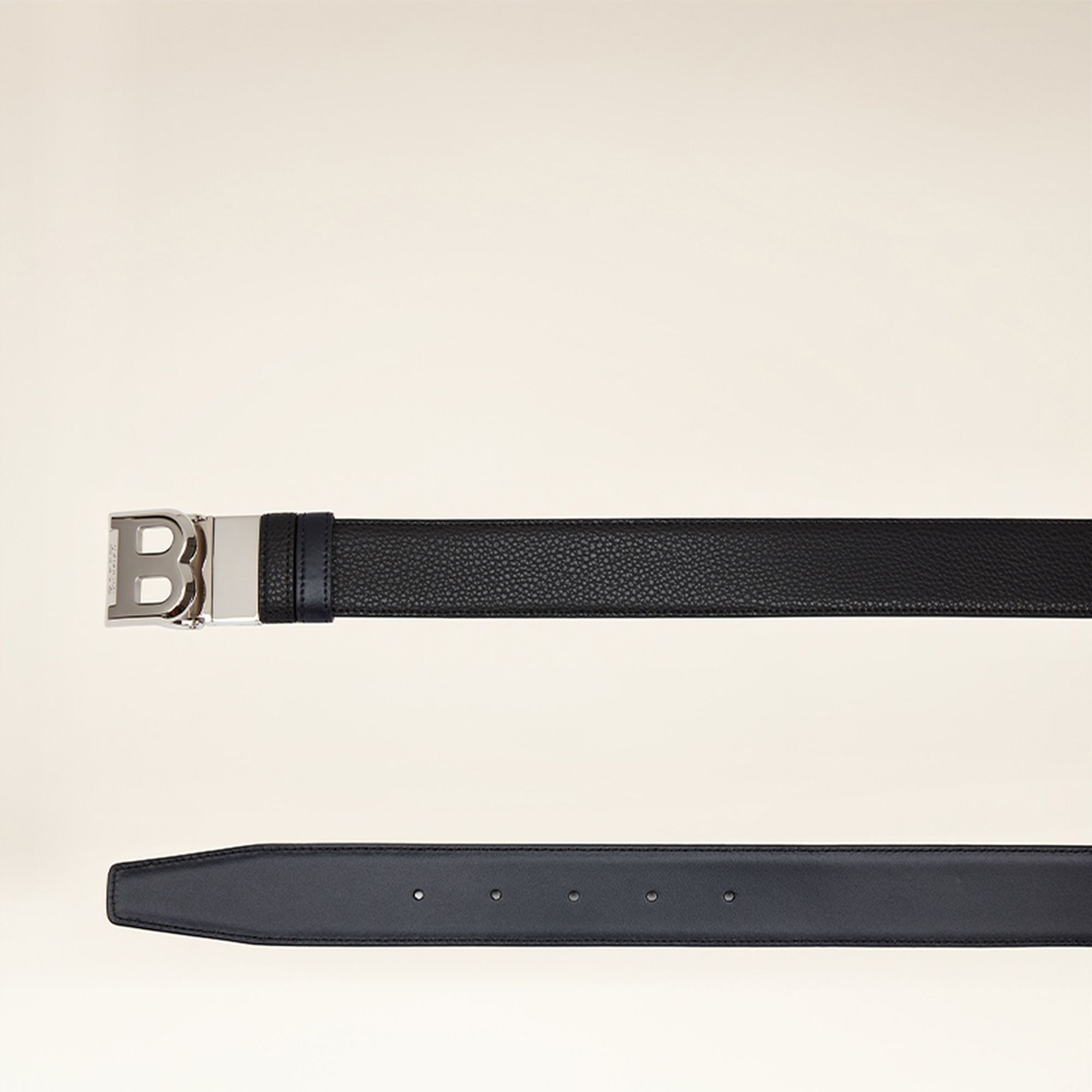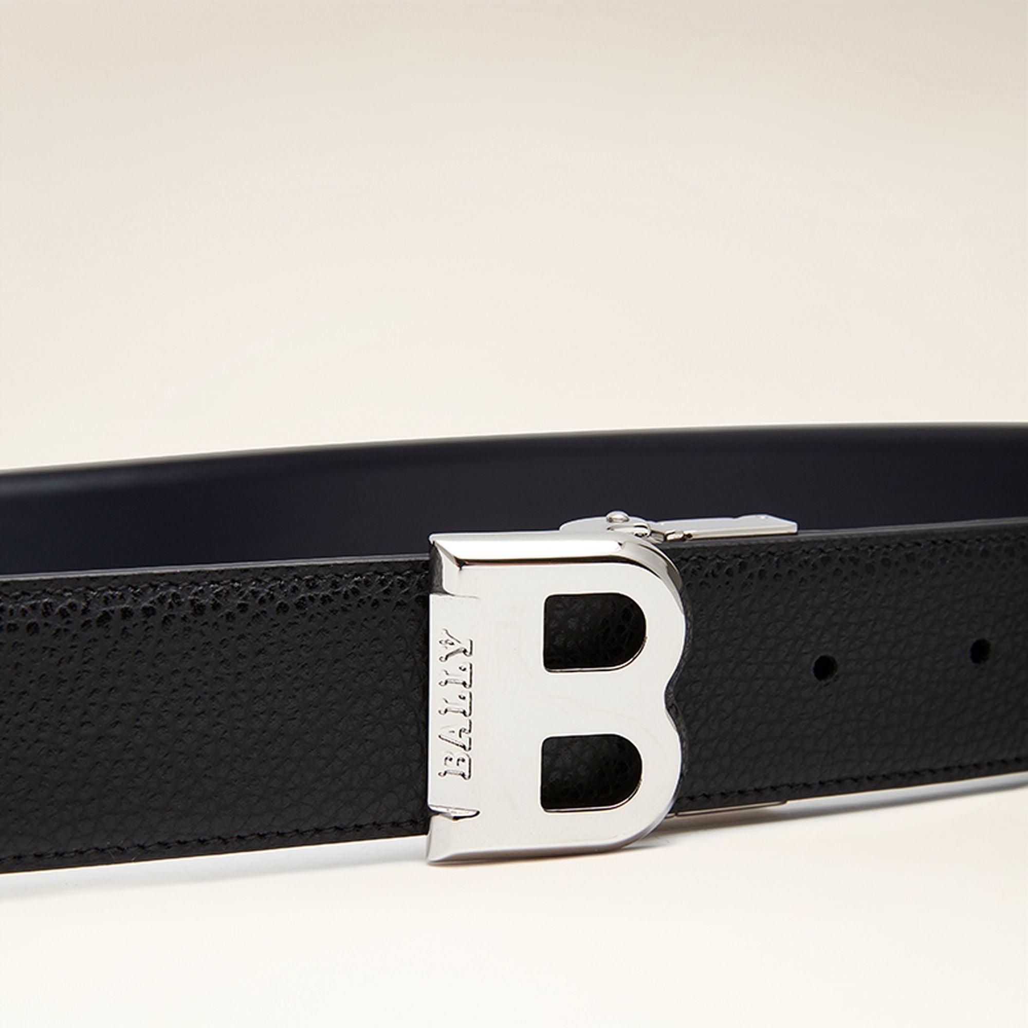 This belt is made from durable grained leather. It fastens with a polished metal Bally B buckle.