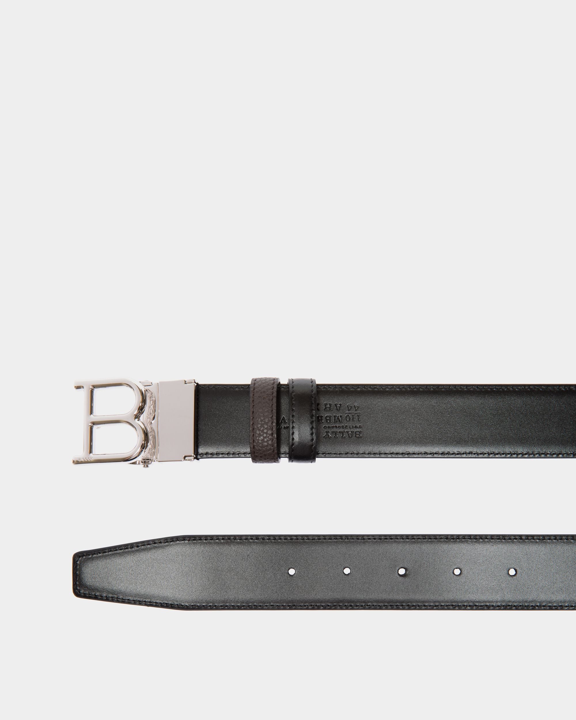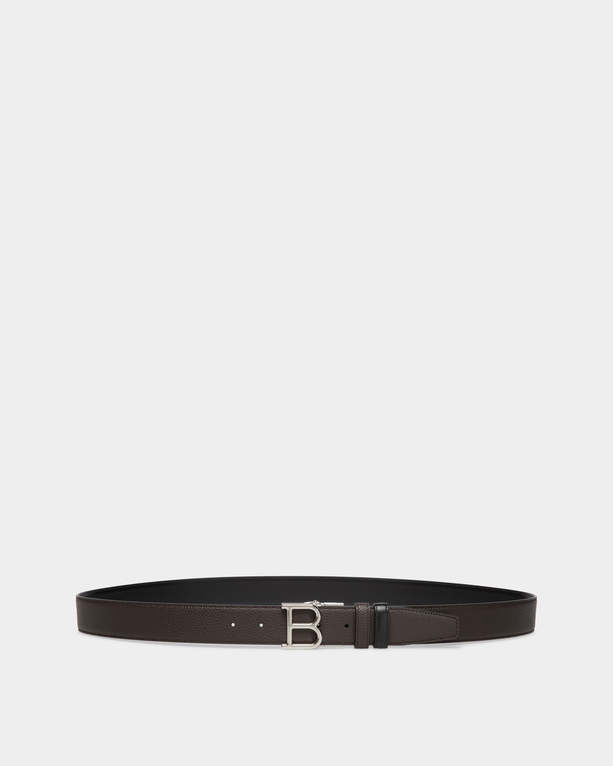 This belt is made from durable grained leather. It fastens with a polished metal Bally B buckle.