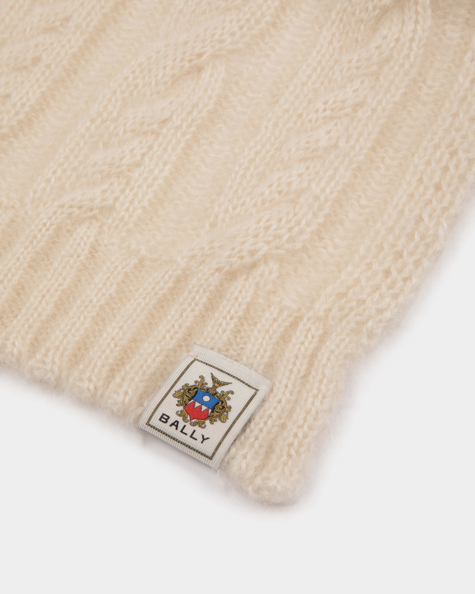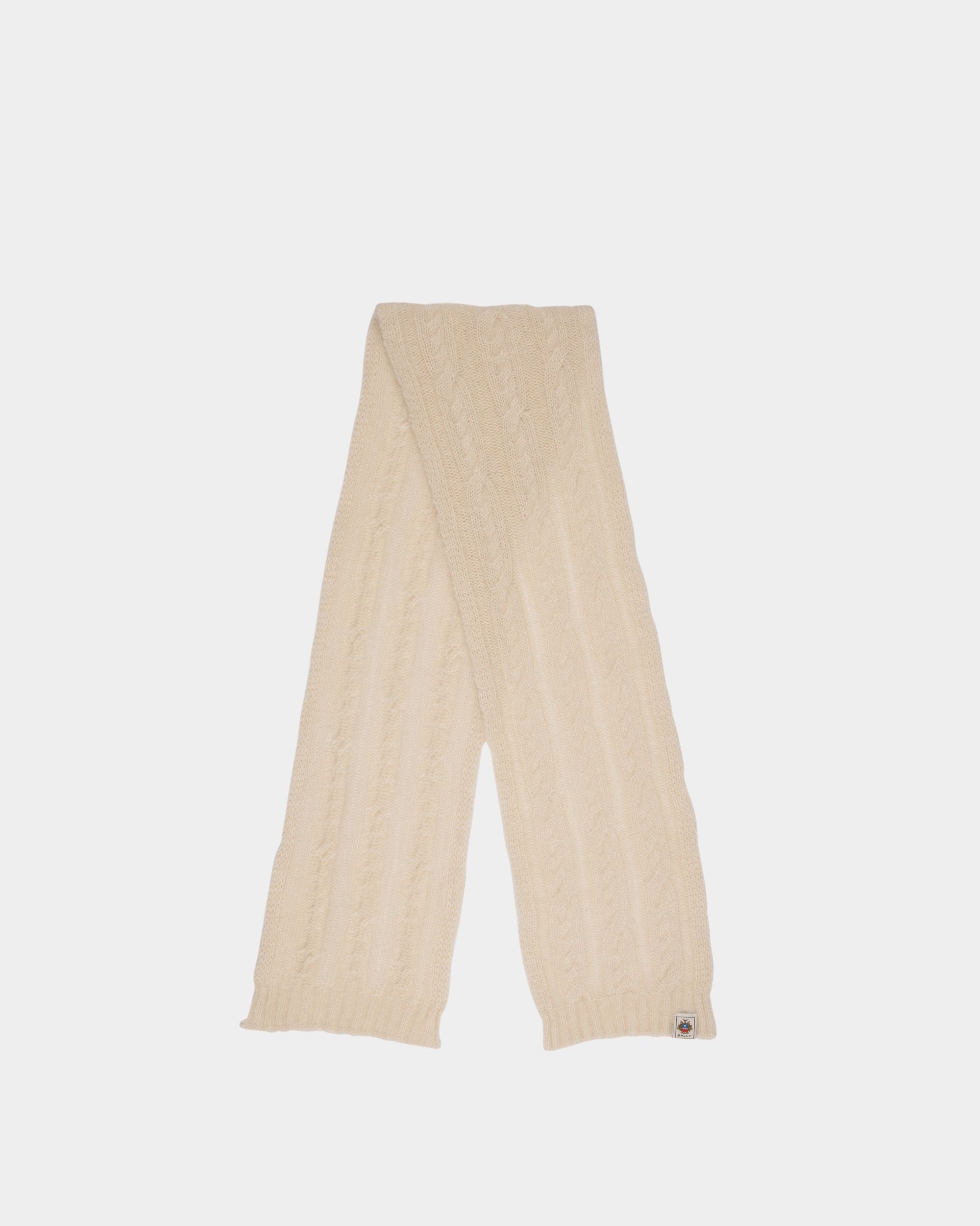 In a classic Ivory hue. this cable-knit scarf is soft and warm in a deluxe blend of mohair and silk.