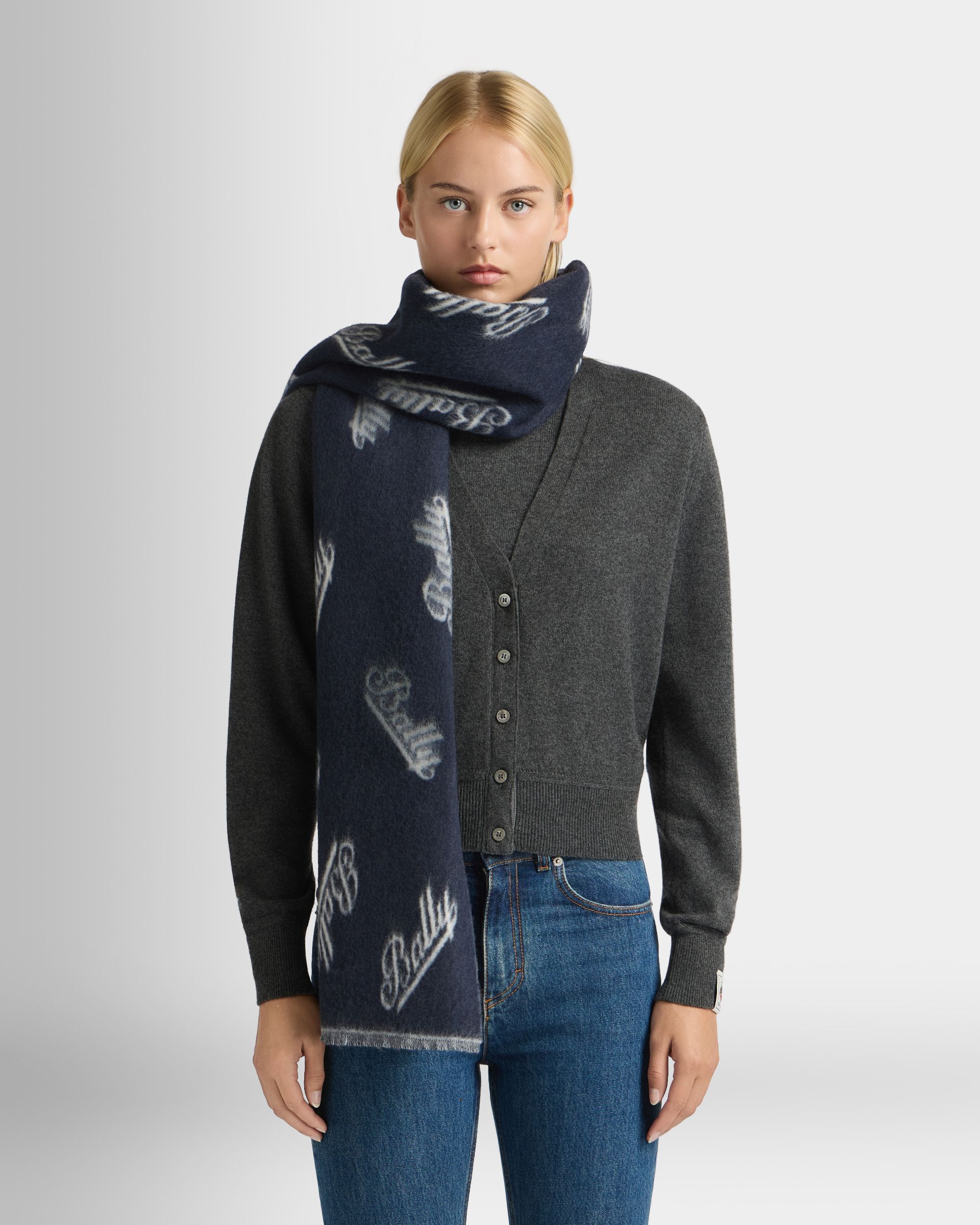 Jacquard knit in 100% wool. this scarf is emblazoned with an all-over cursive Bally logo motif.