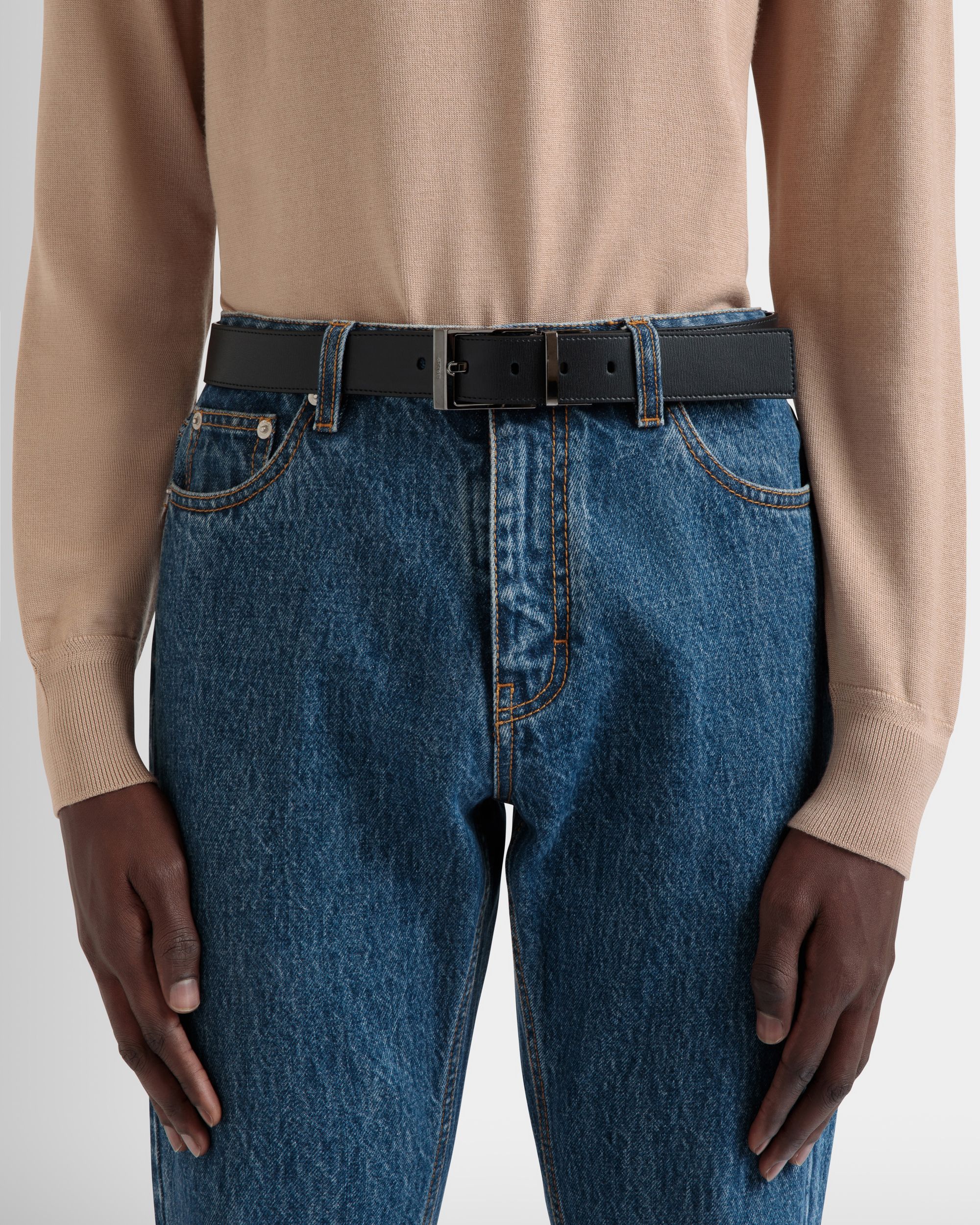 This Shiffie 35 mm belt in black and navy blue calfskin features a reversible and adjustable design with a ruthenium-hue buckle at the front.