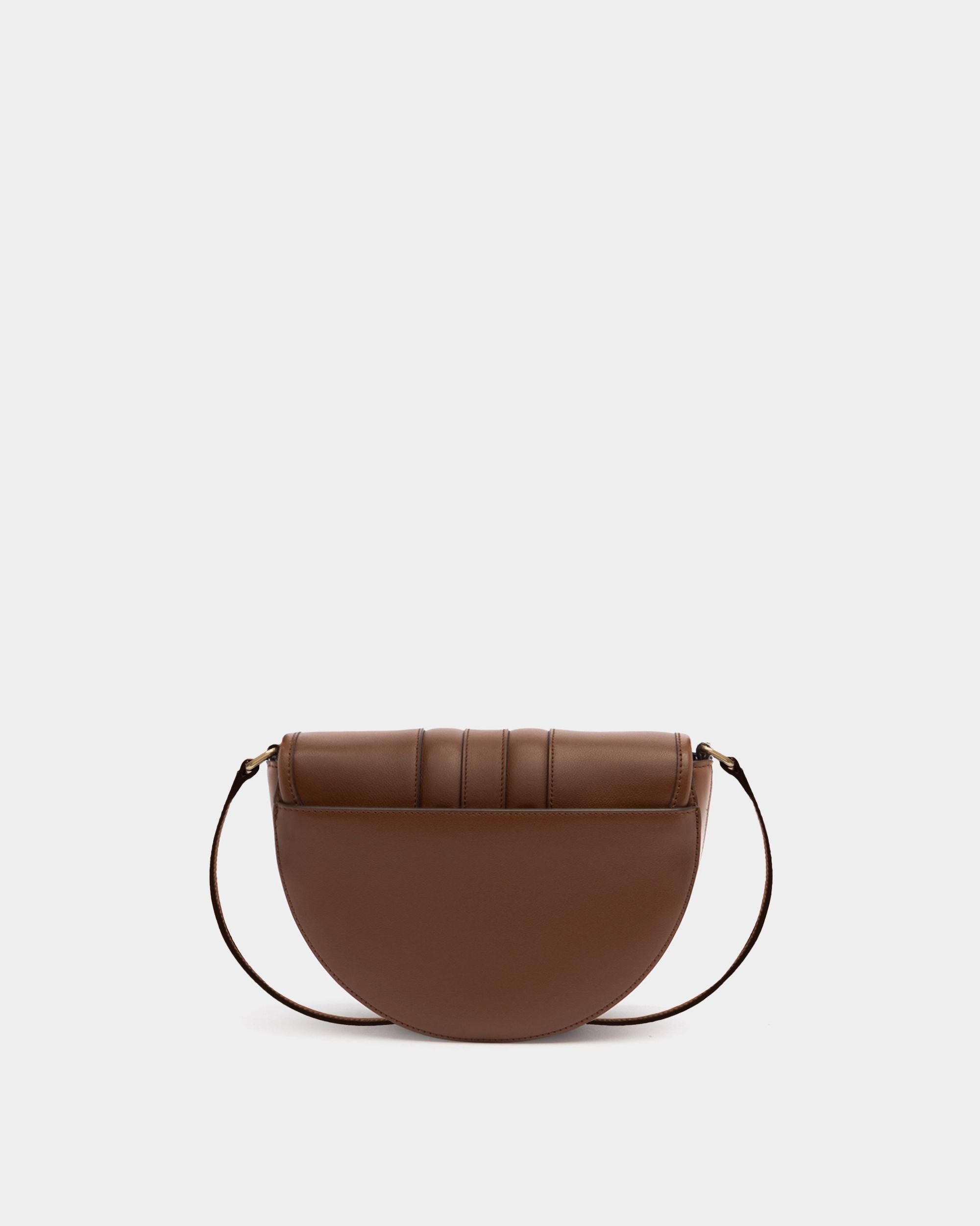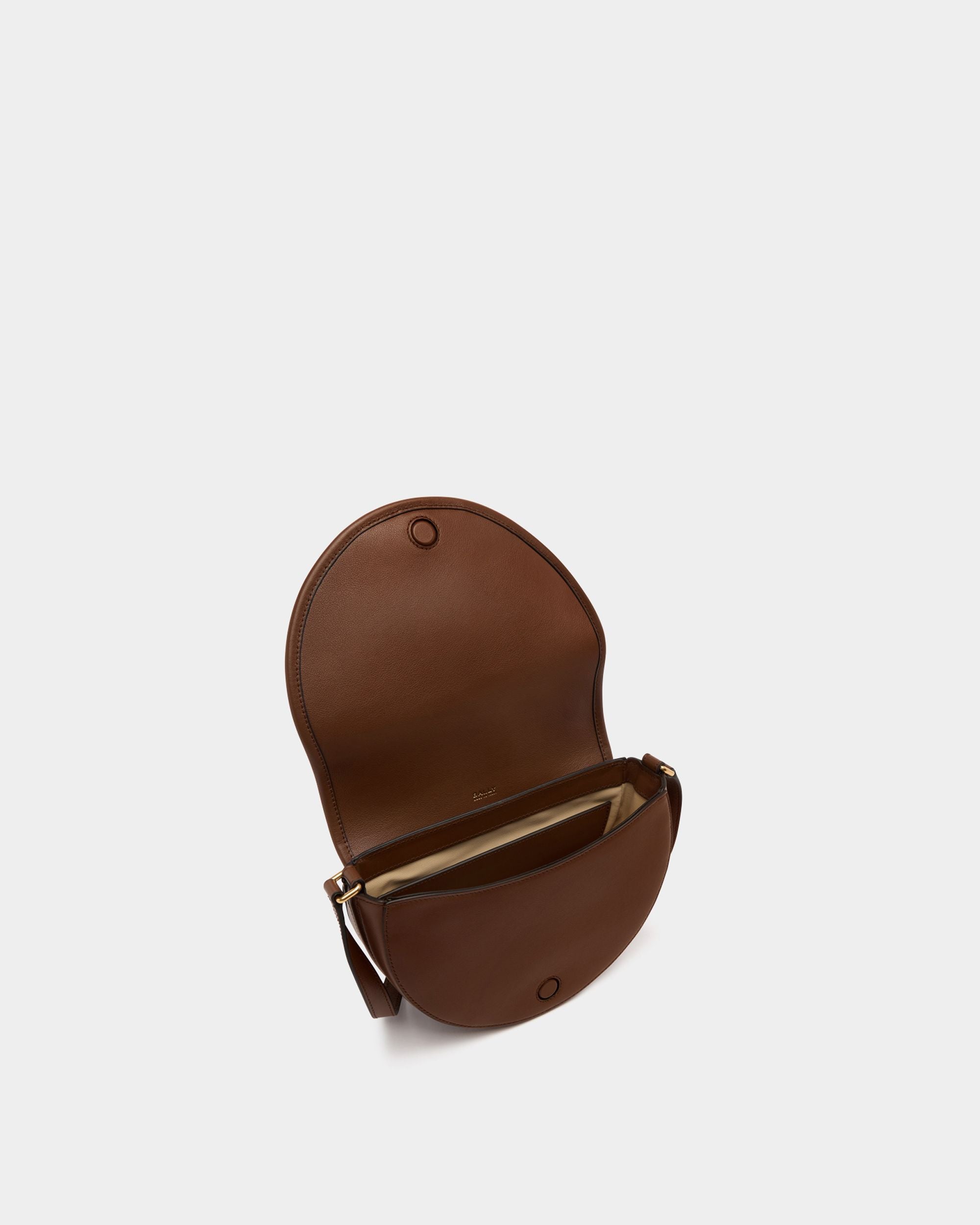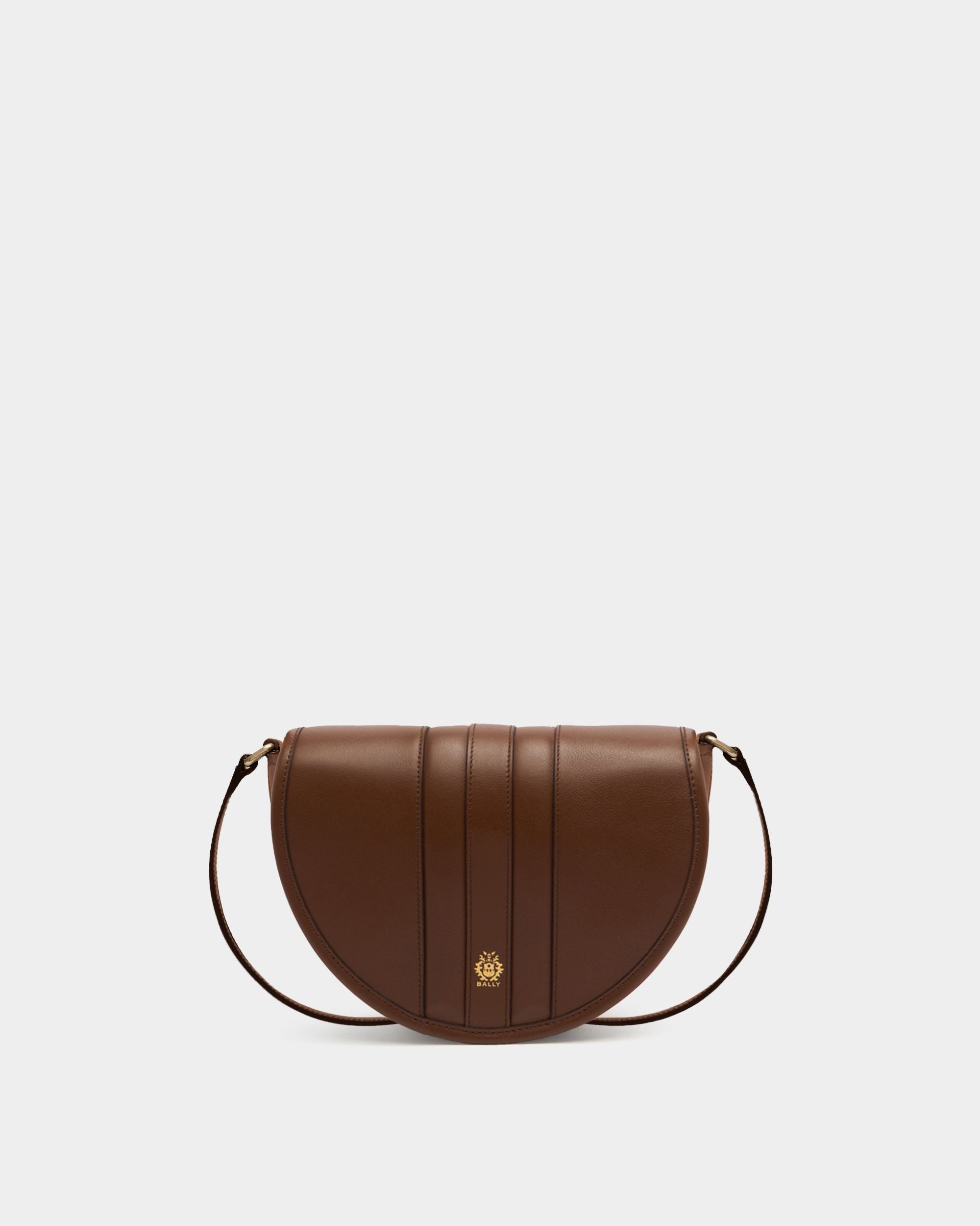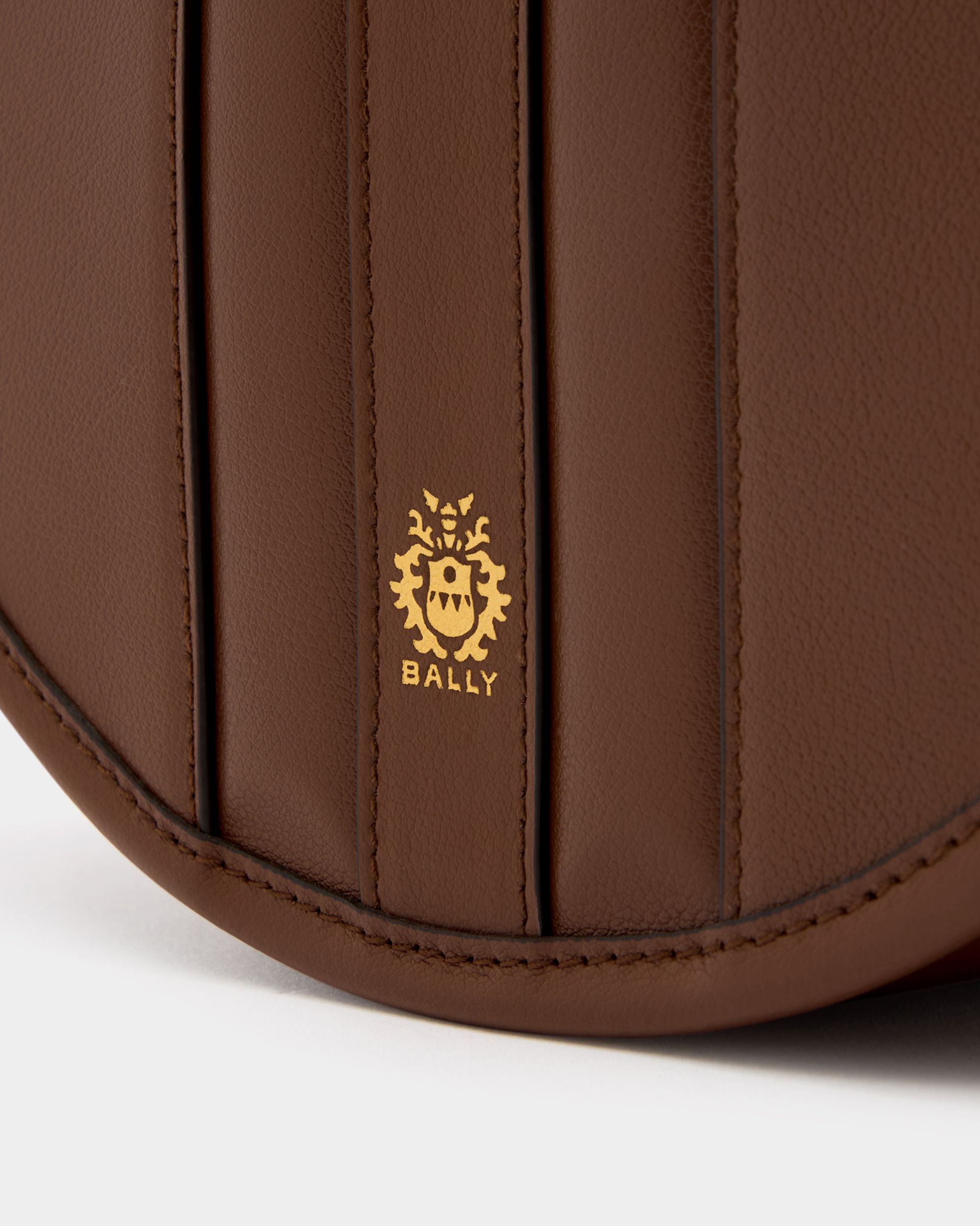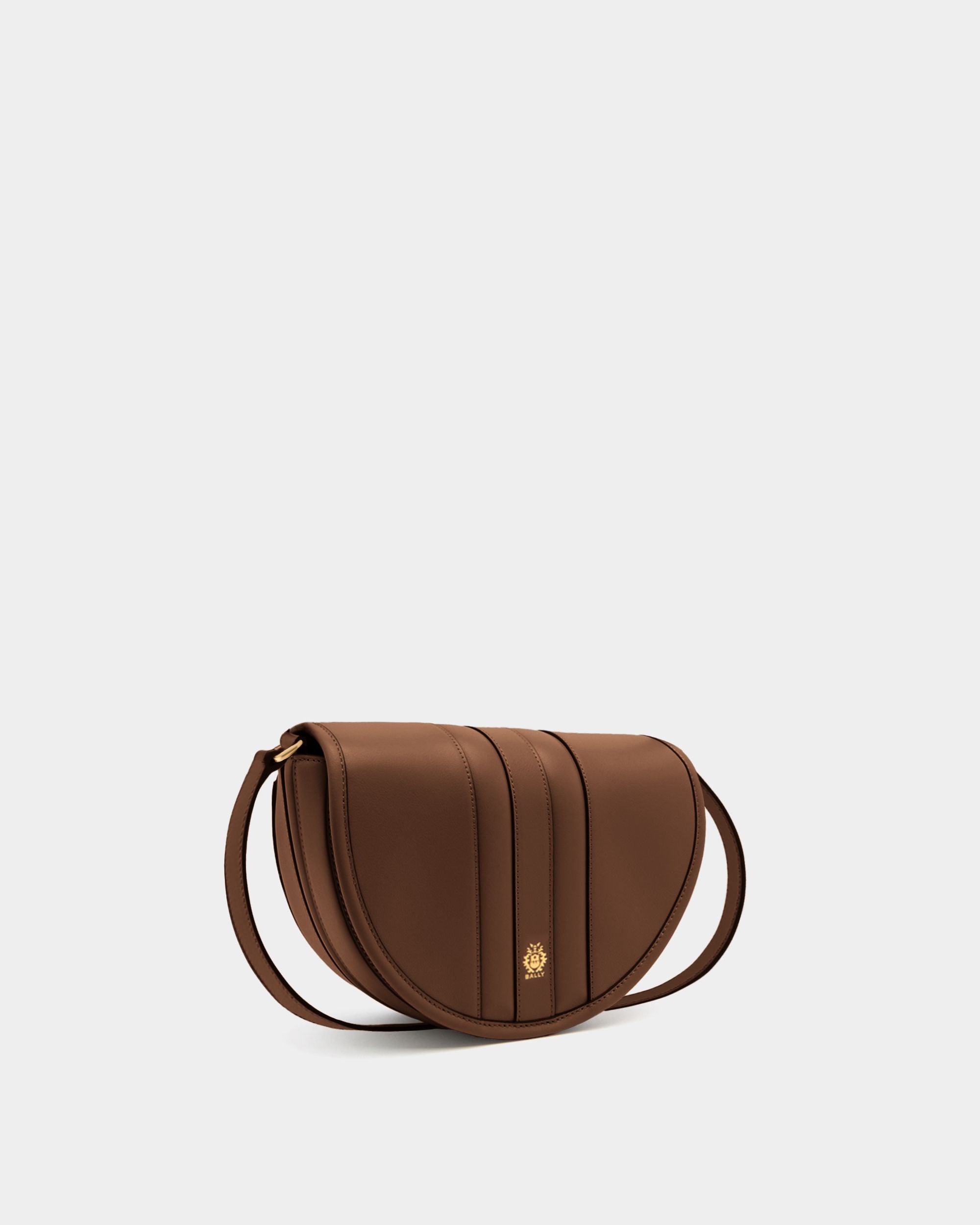 This Signature crossbody bag in brown calfskin has a modern half-circle silhouette enriched with a leather inlay Bally Ribbon and a gold-tone Crest to the front.