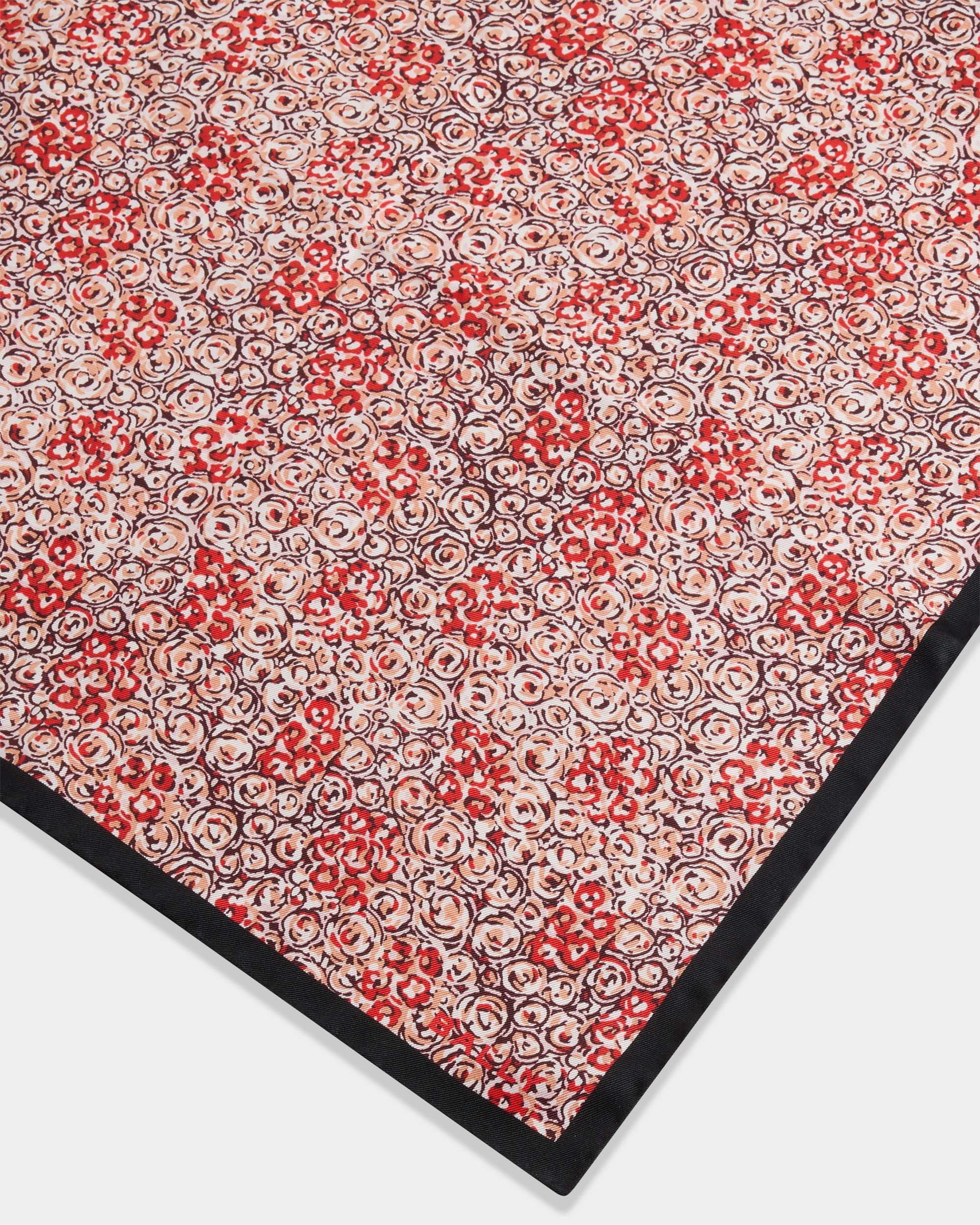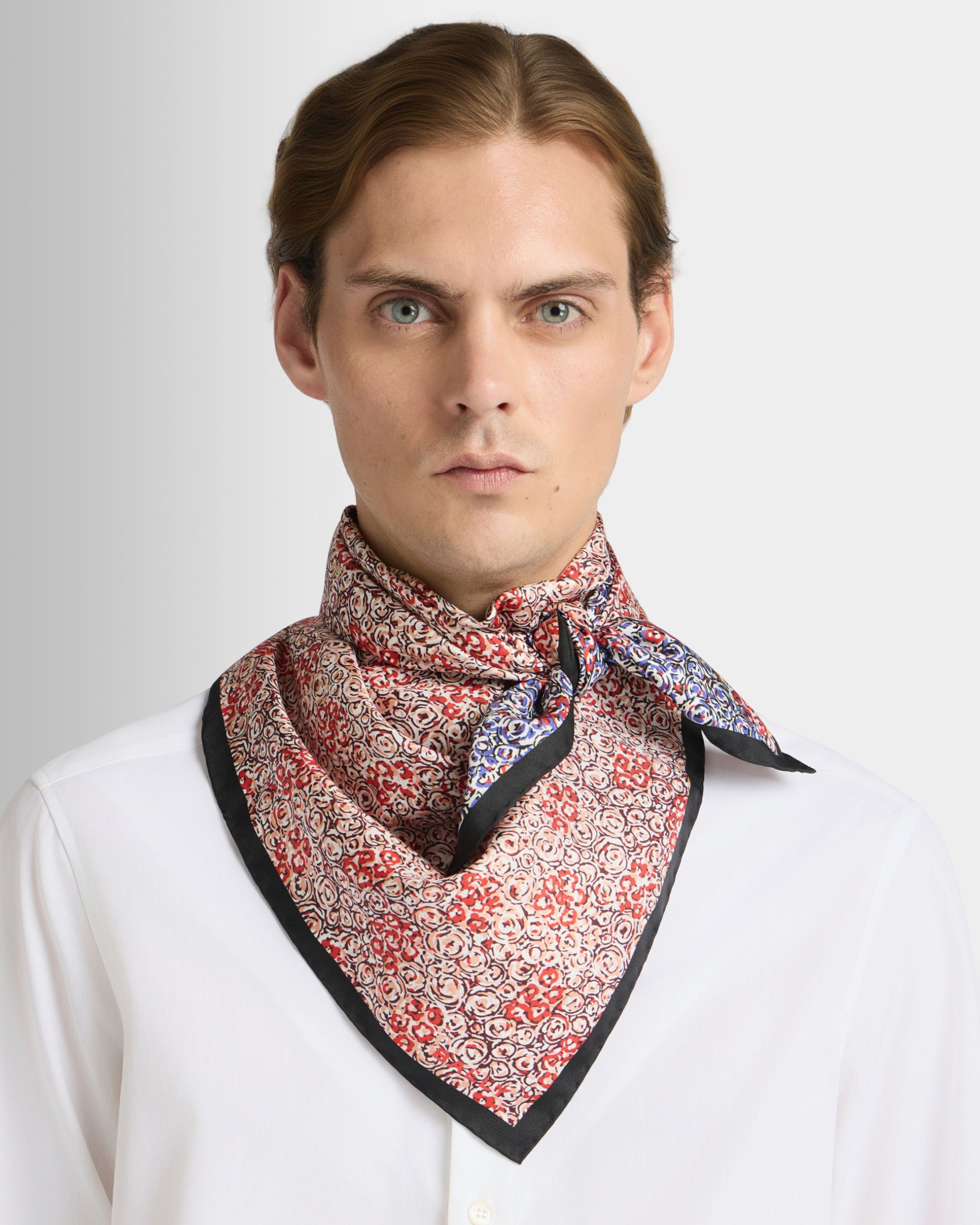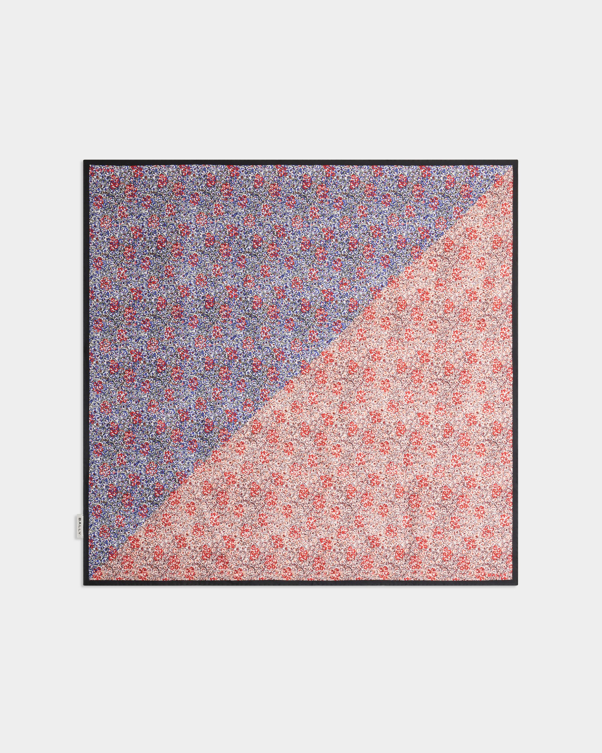 A floral motif in two different colorways extends across the surface of this scarf in fine silk twill.