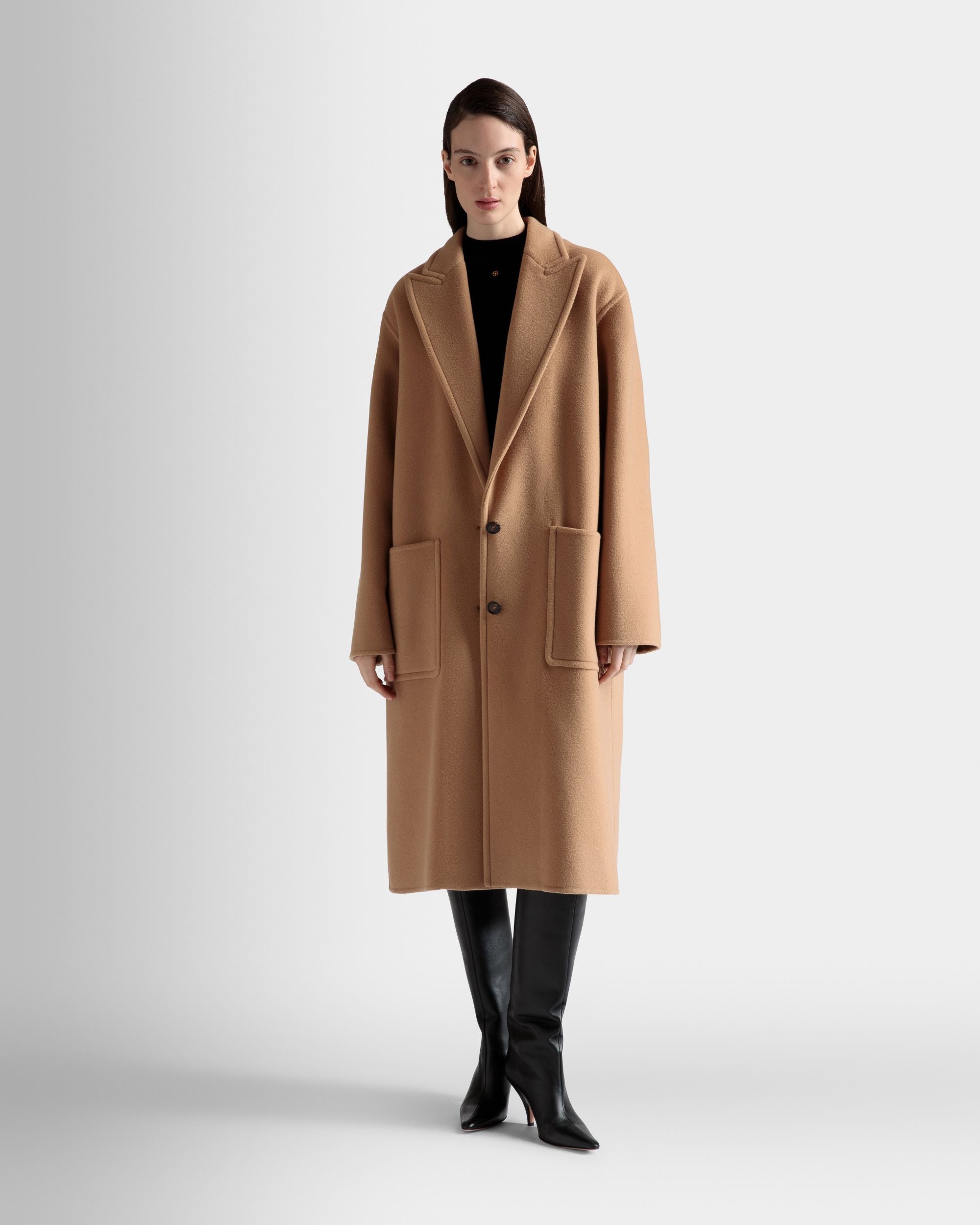 A luxurious outerwear staple. this camel-hued single-breasted coat is relaxed in fit. with oversized front pockets. two buttons. and a large collar.