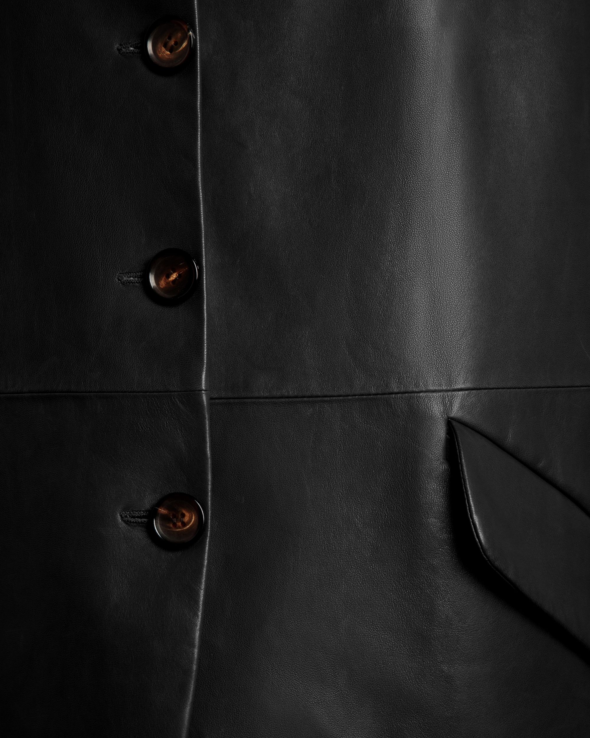 This midi-length coat is crafted with precision in soft. supple leather. The single-breasted front is fastened by horn buttons. extending into rounded edges along the hemline. Slant flap pockets are seen to the sides.