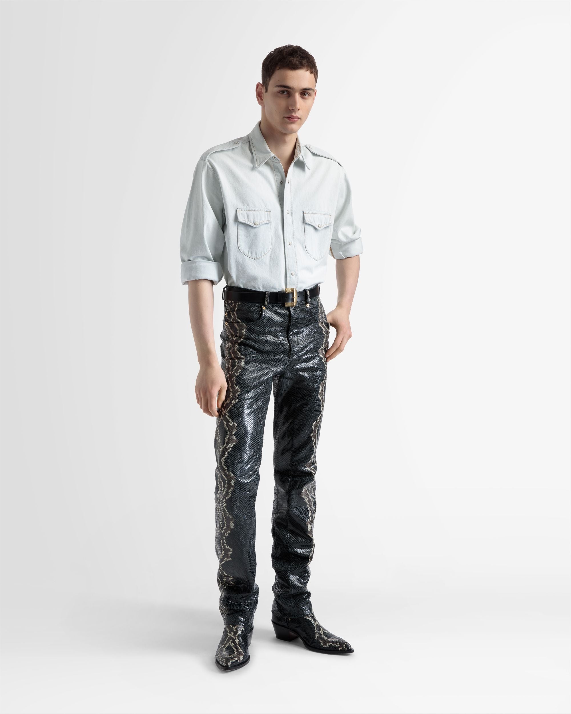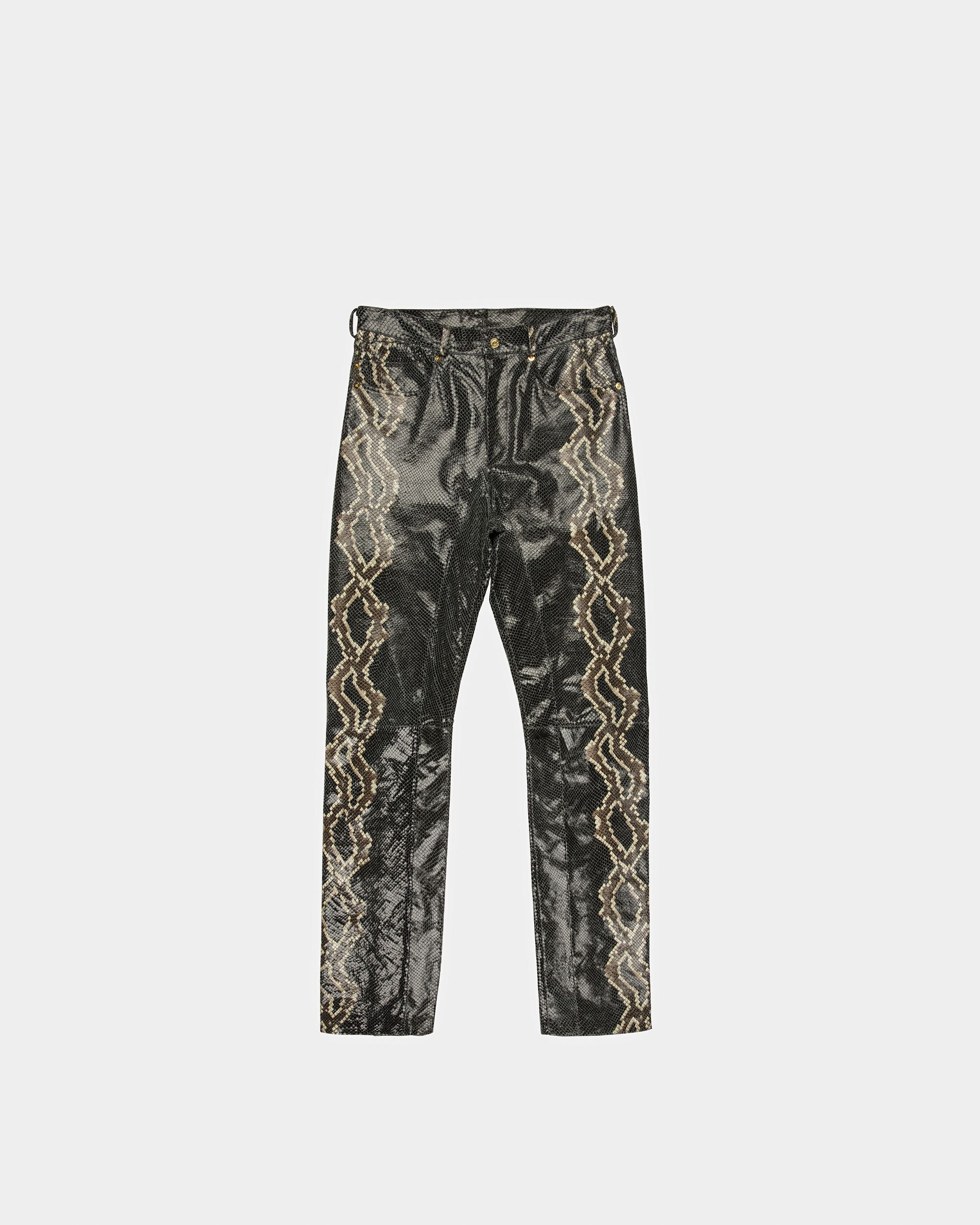Shaped to a straight leg. these pants are seen in a python effect printed leather. cleverly dyed to emulate scales.