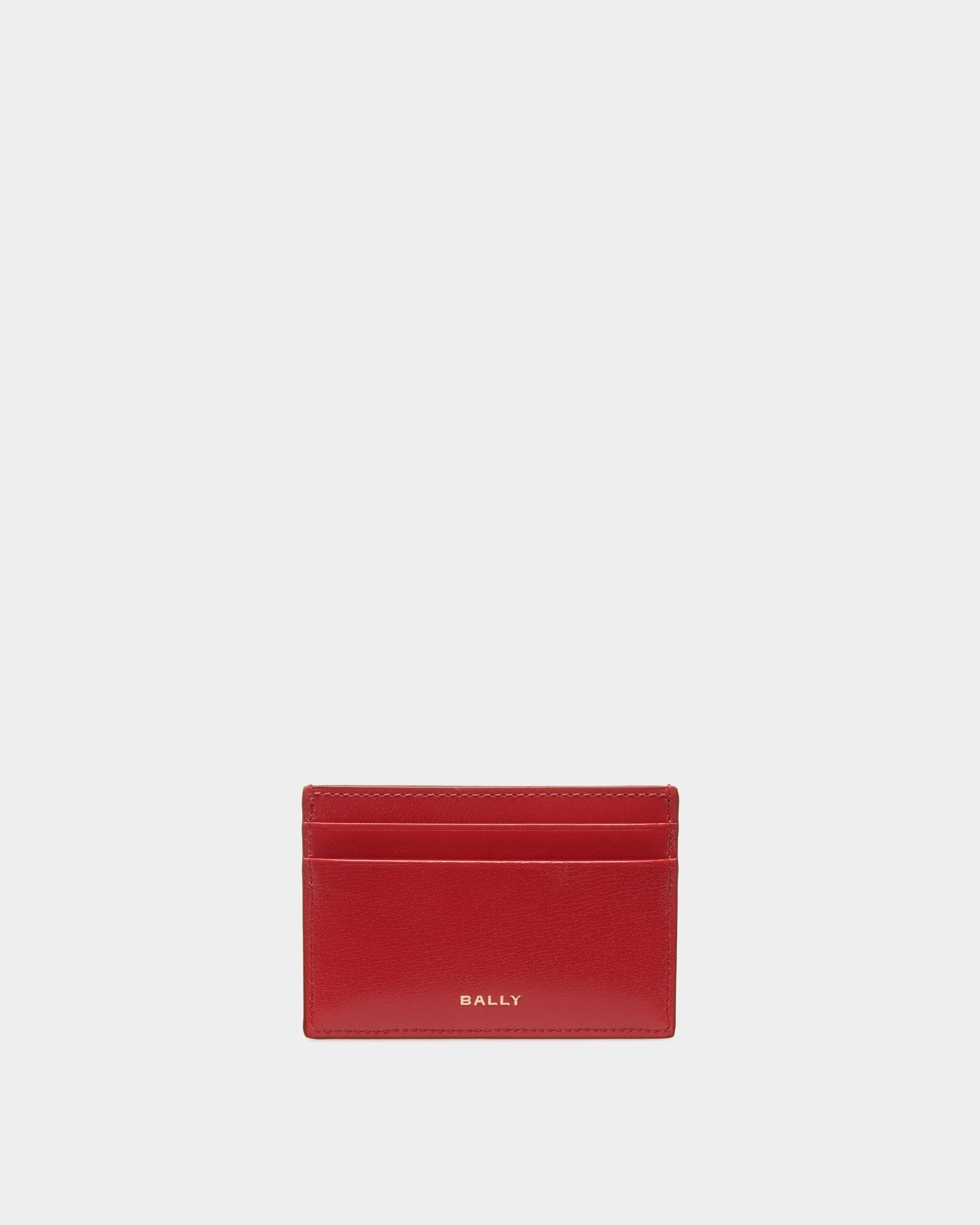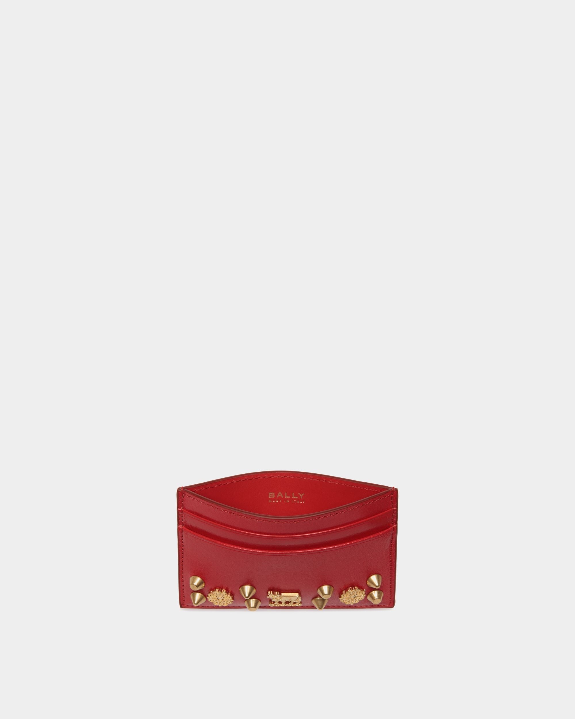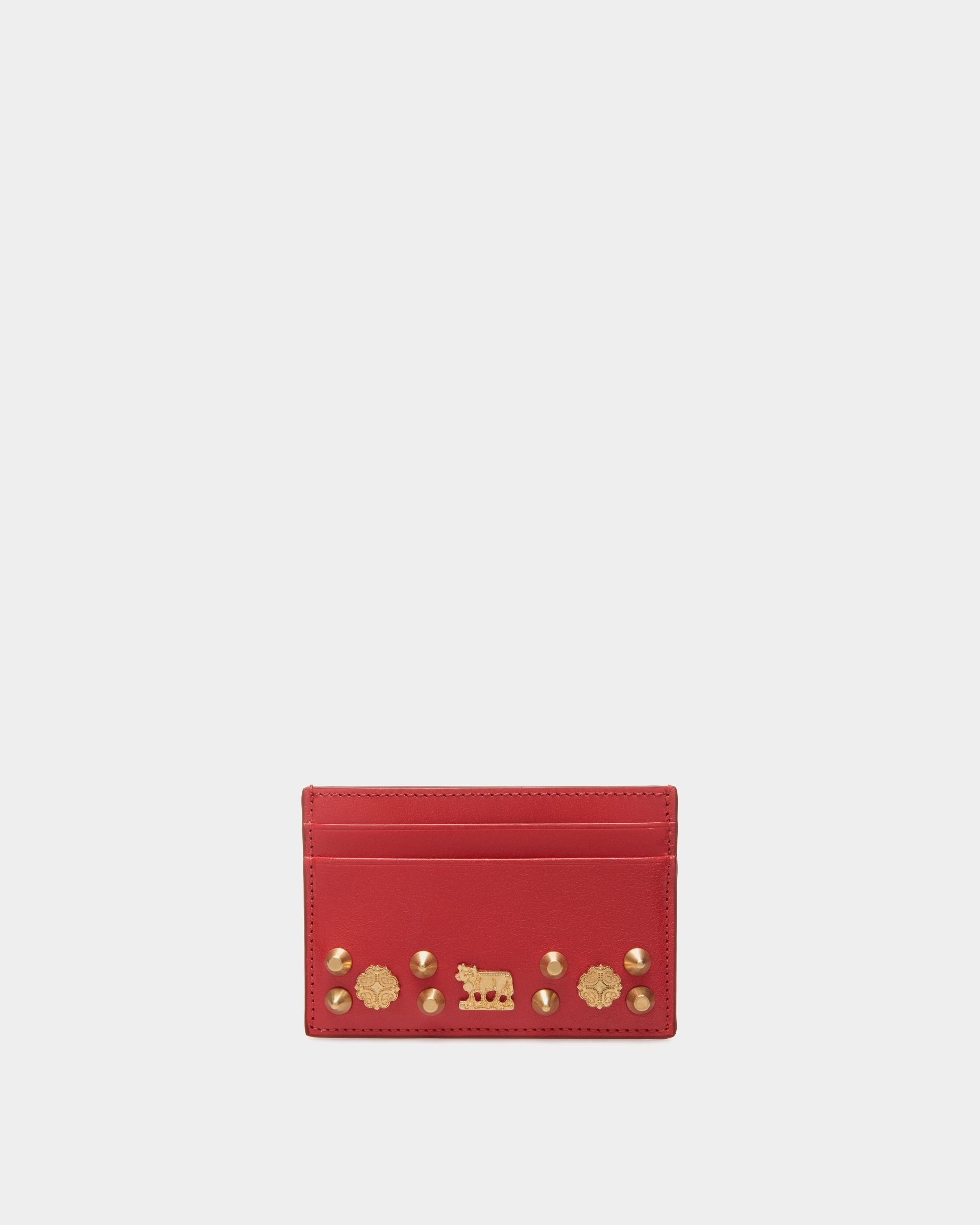 This Swissness card holder in red craquelure leather is embellished by gold-tone metal studs along the lower front. A foil logo finishes the reverse.