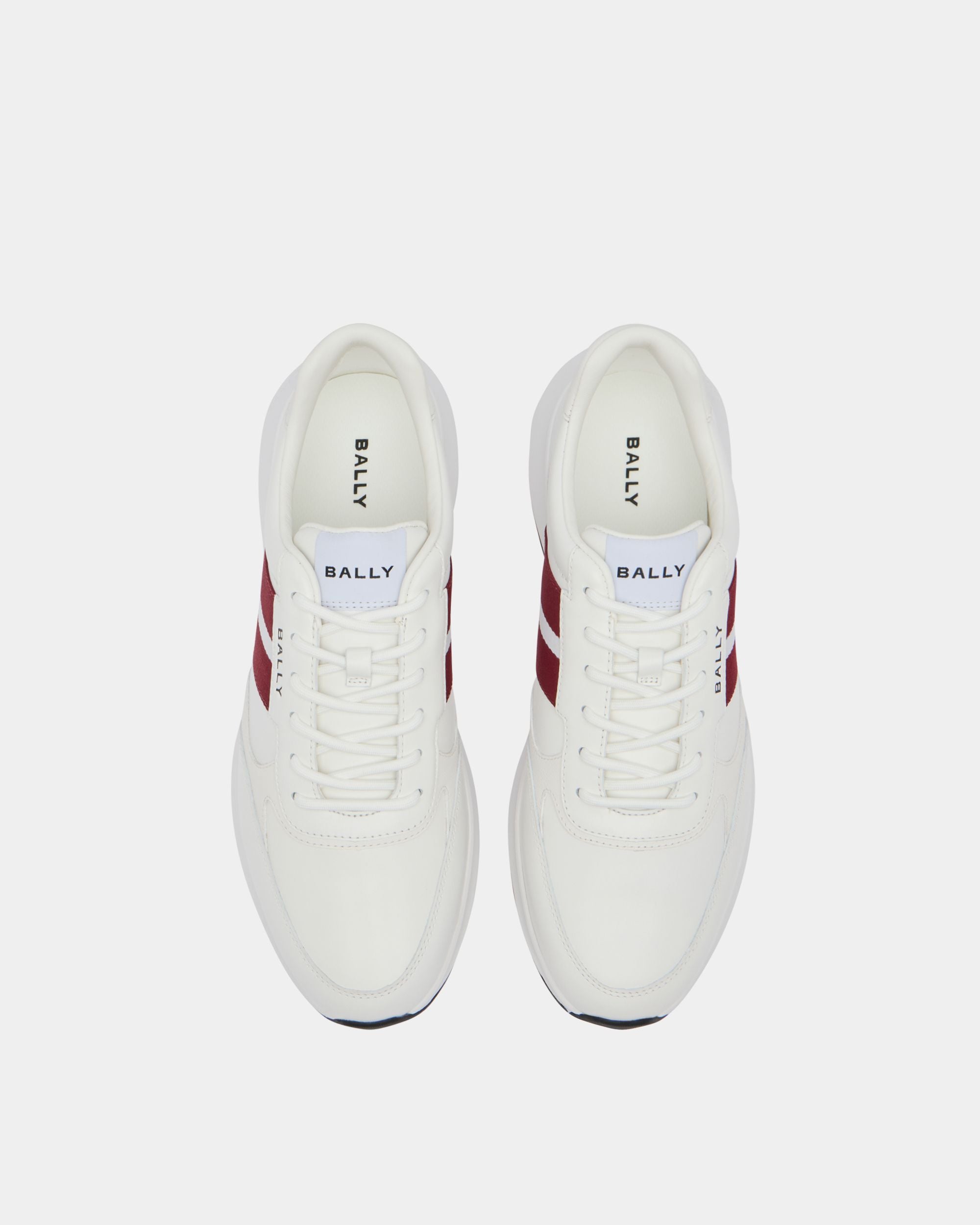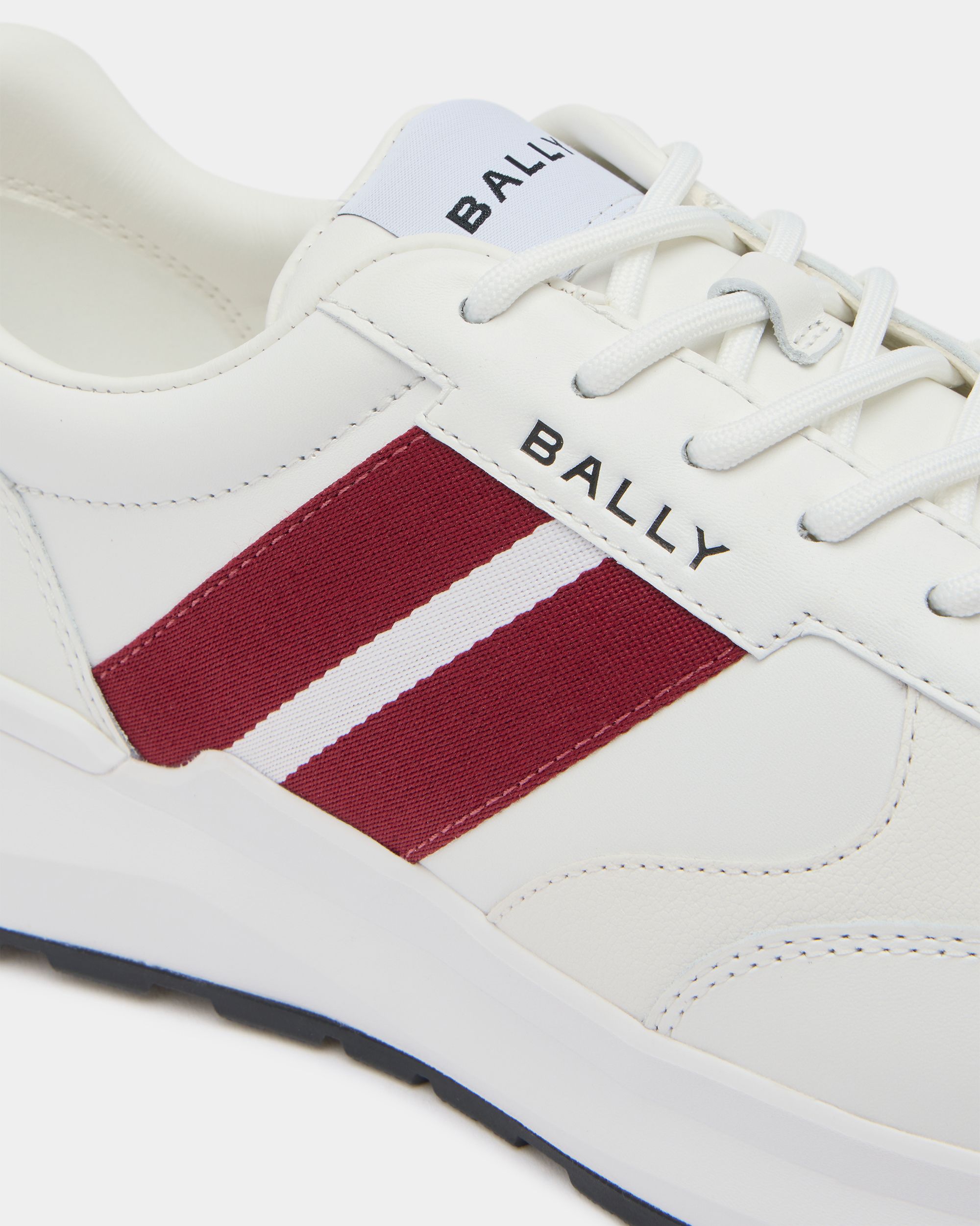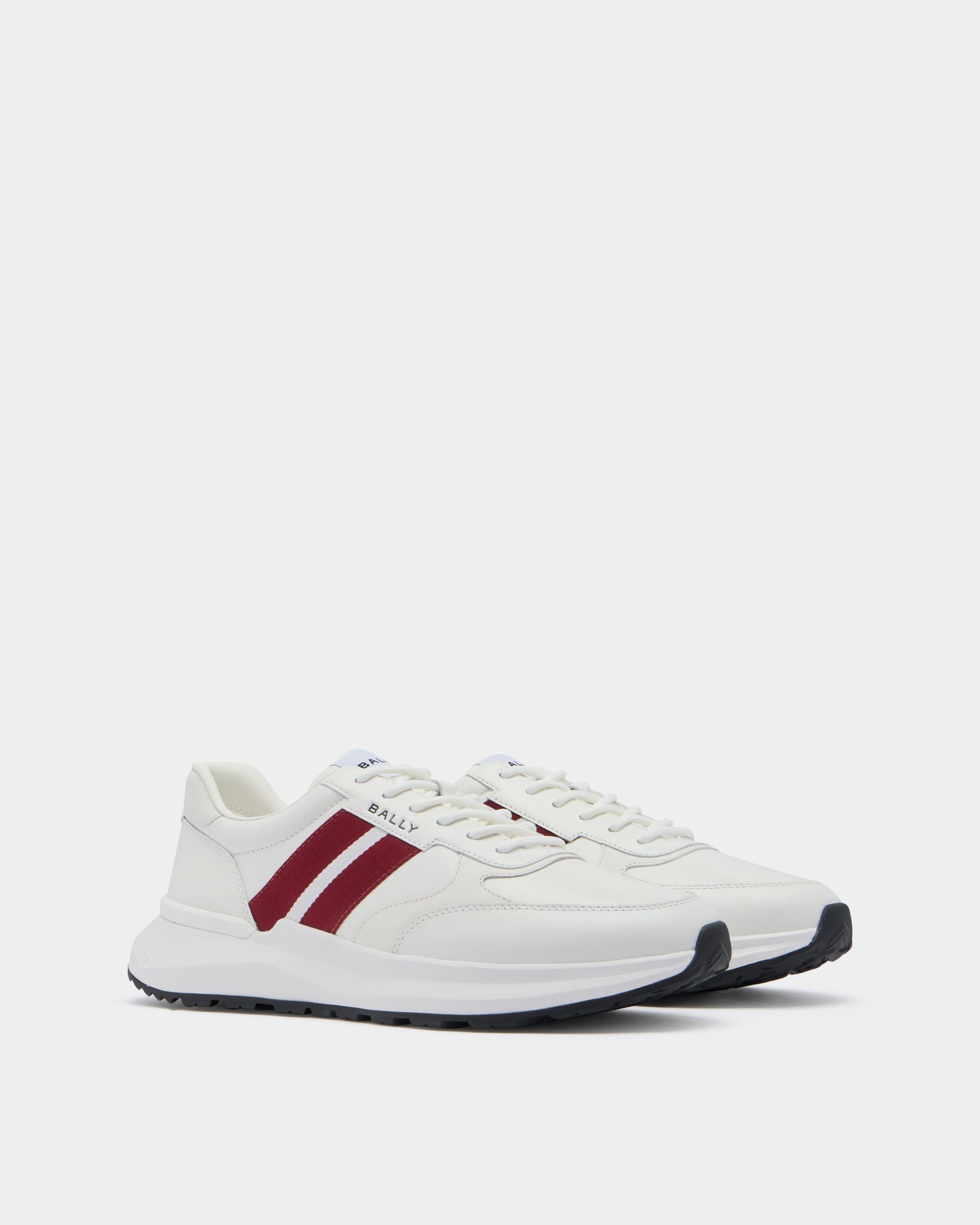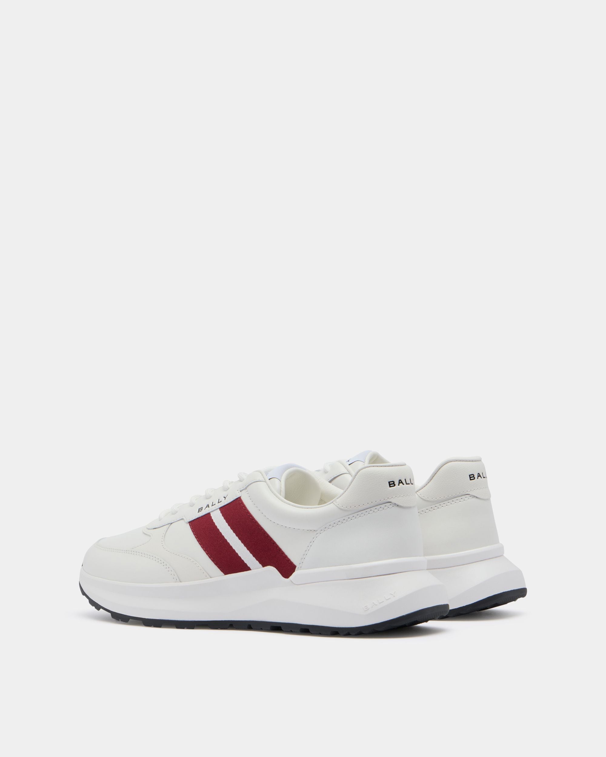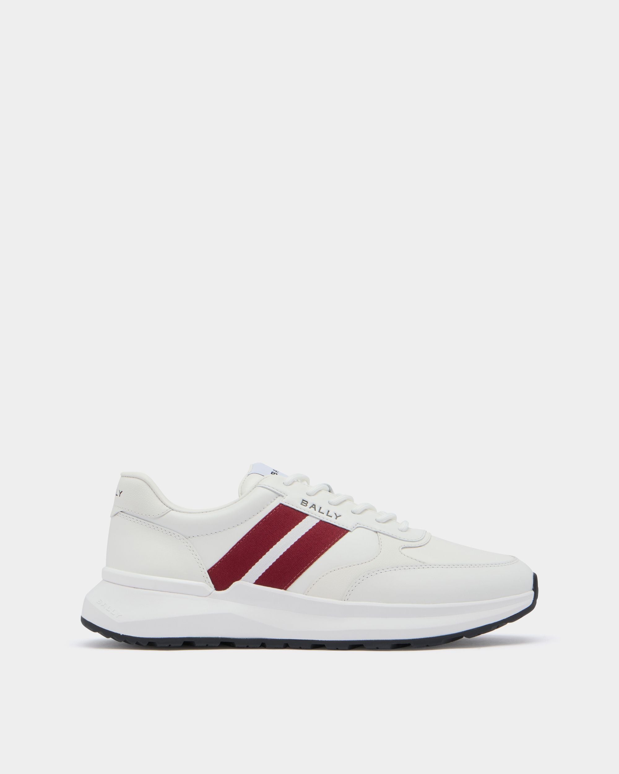 The Sylen sneaker has a sleek upper in white leather with a red and white Bally Ribbon to the side. The rubber sole is inspired by running styles and features high-grip tread on the outsole.