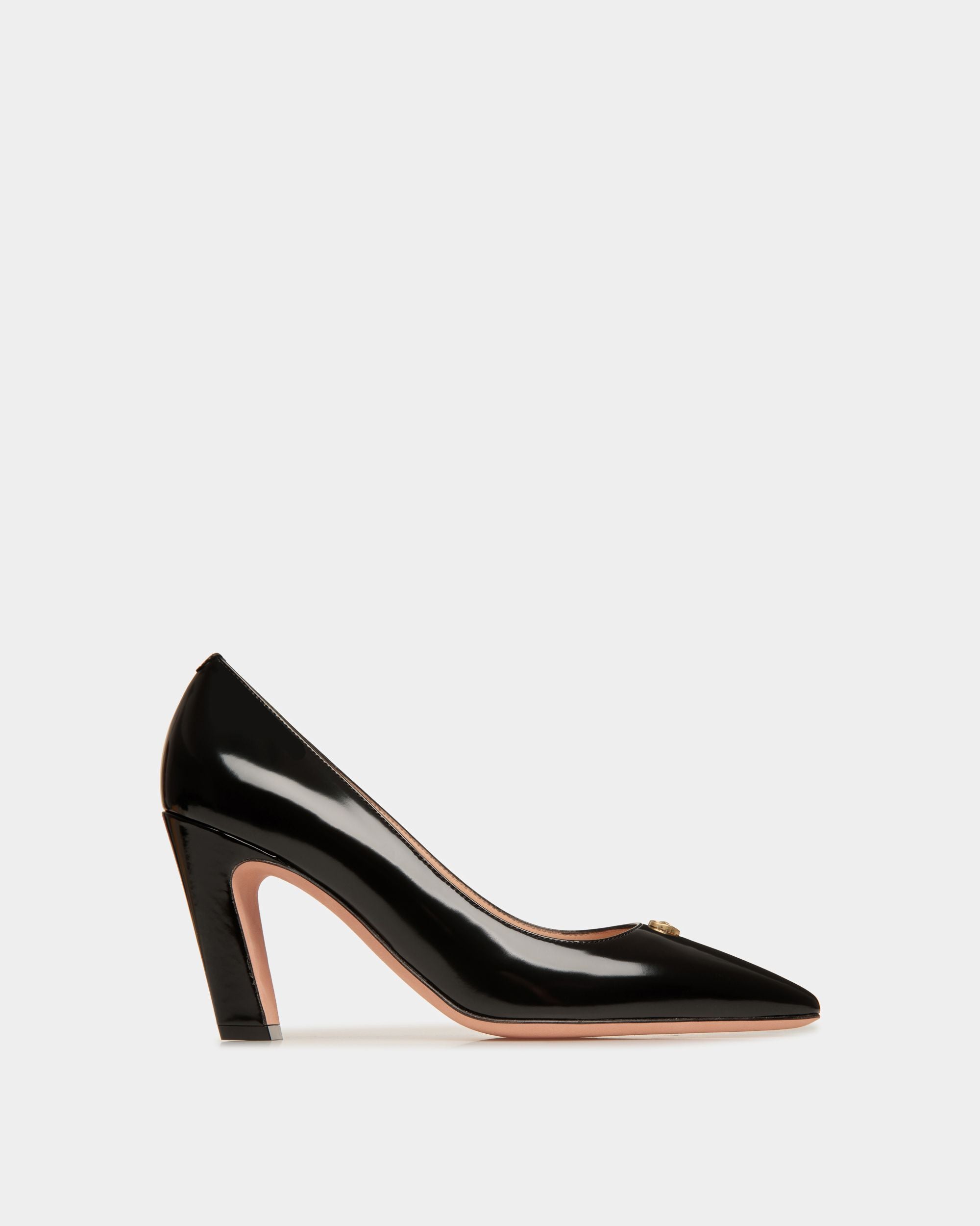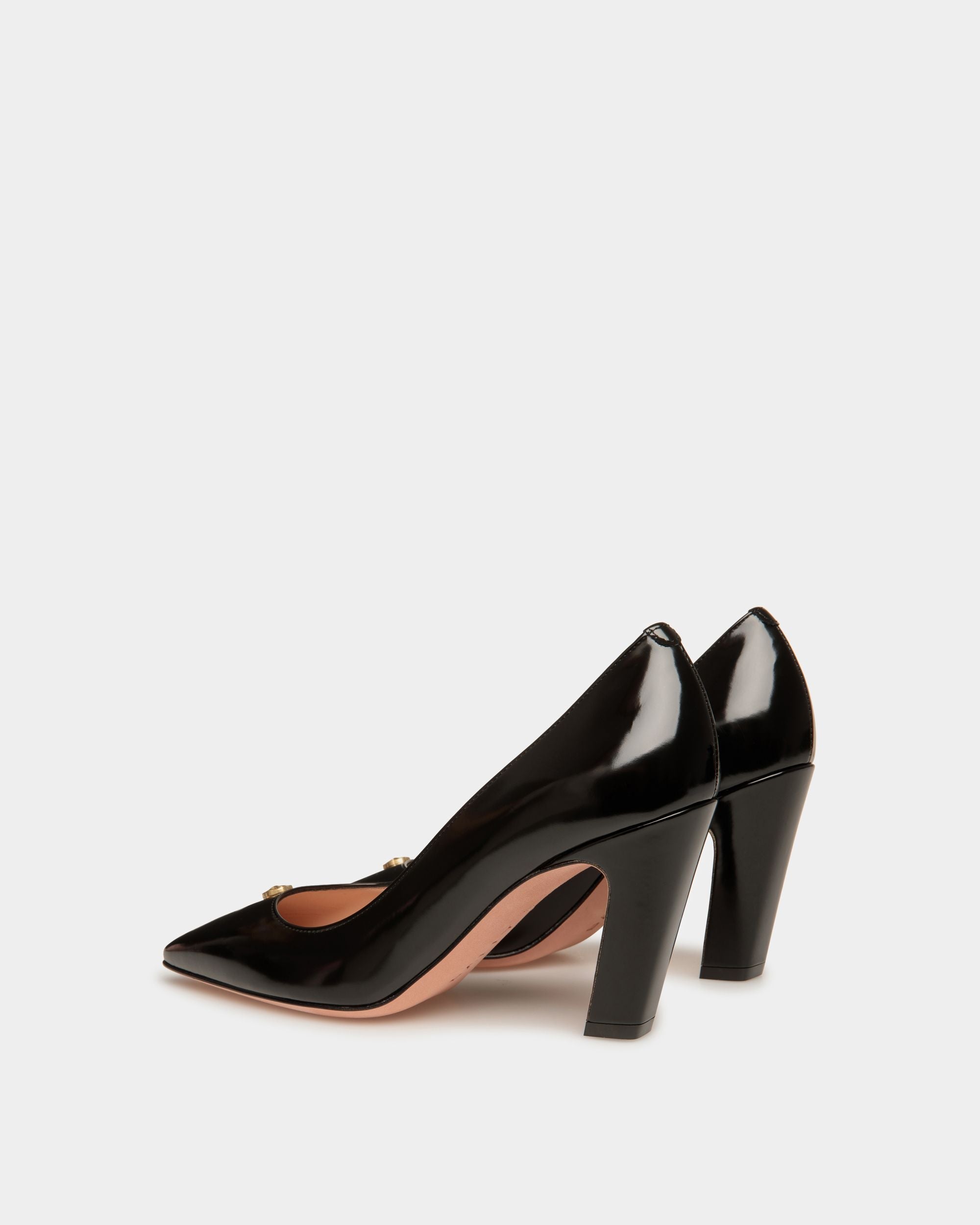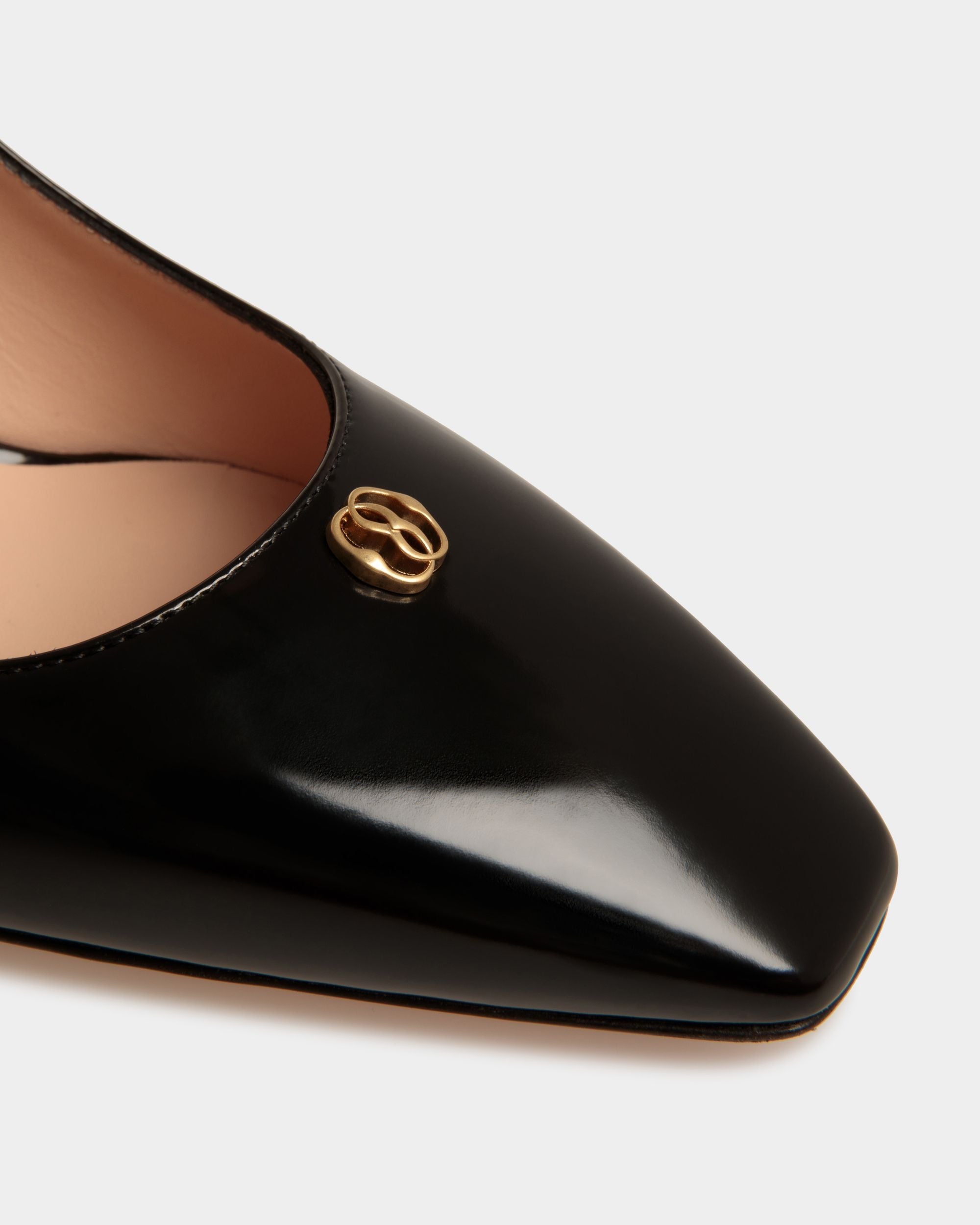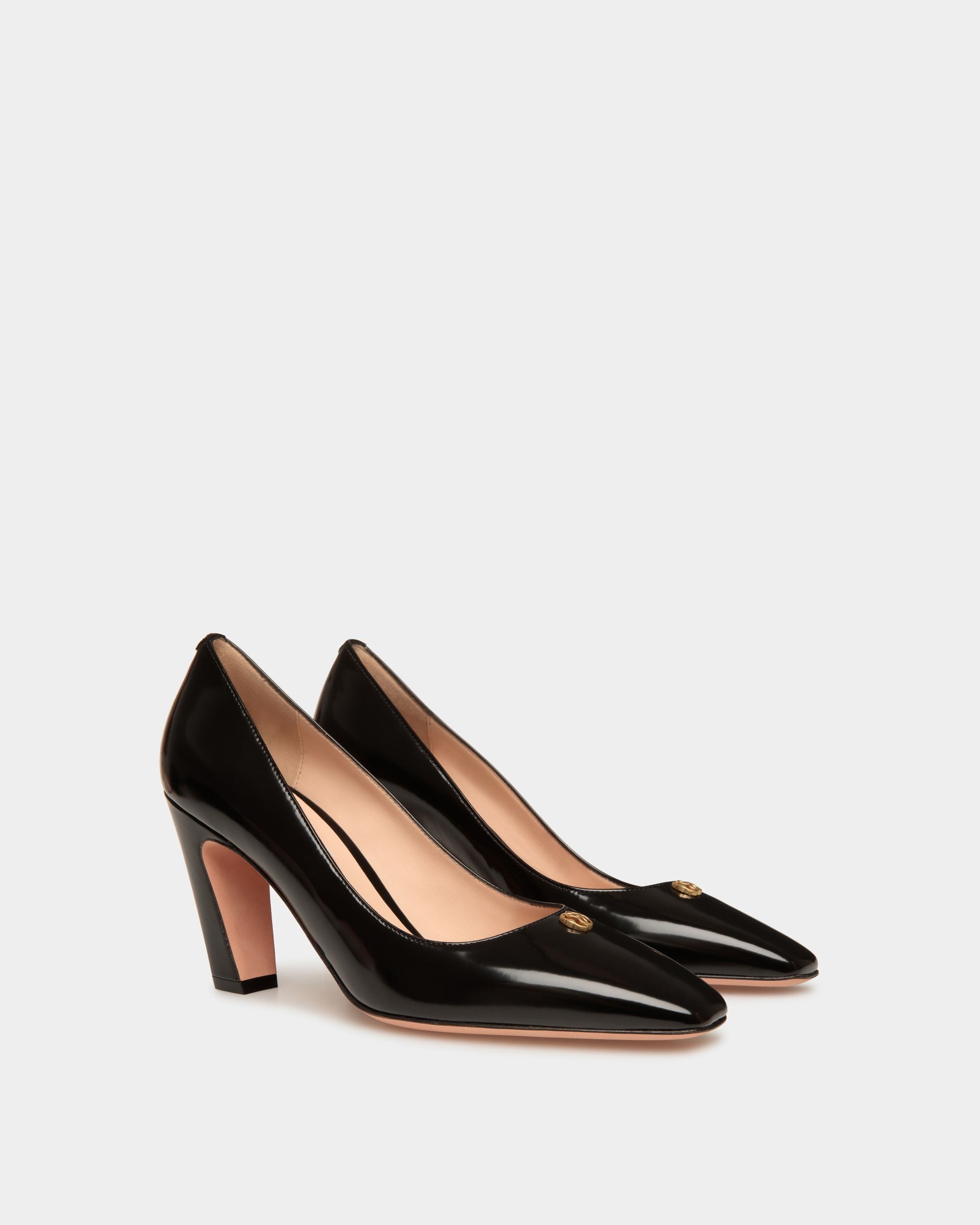Made with Bally’s exacting attention to detail. these black brushed leather pumps are trimmed by a delicate Emblem detail in gold-tone metal. The block heel is set at an angle for a sleek sense of movement.