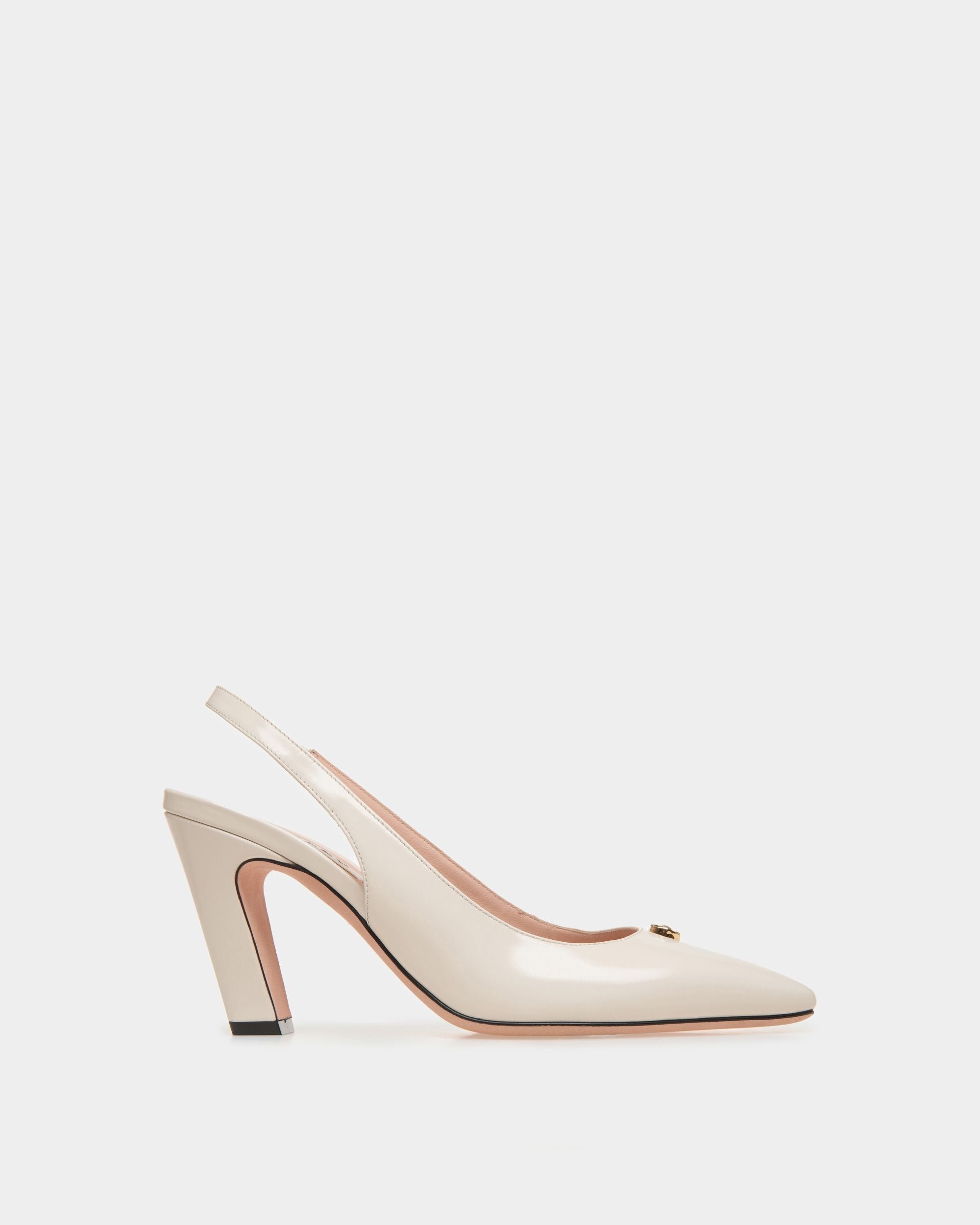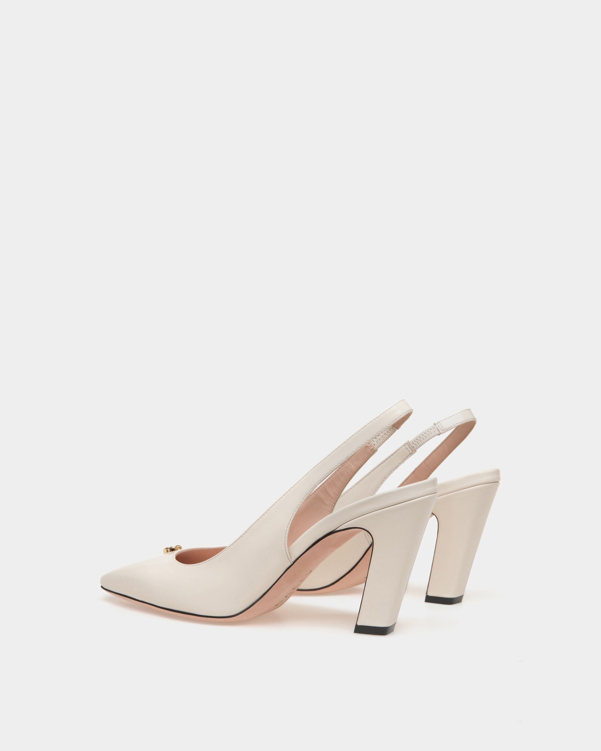 Impeccably designed. these pumps in white leather exude sophistication. With a stacked heel and a timeless slingback silhouette. they effortlessly combine elegance and comfort for any occasion.