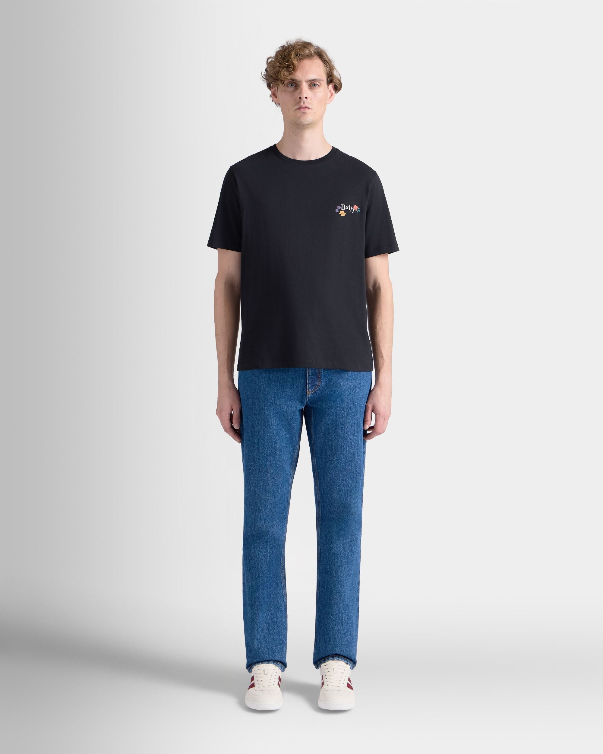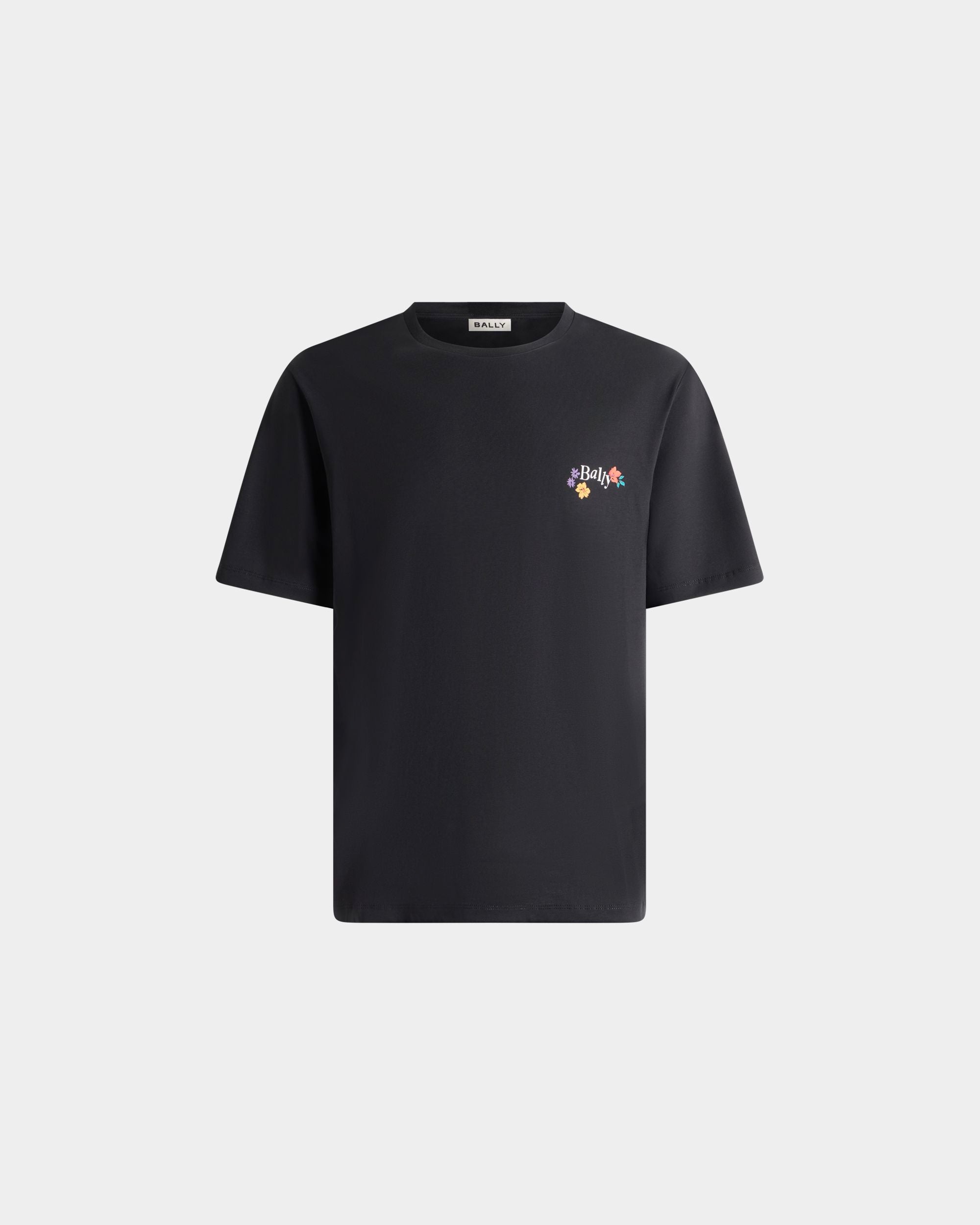 This black cotton t-shirt is enriched with a Bally logo and colorful flowers on the left chest. Its classic silhouette features a crewneck collar and short sleeves.