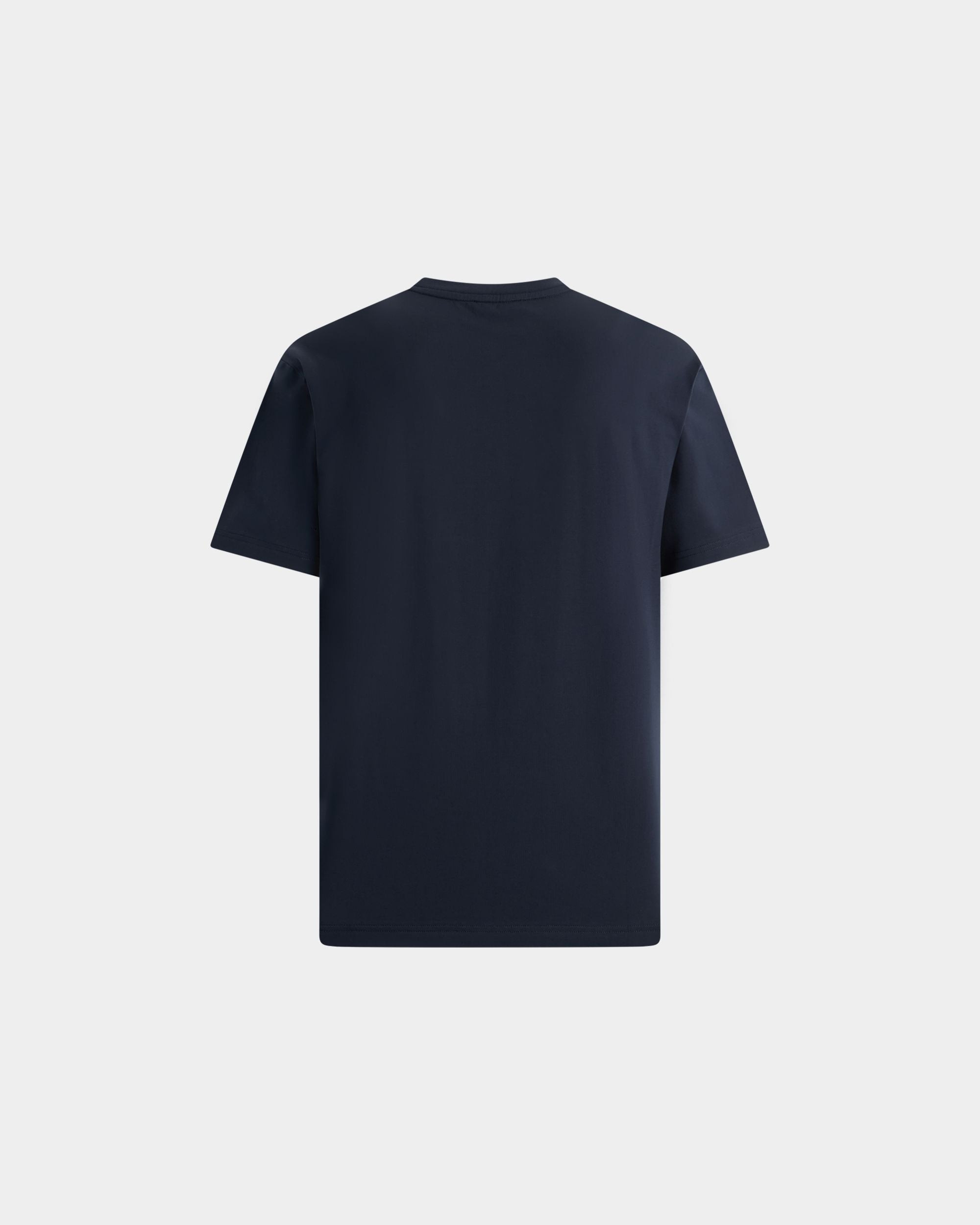This simple navy blue cotton t-shirt is enriched by a glossy Bally logo across the chest. A red and white Ribbon detail is seen to the inside of the crewneck collar.