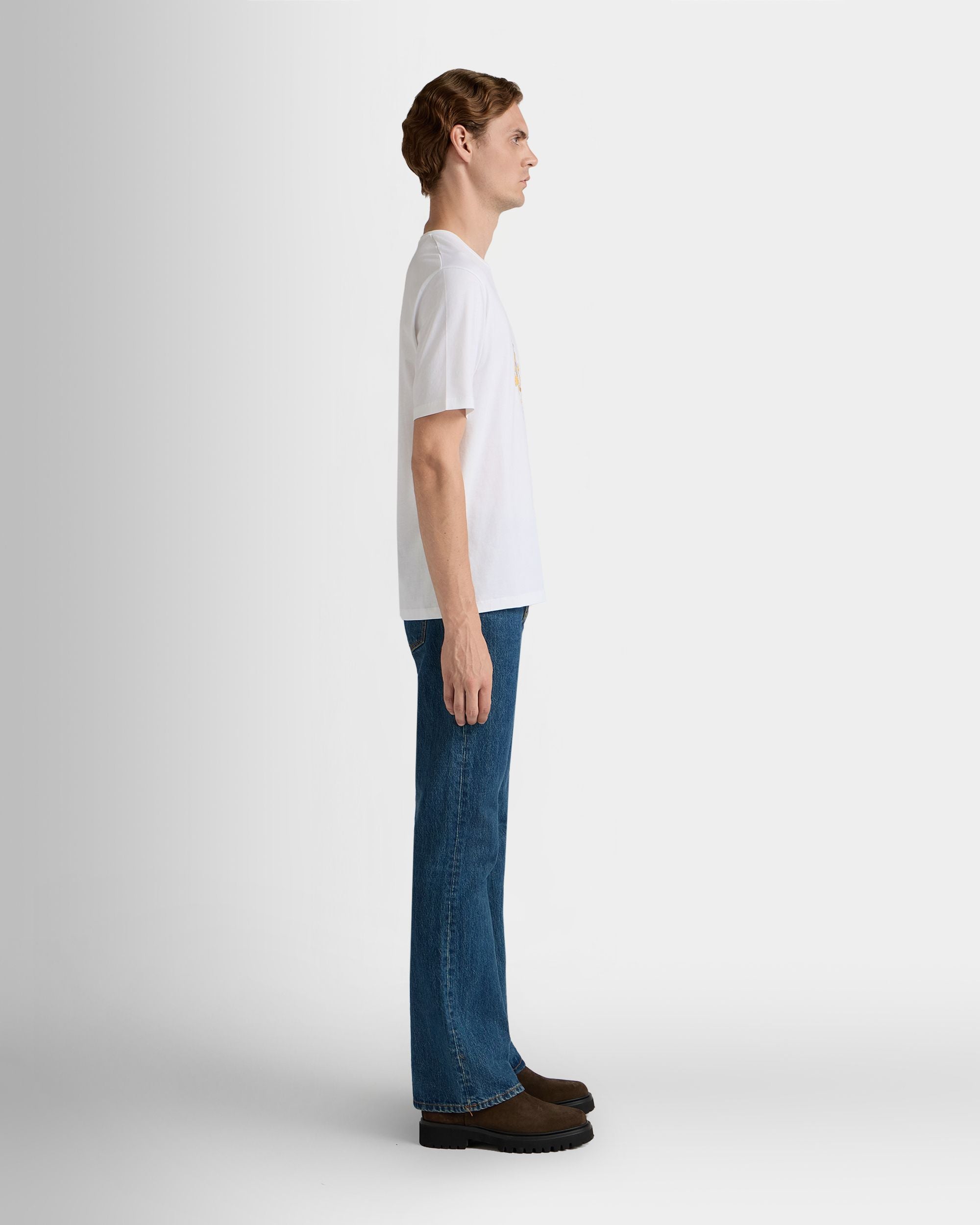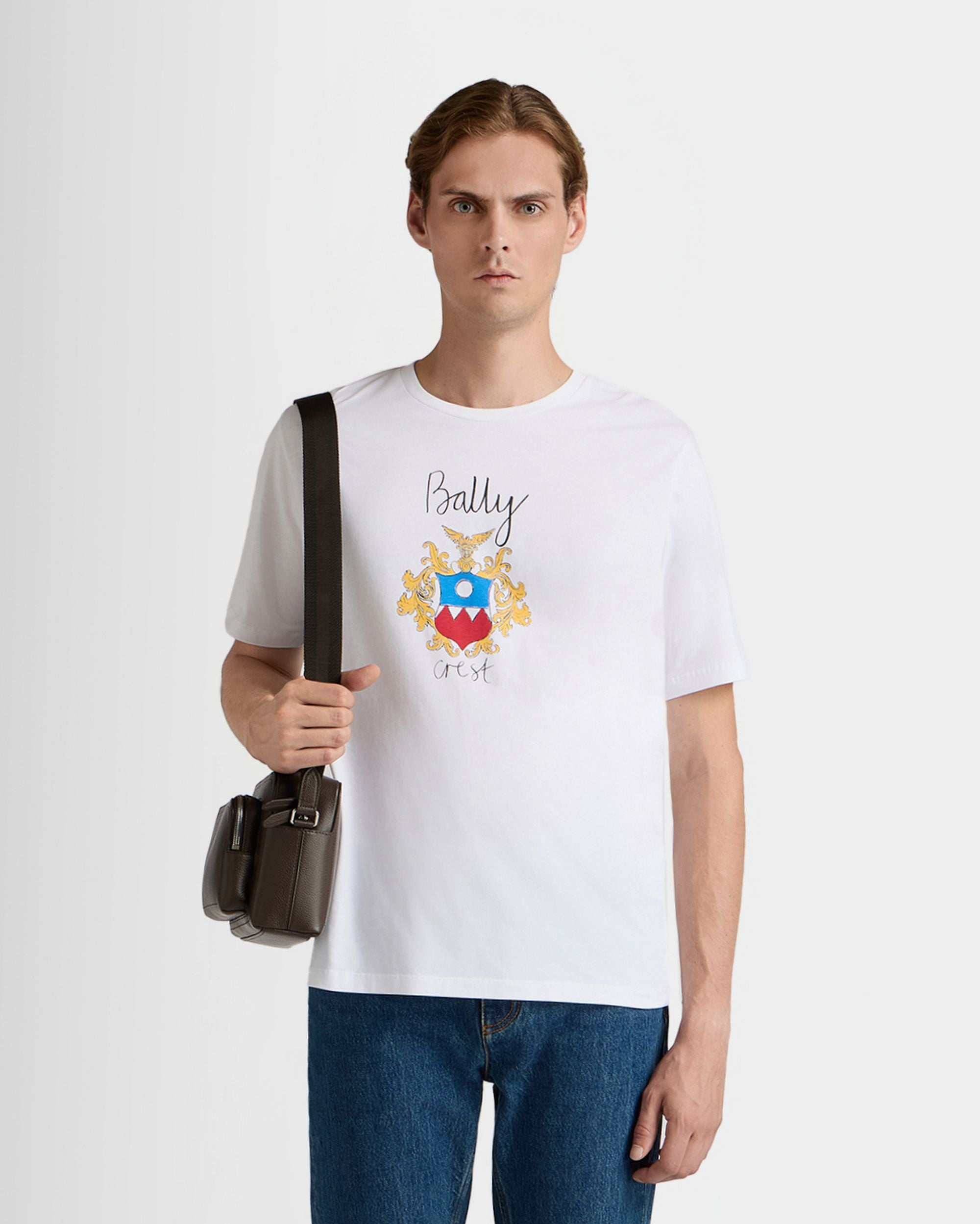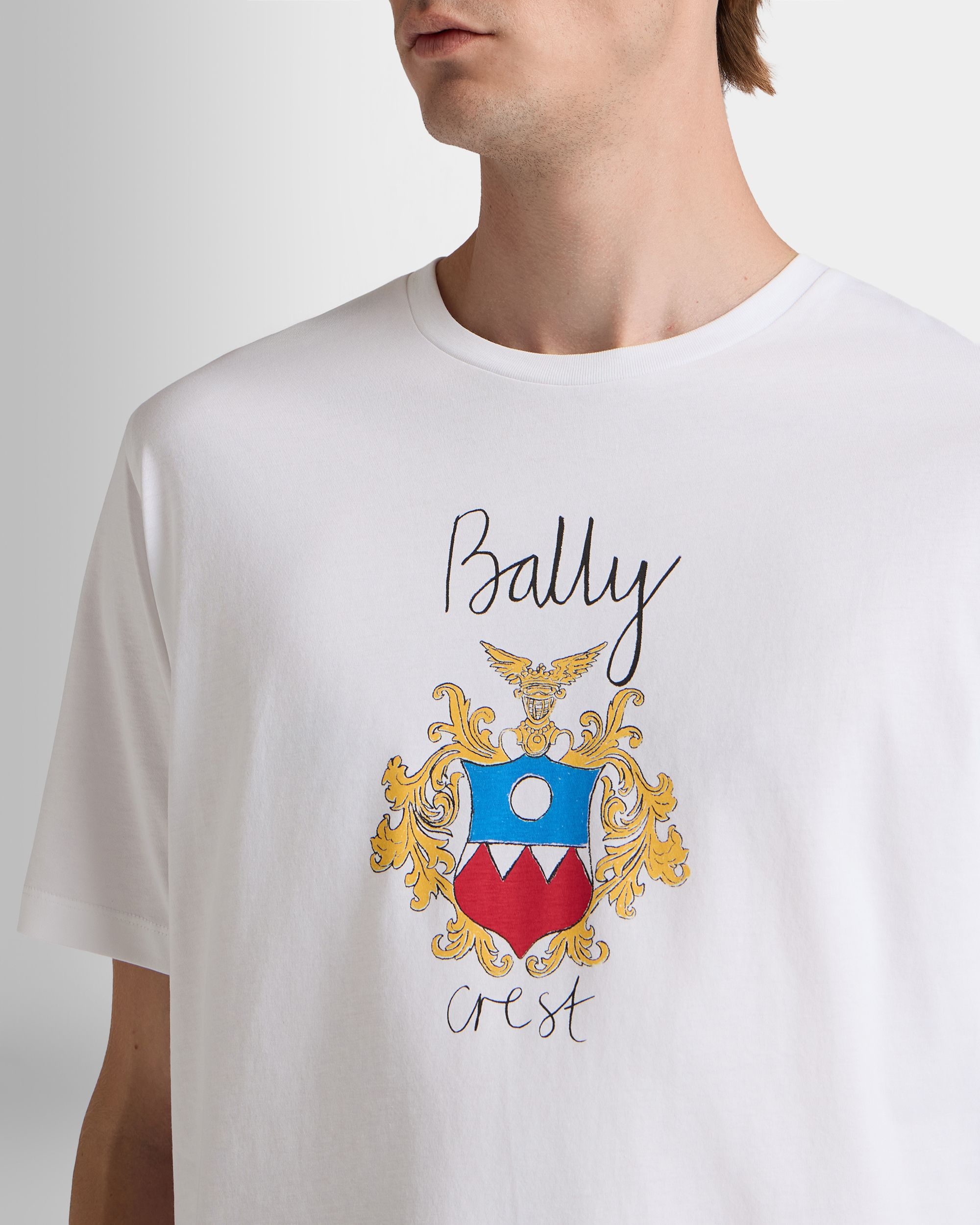 A large sketch of the Bally Crest embellishes the front of this crewneck t-shirt in white cotton.