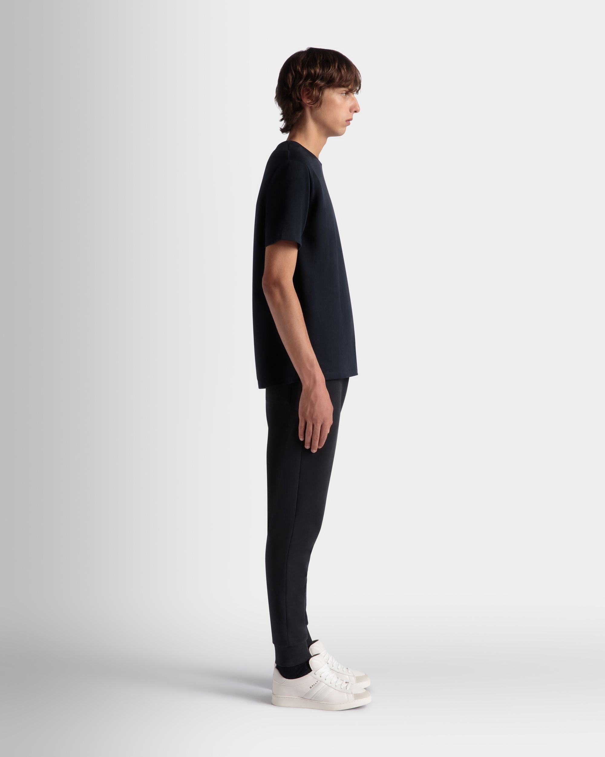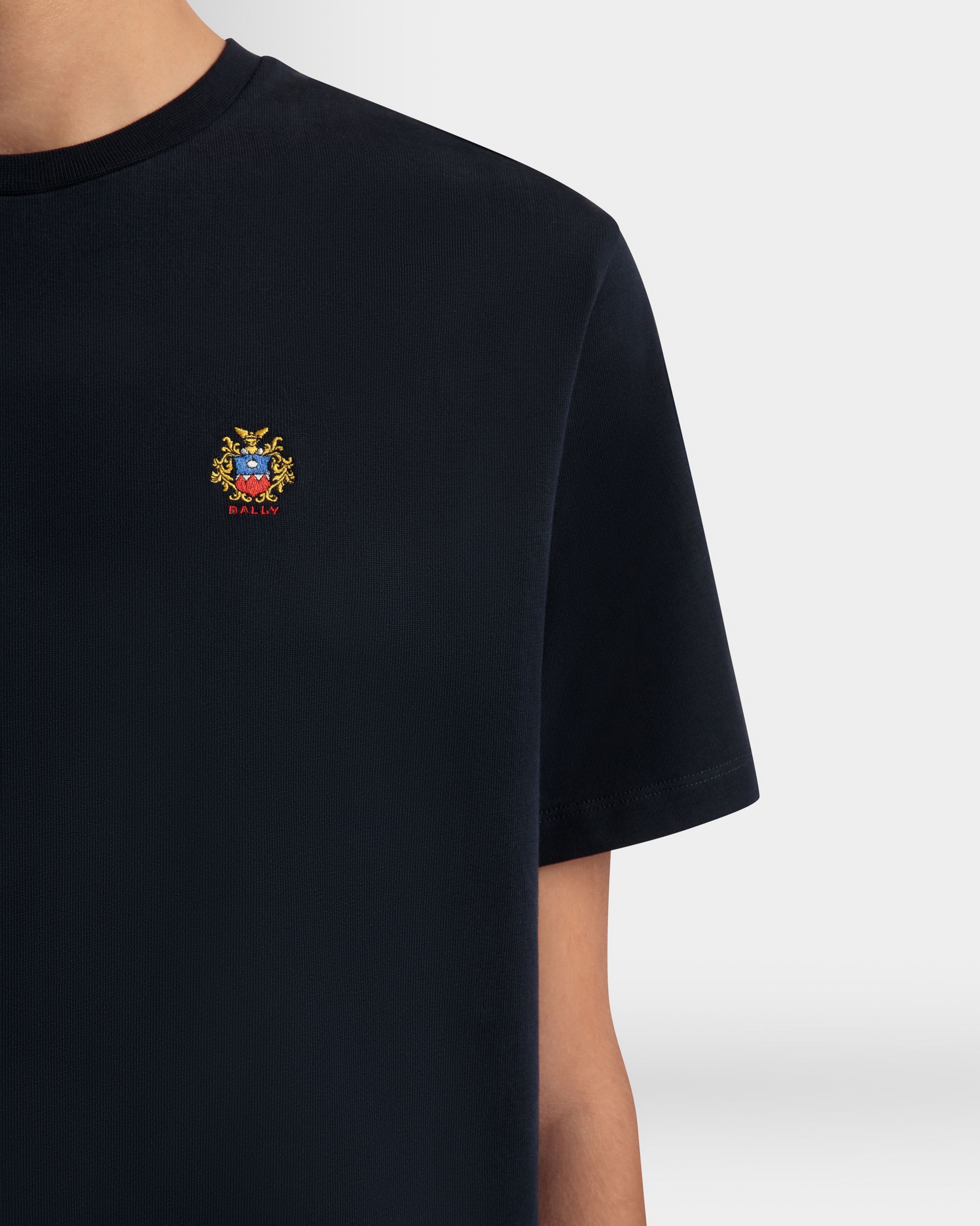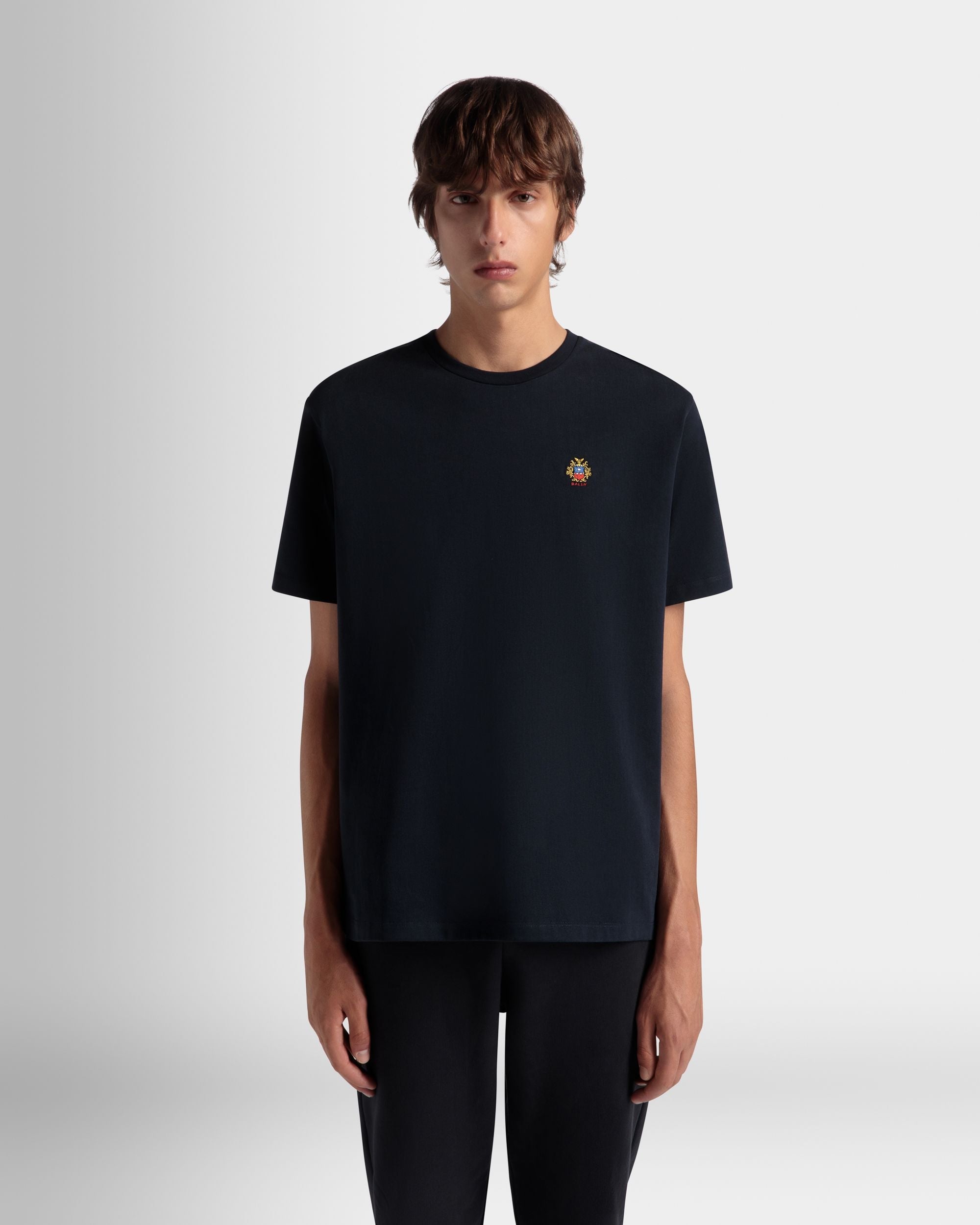 In navy blue organic cotton. this classic short-sleeve t-shirt is decorated by a Bally Crest on the left chest.