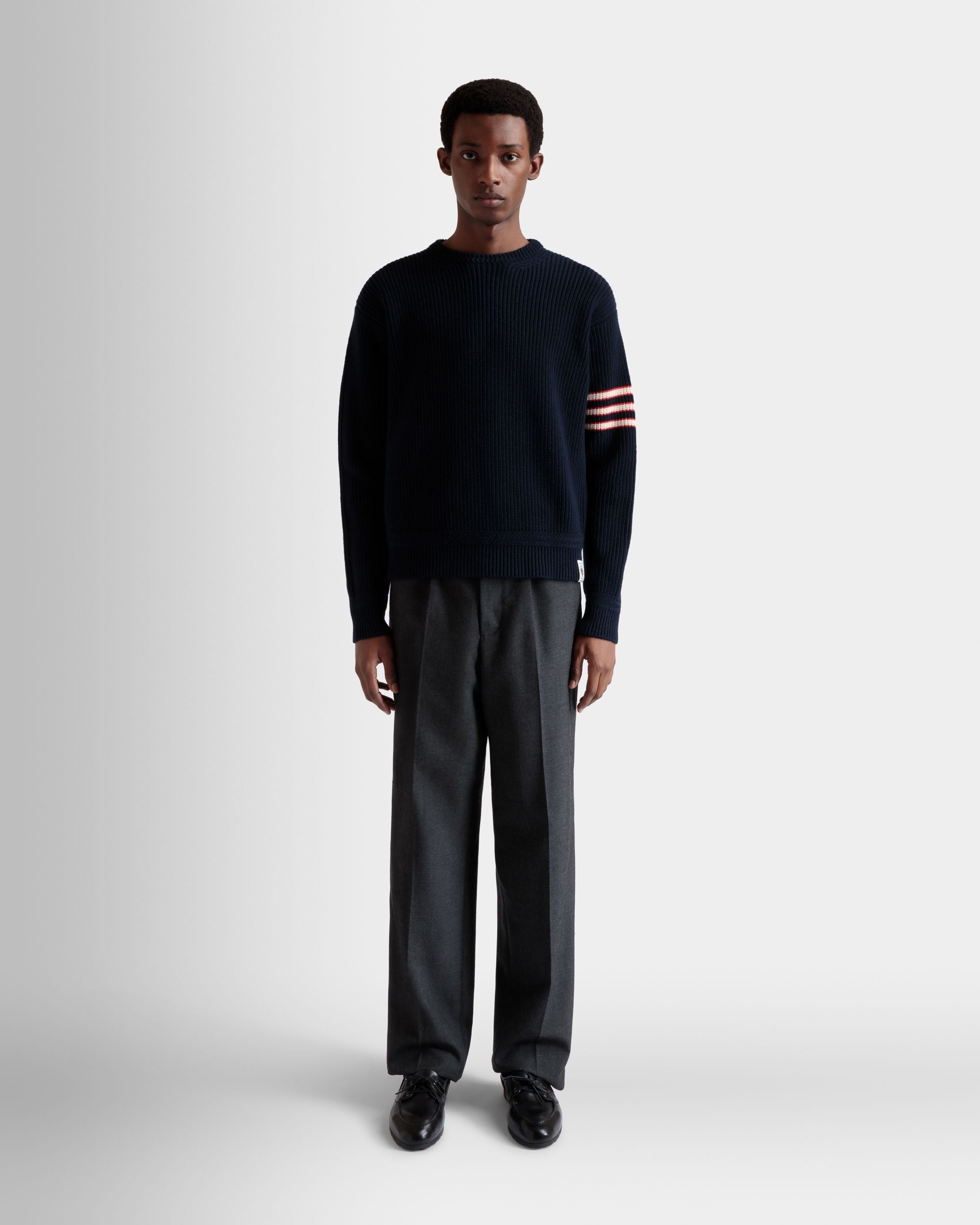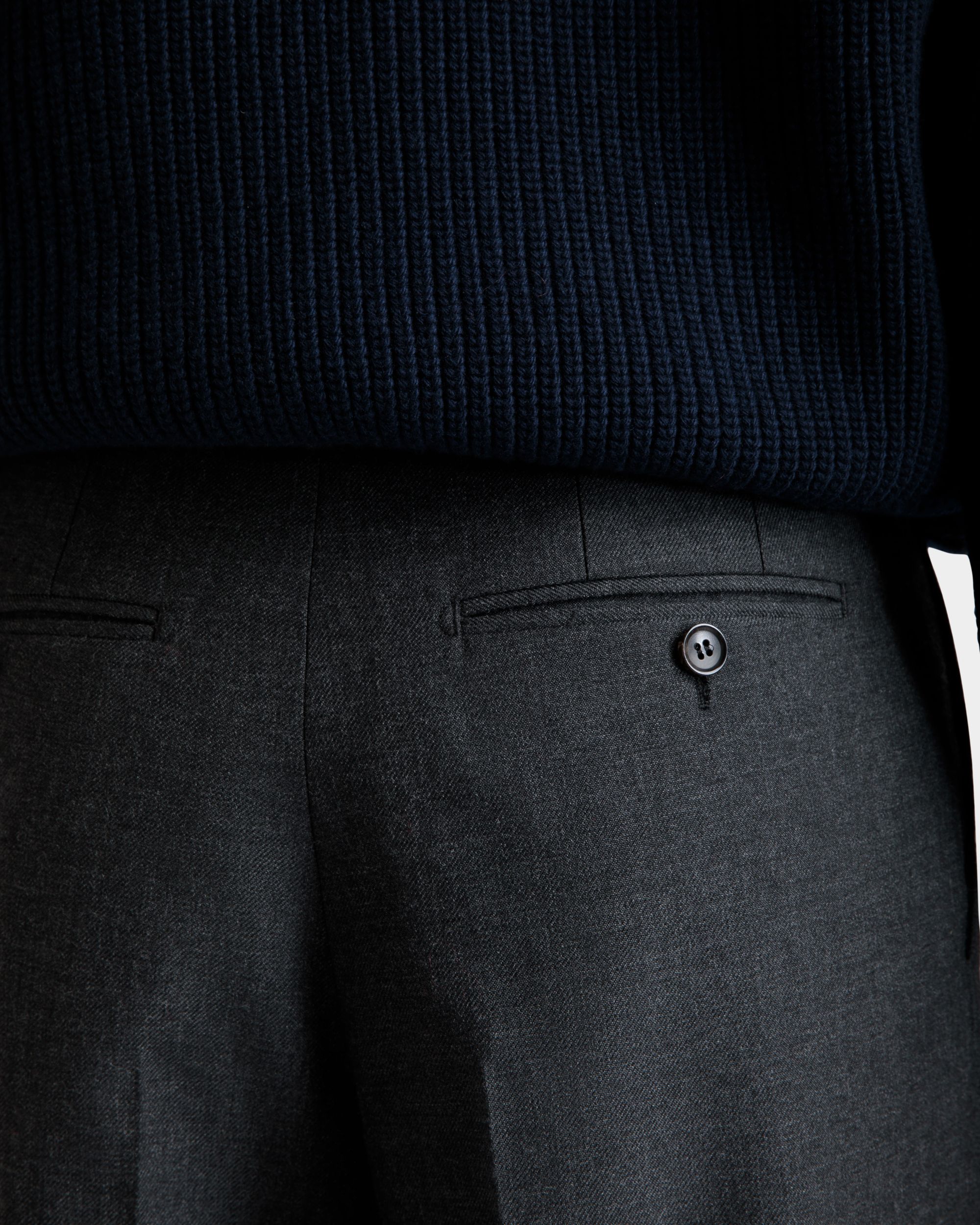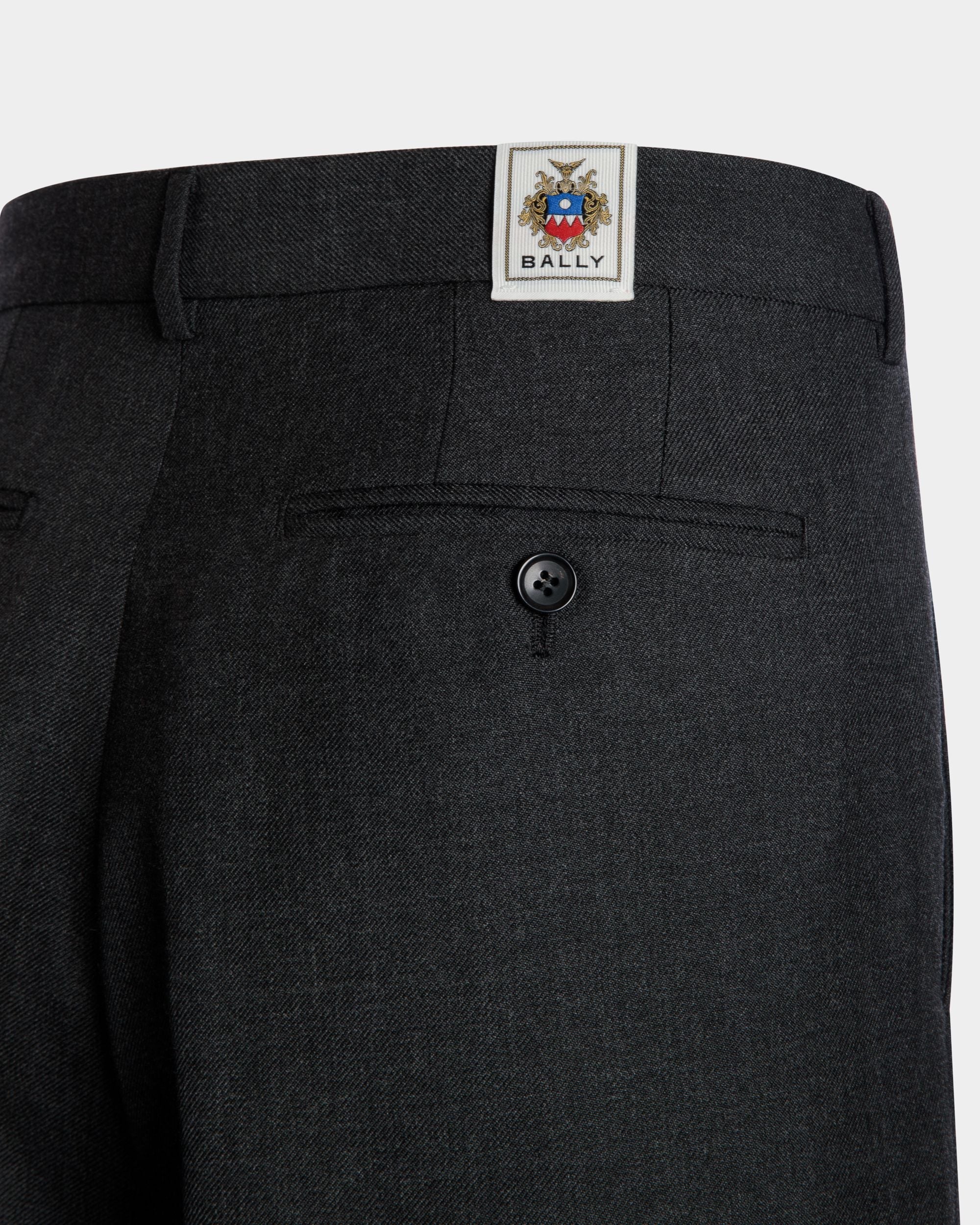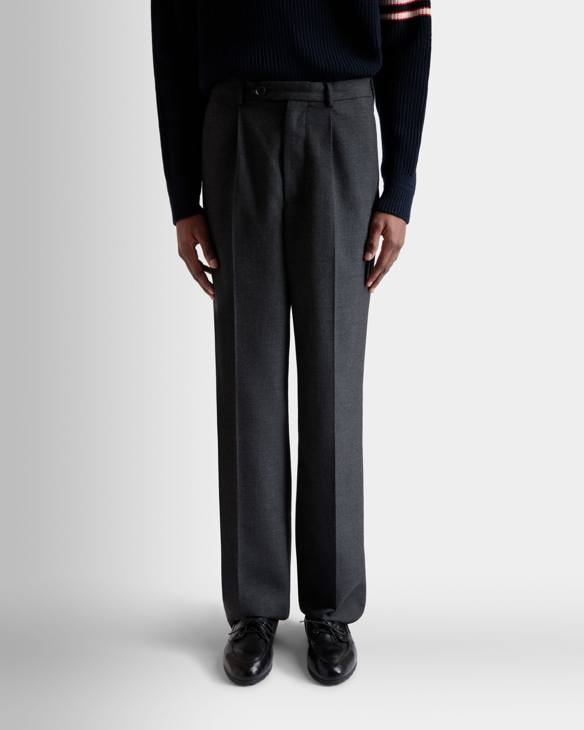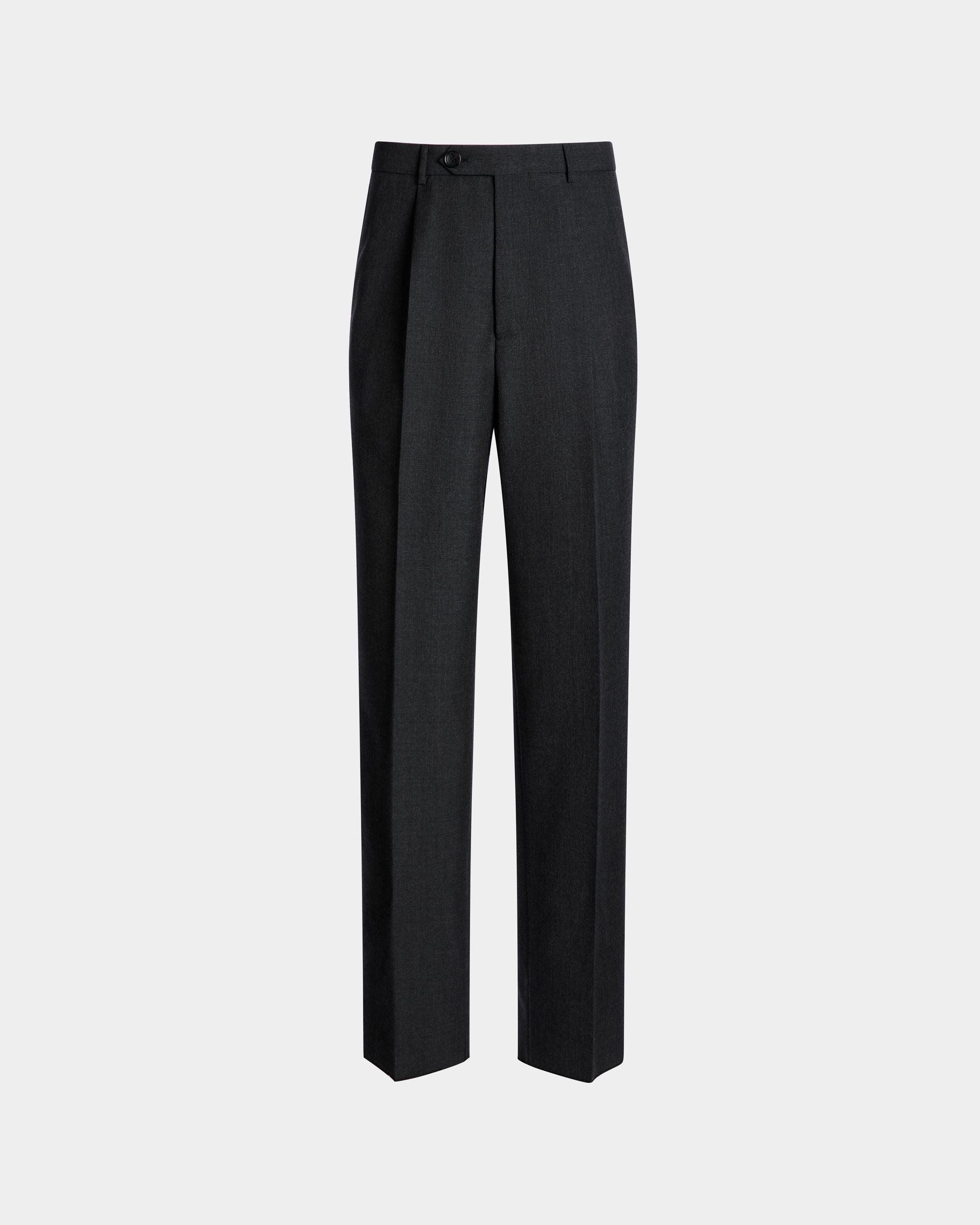 These versatile dark grey pleated pants are crafted from fine wool blend cloth.