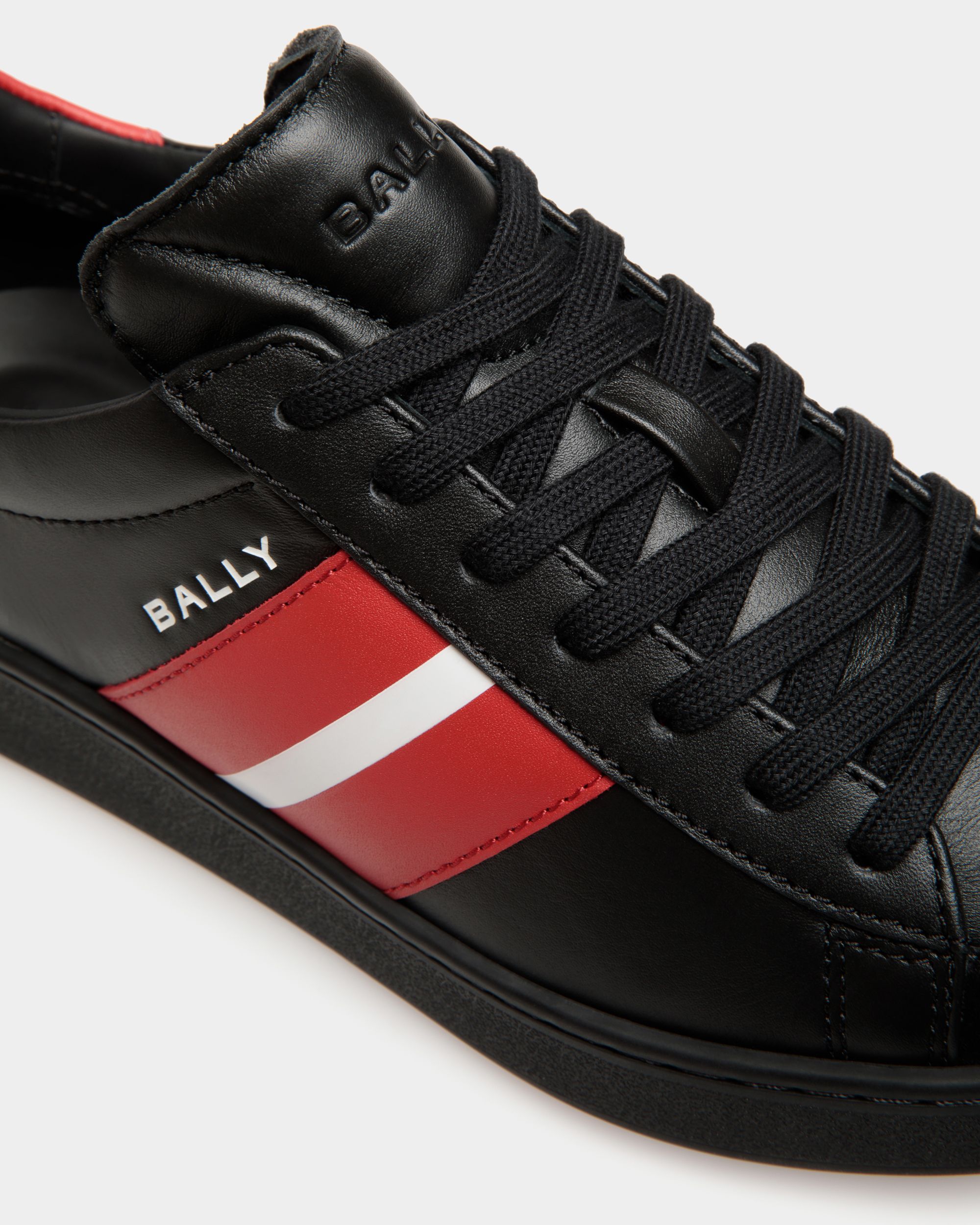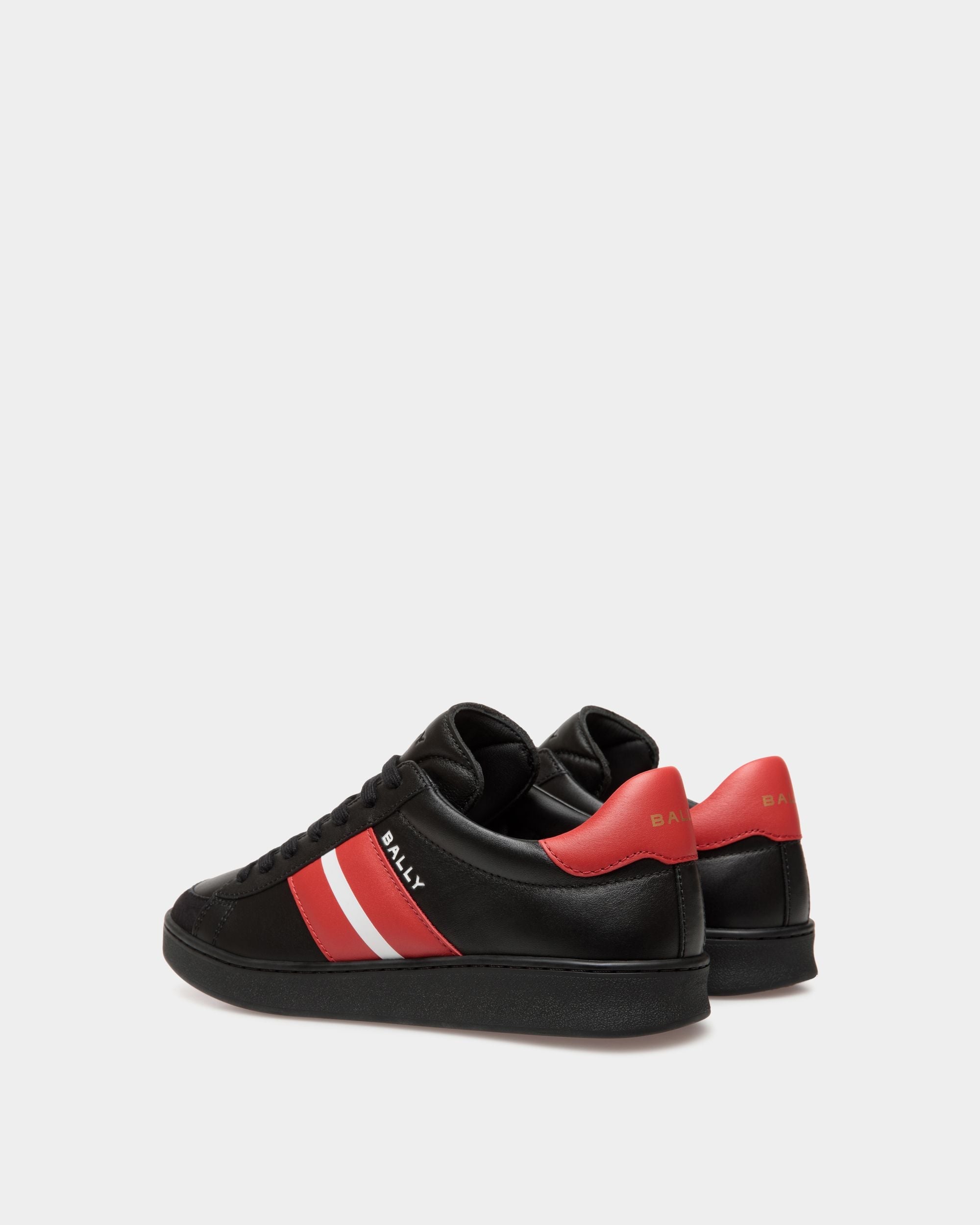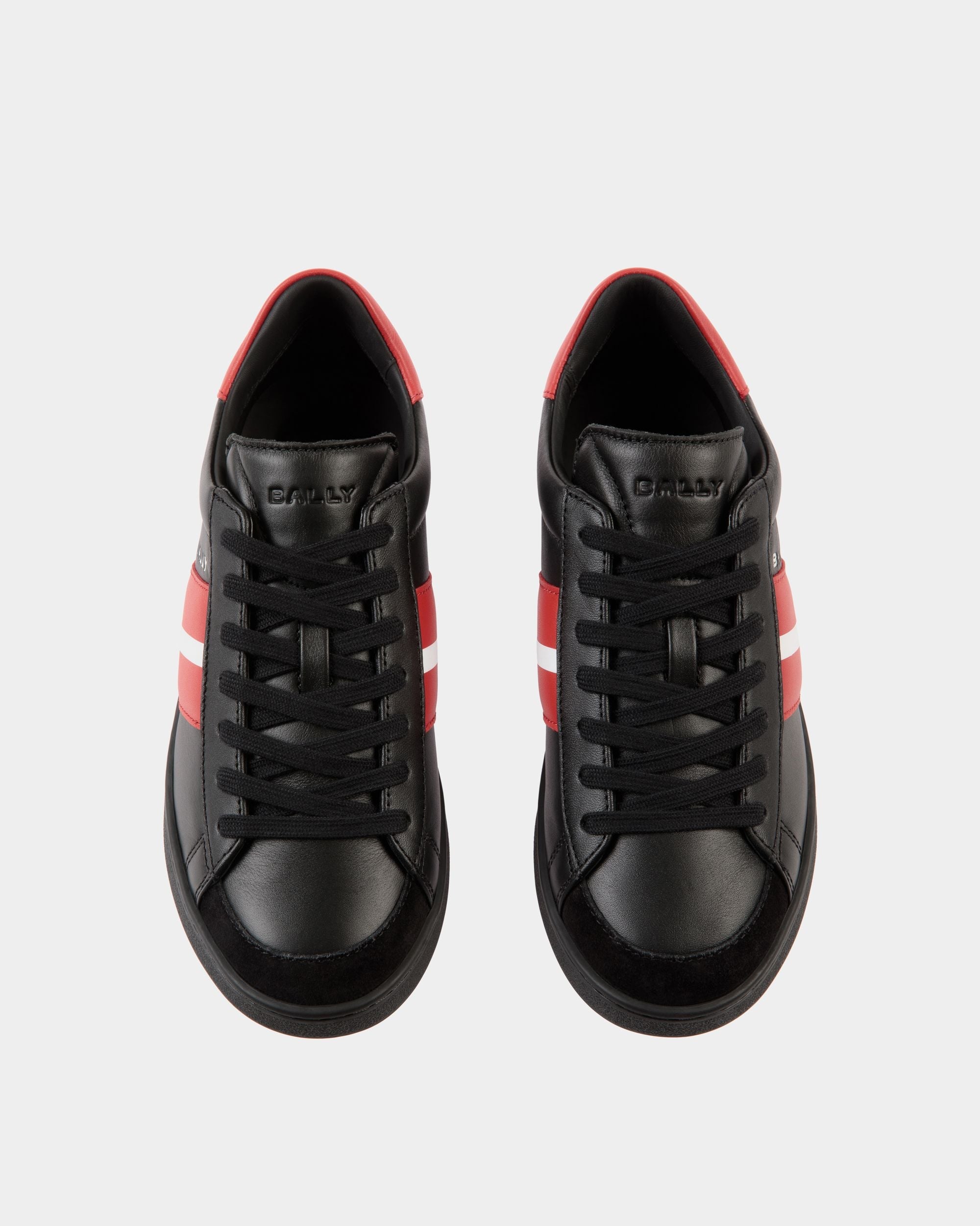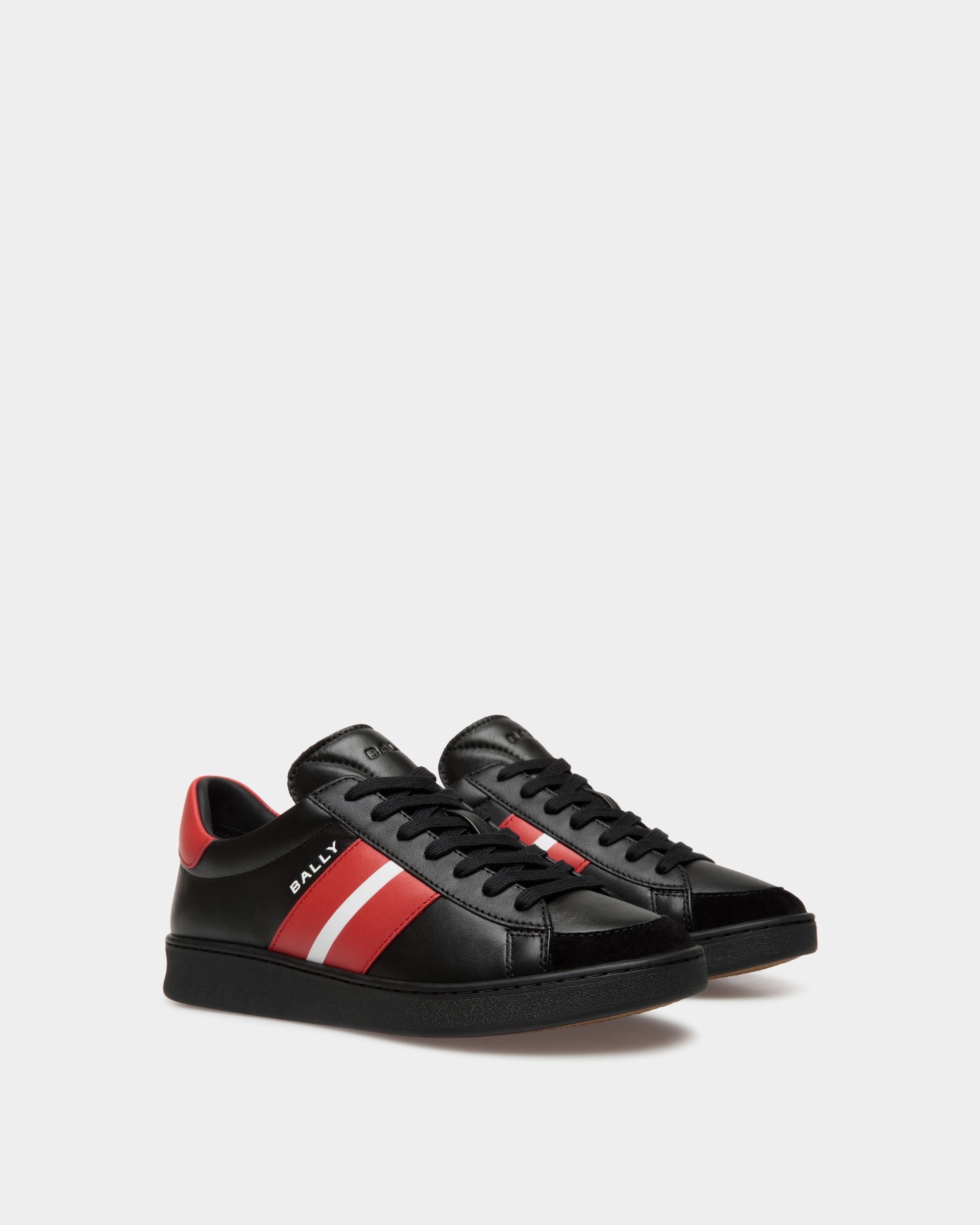 In black leather. this lace-up Tennis sneaker features a sleek silhouette and assured character. Red and white leather overlays create the Bally Ribbon at the sides. trimmed by a debossed logo.
