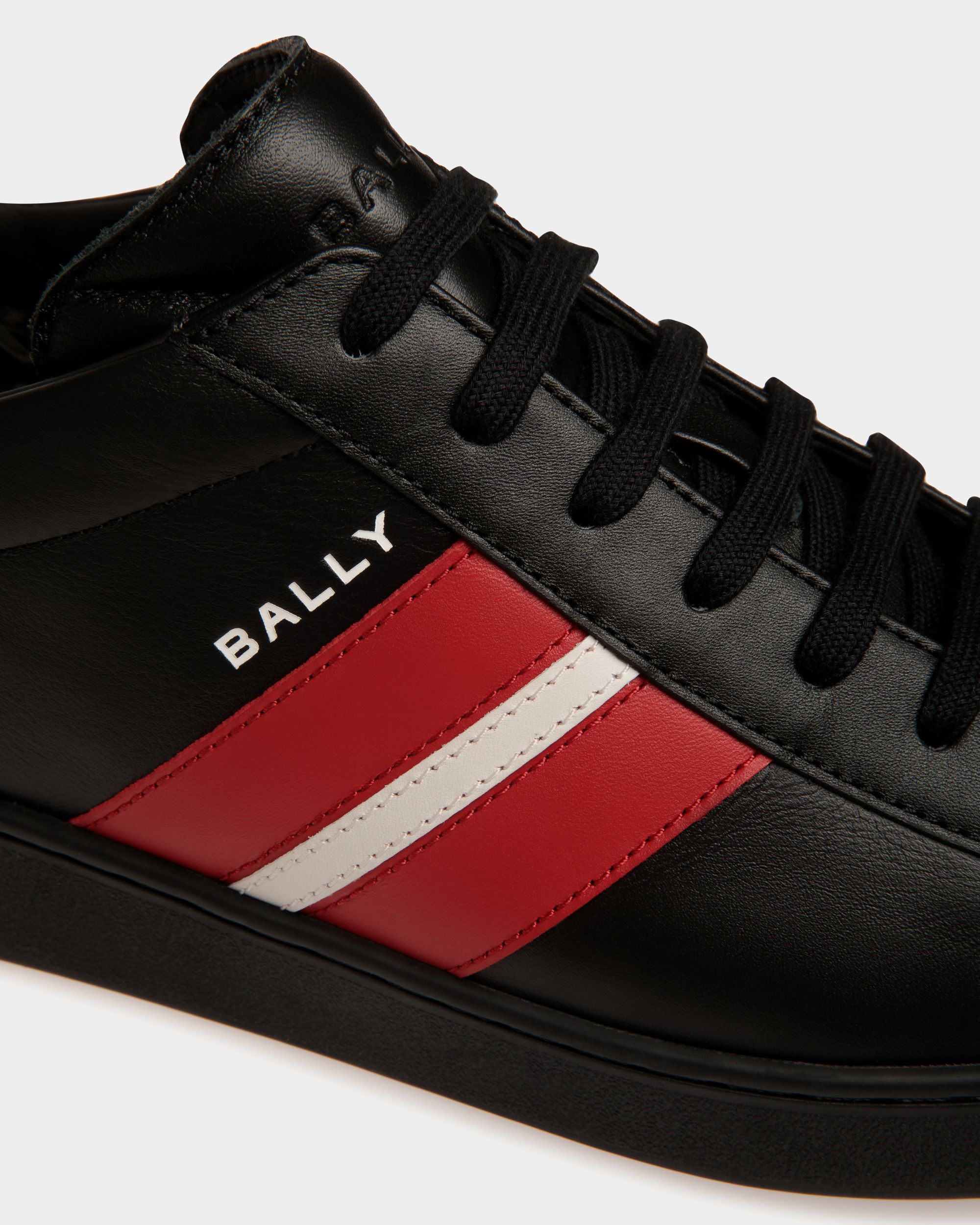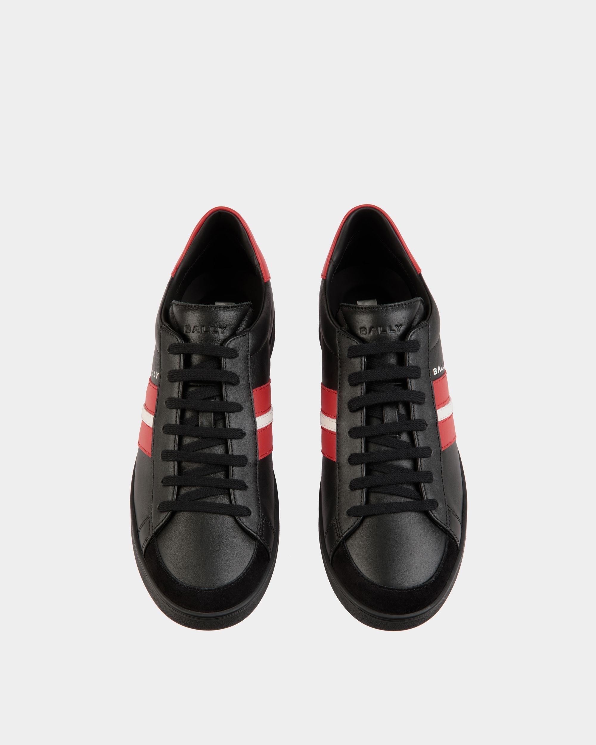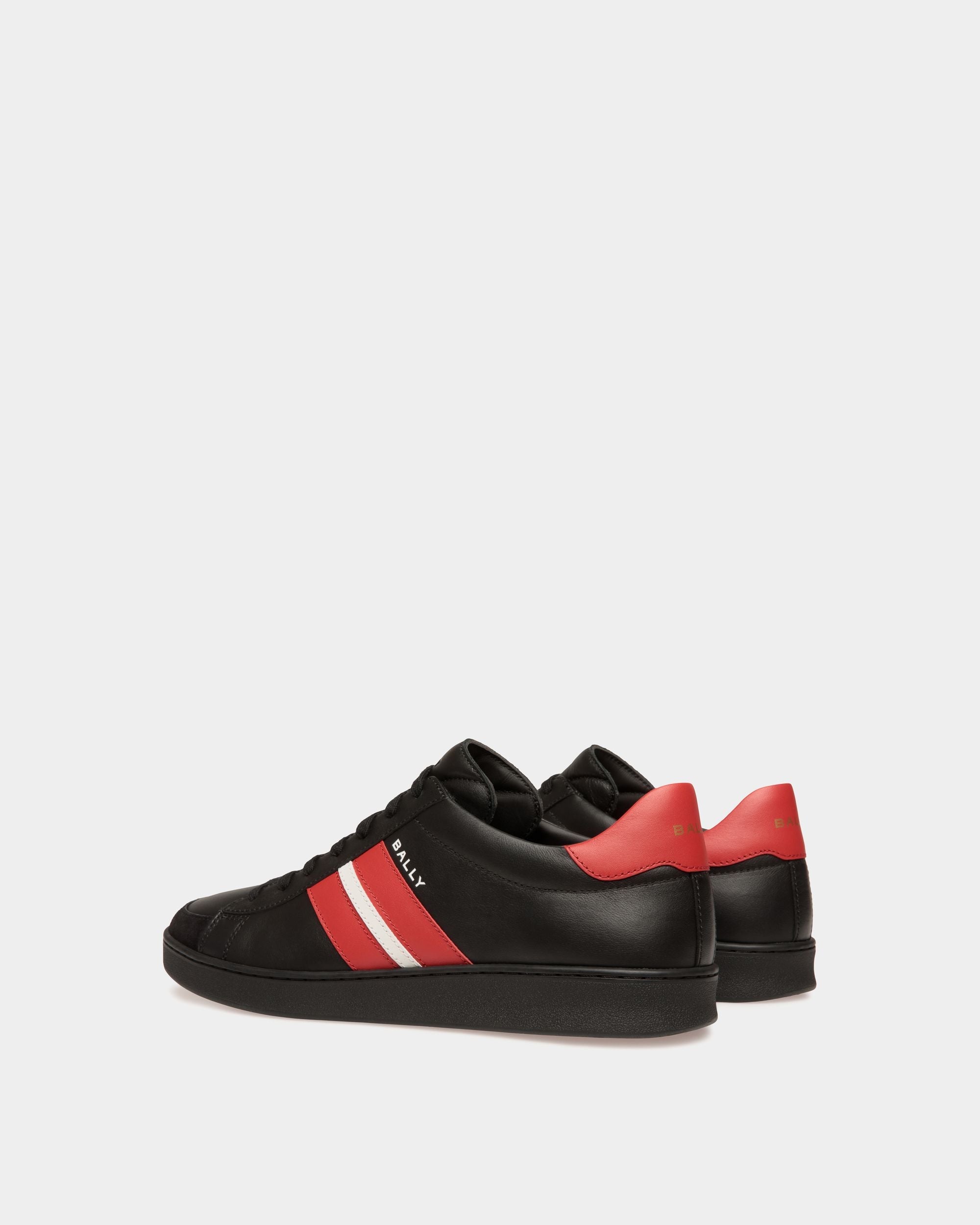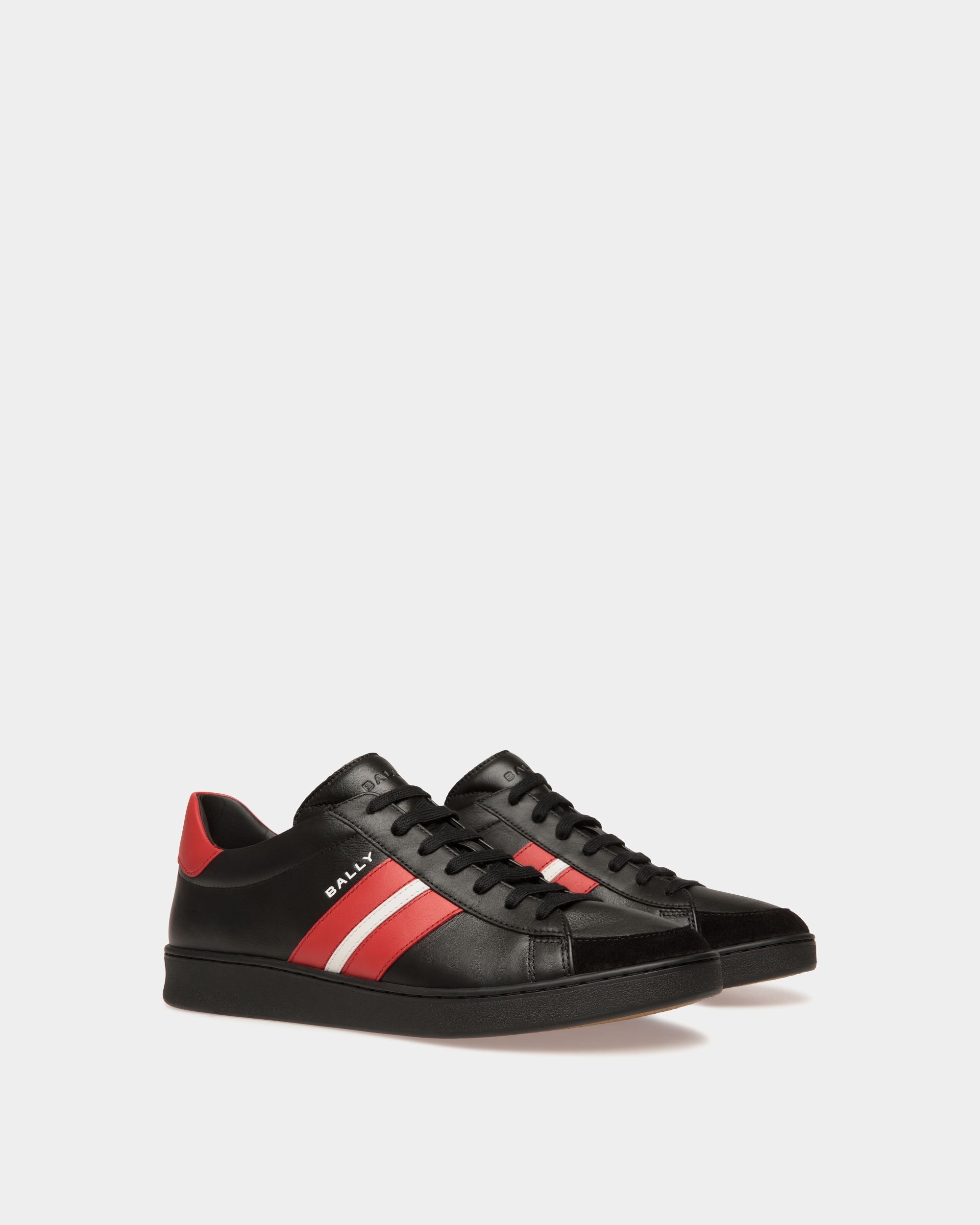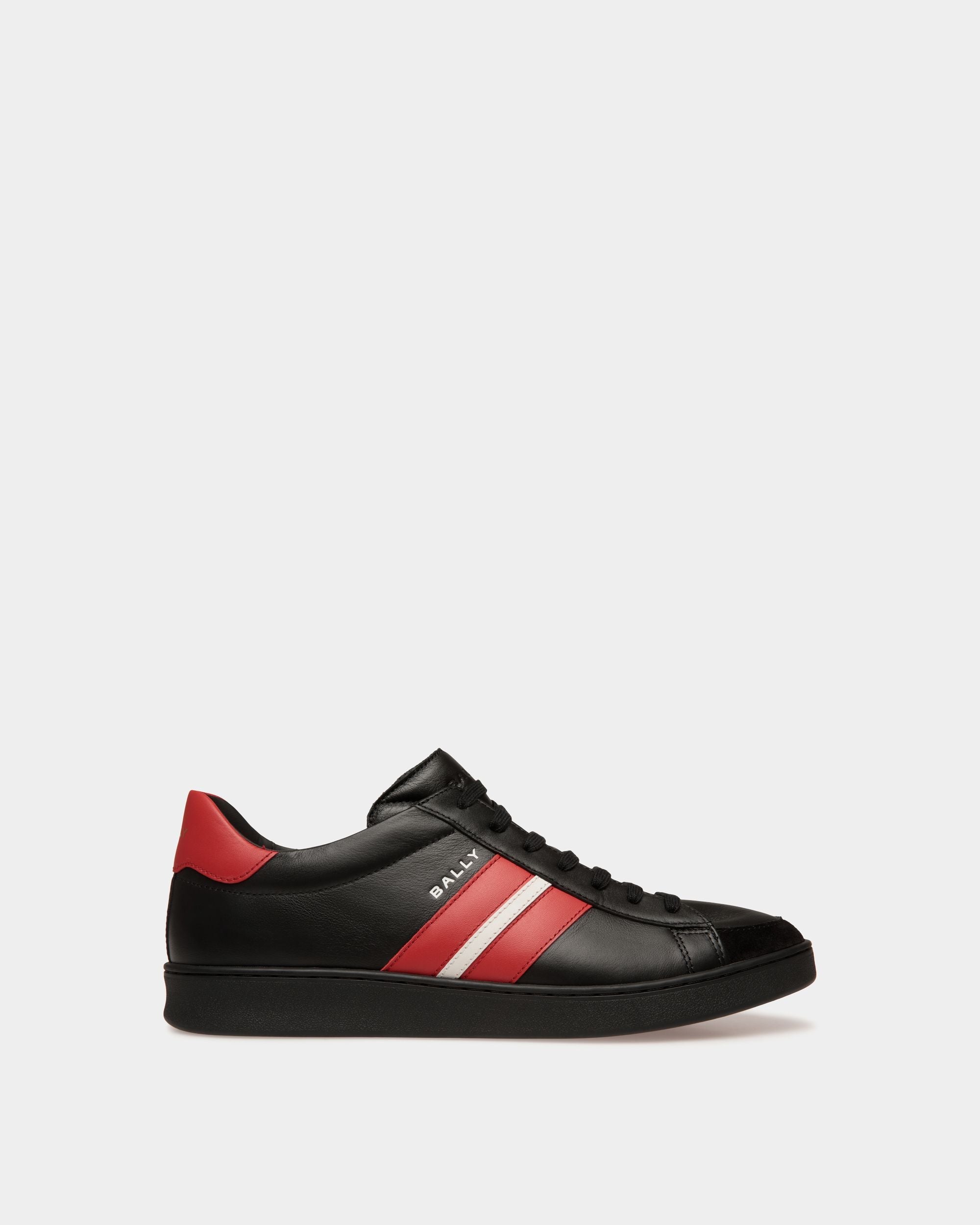 Tennis sneaker with a black leather upper and black sole. with a pop of Candy Red via the Bally Ribbon at the side.