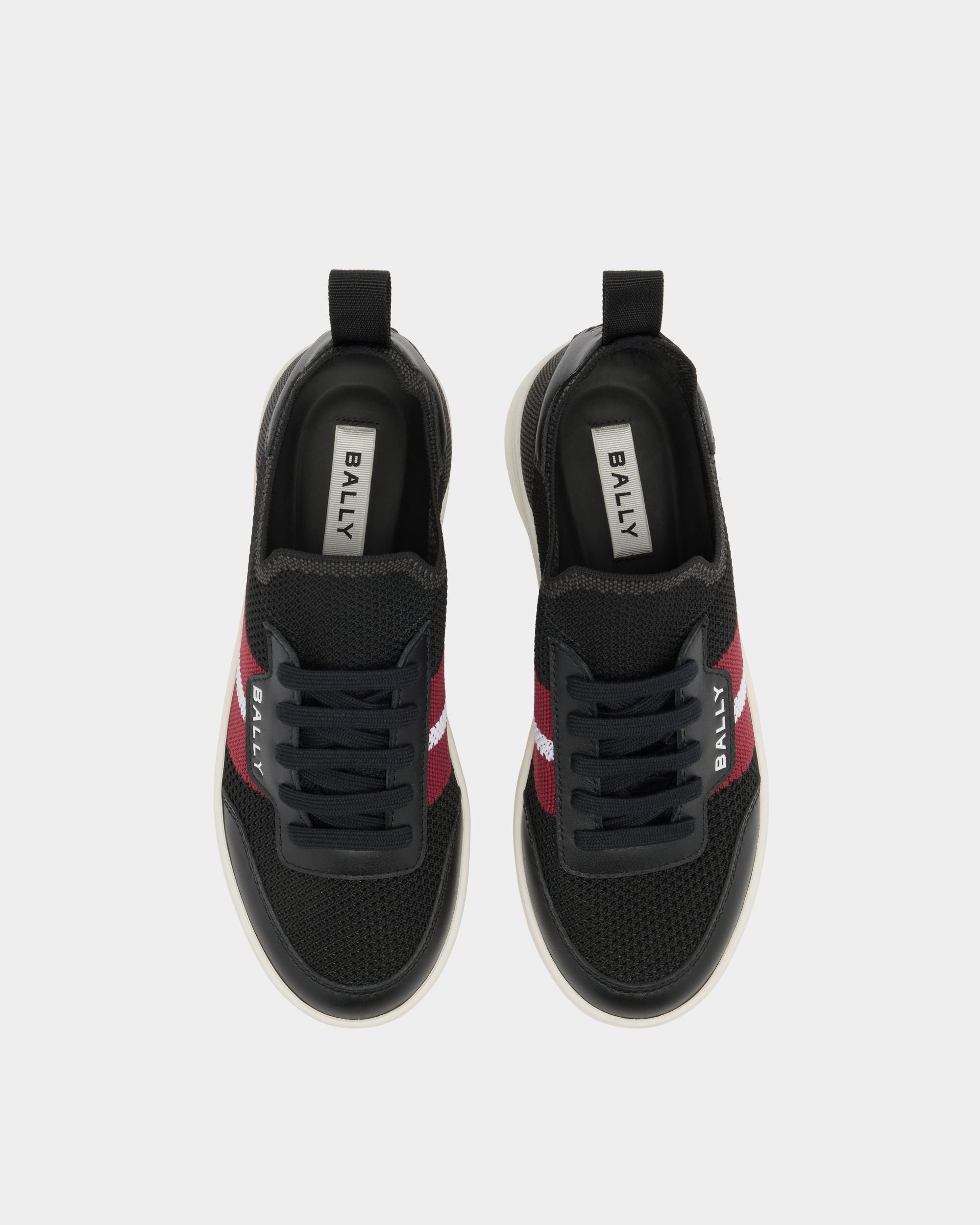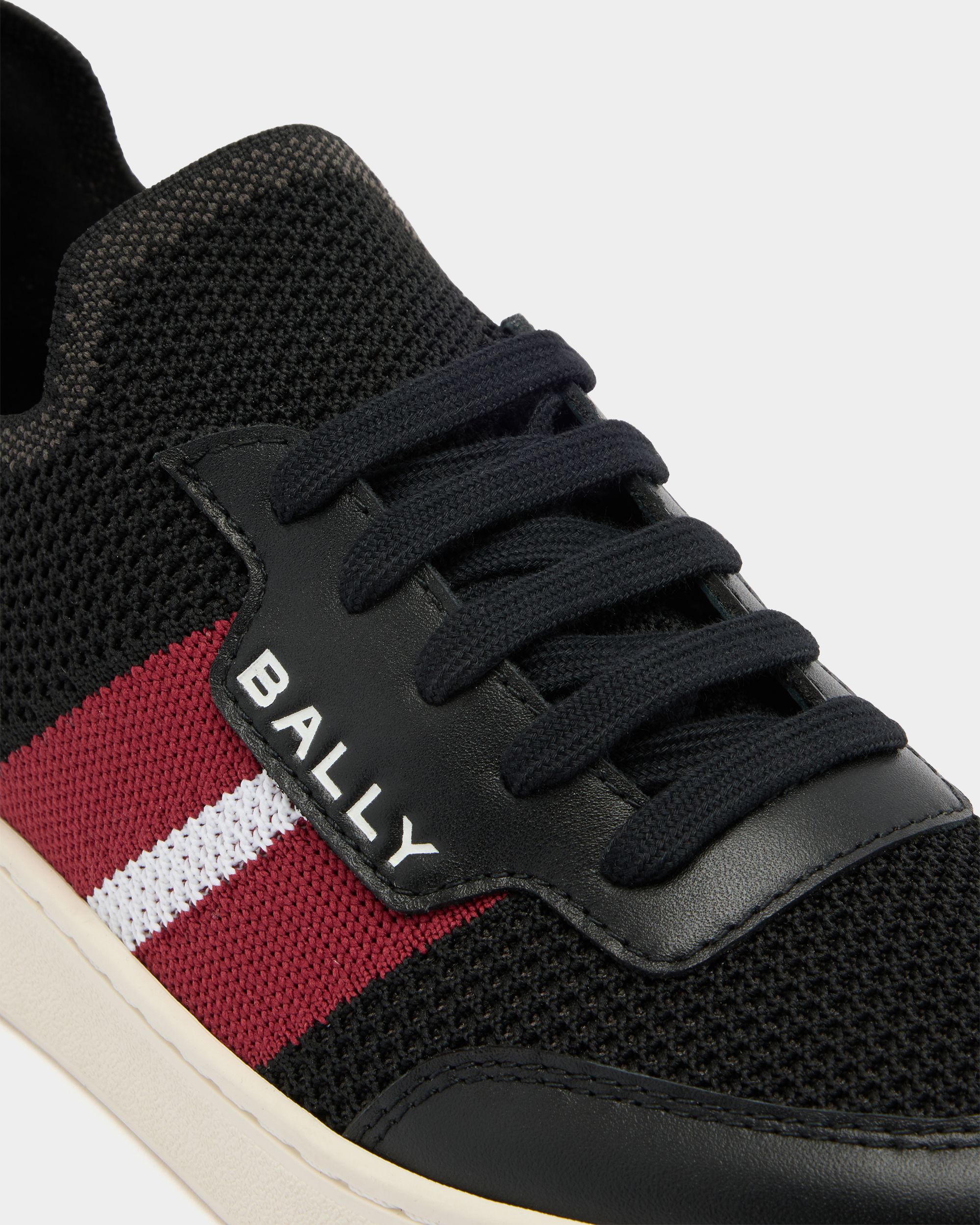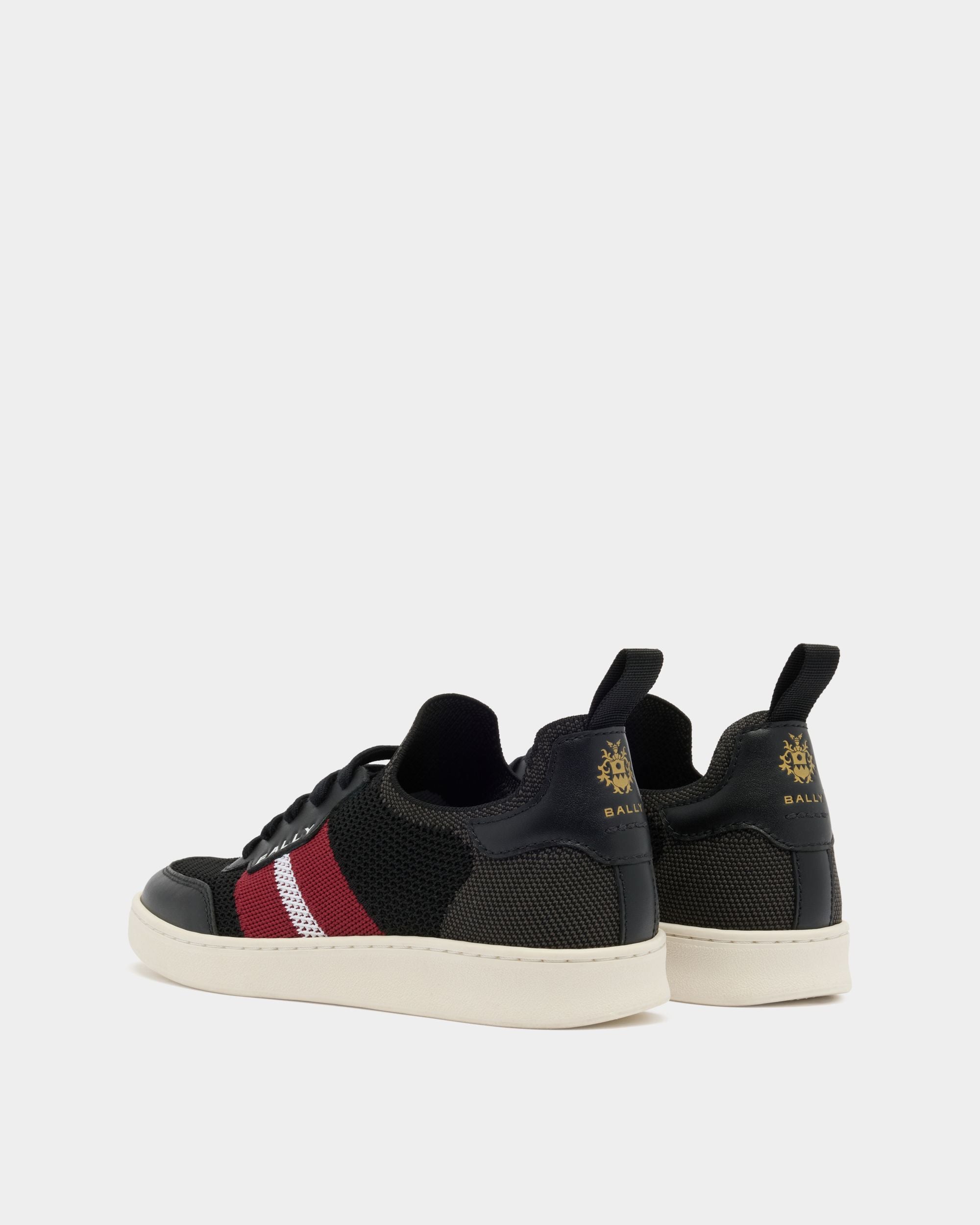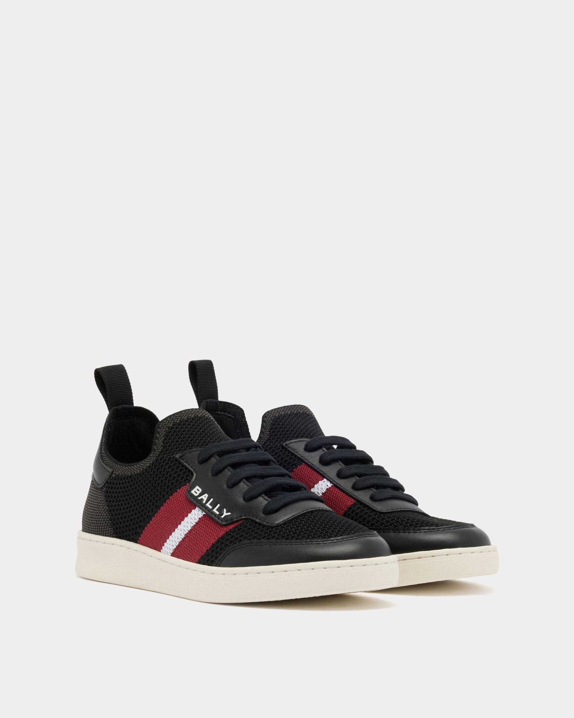 This Tennis sneaker in black knit fabric is enriched by the Bally Ribbon and logo to the side. and a Bally Crest on the heel counter. Decorative laces conceal the slip-on ease of this rubber-sole sneaker.