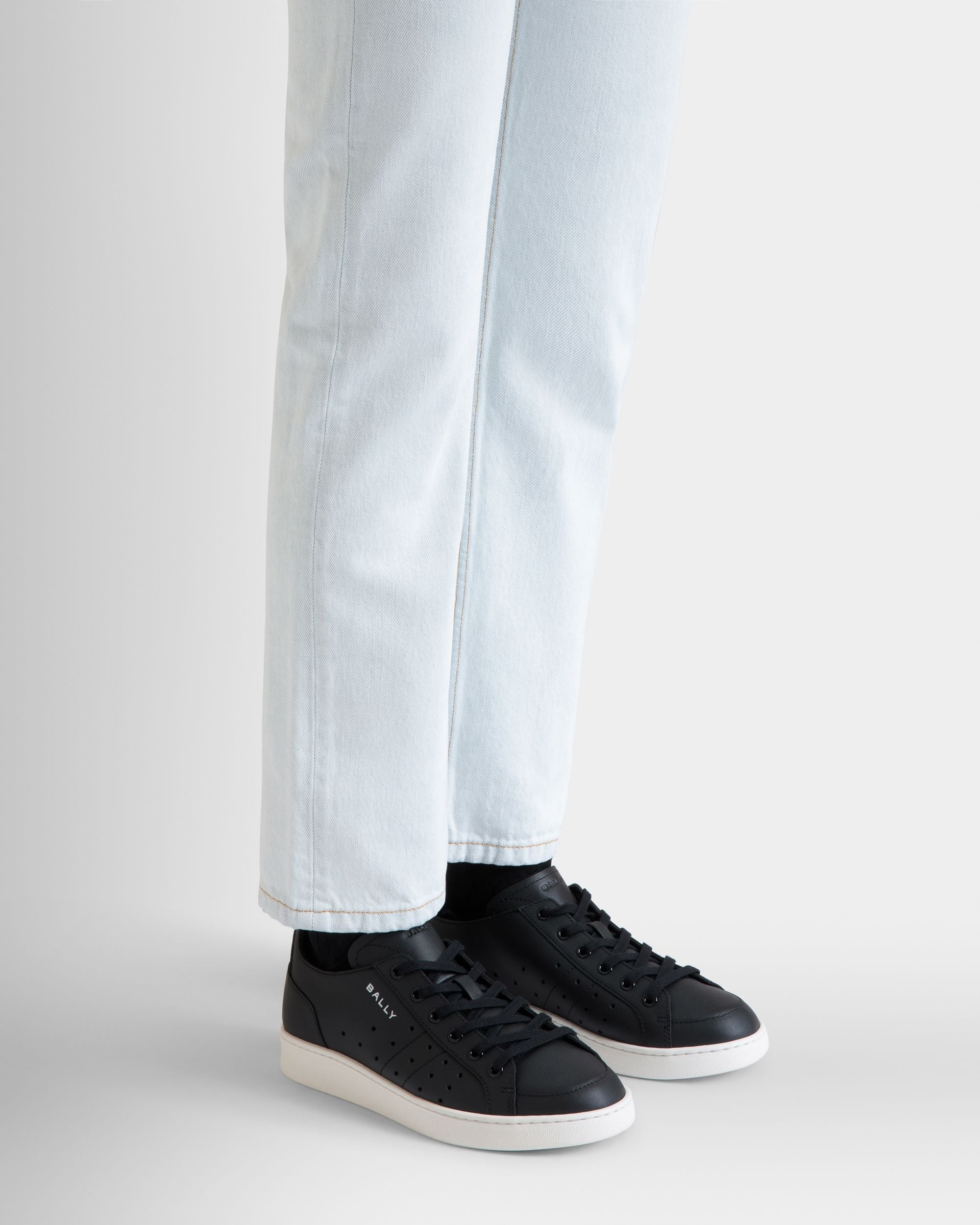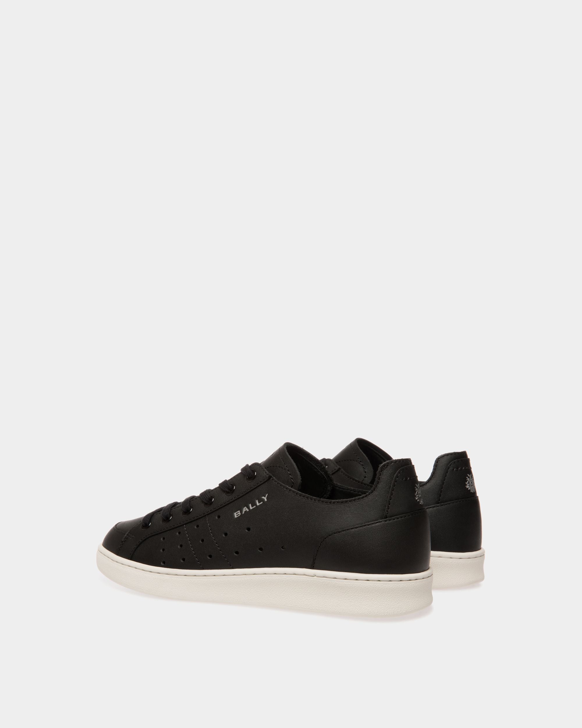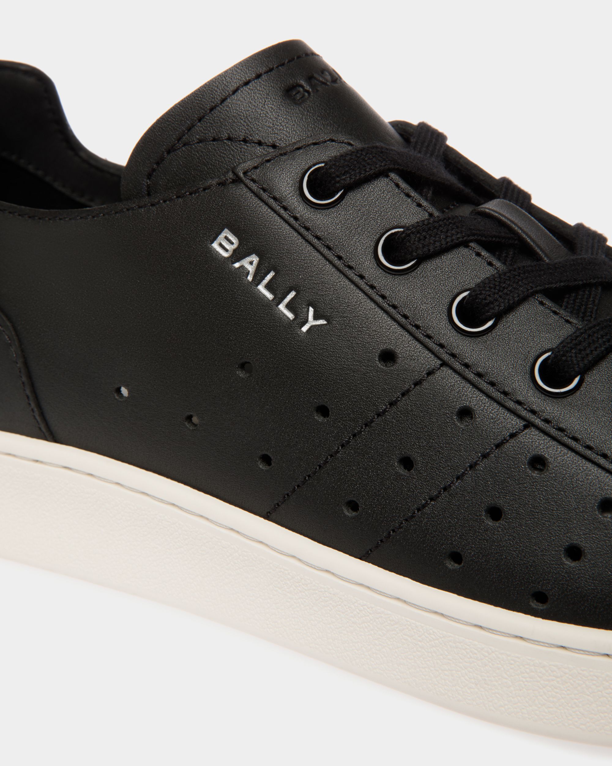 This Tennis sneaker unites a black leather upper with perforations and a thick rubber sole. A silver-tone debossed Bally Crest and logo add an iconic note.