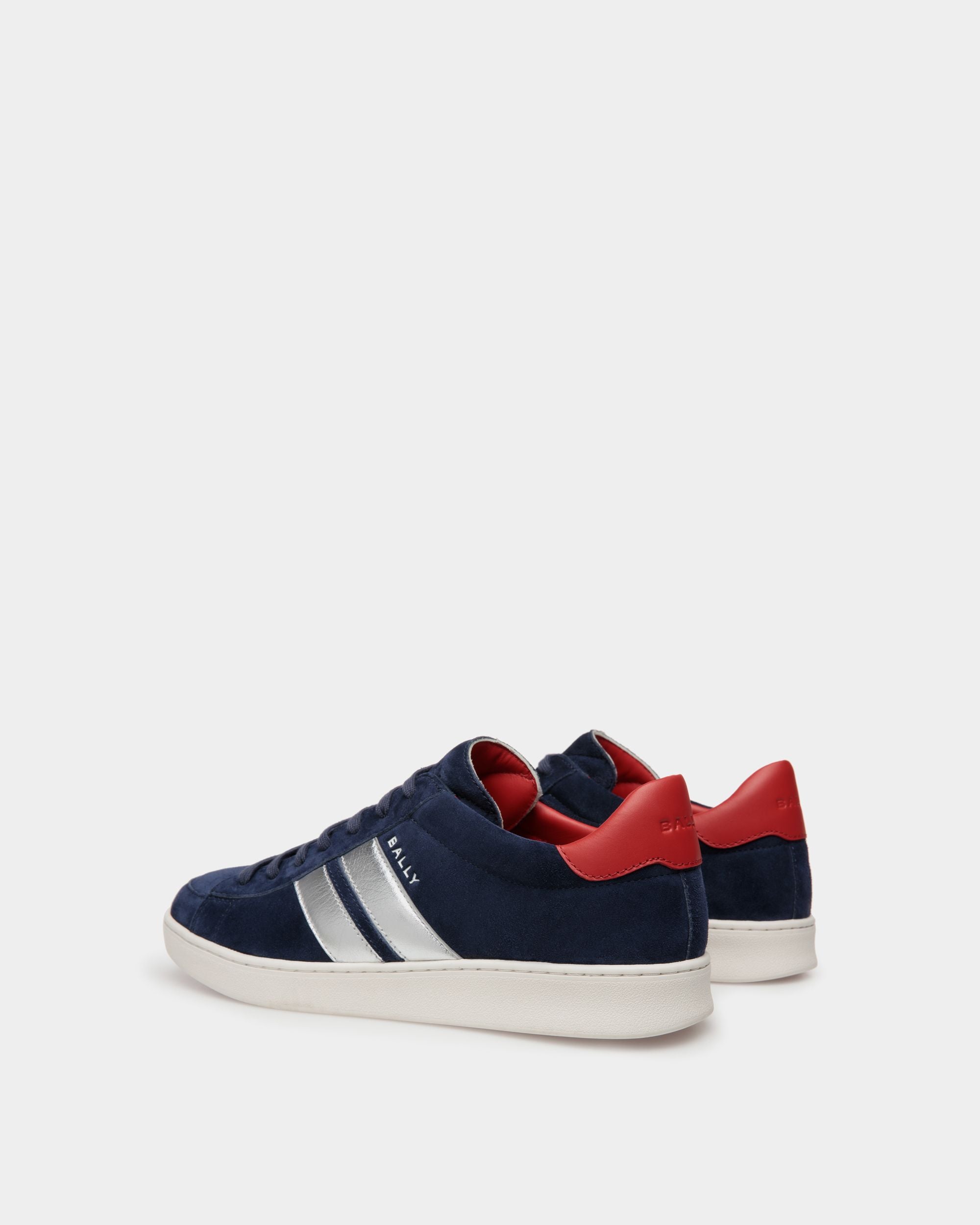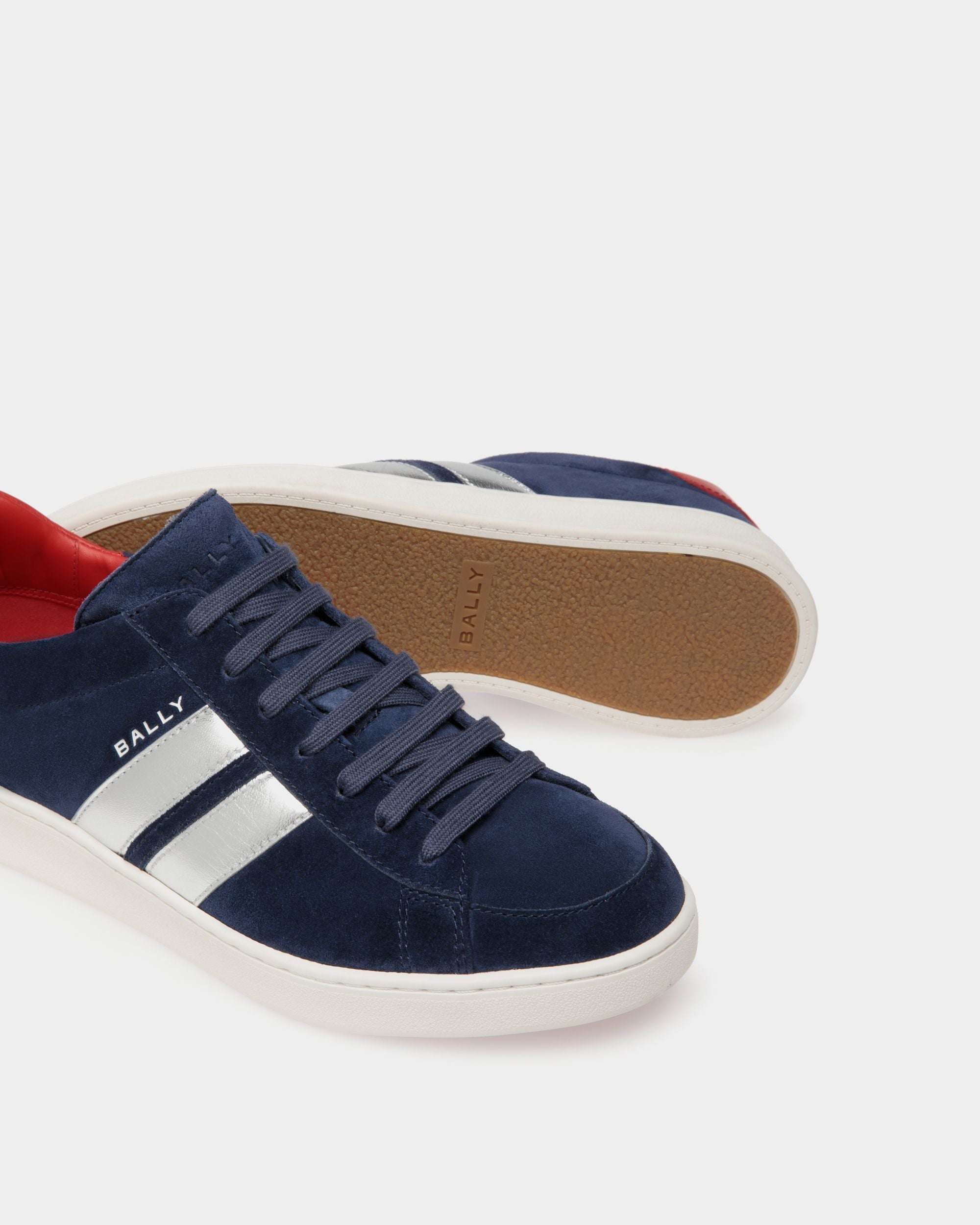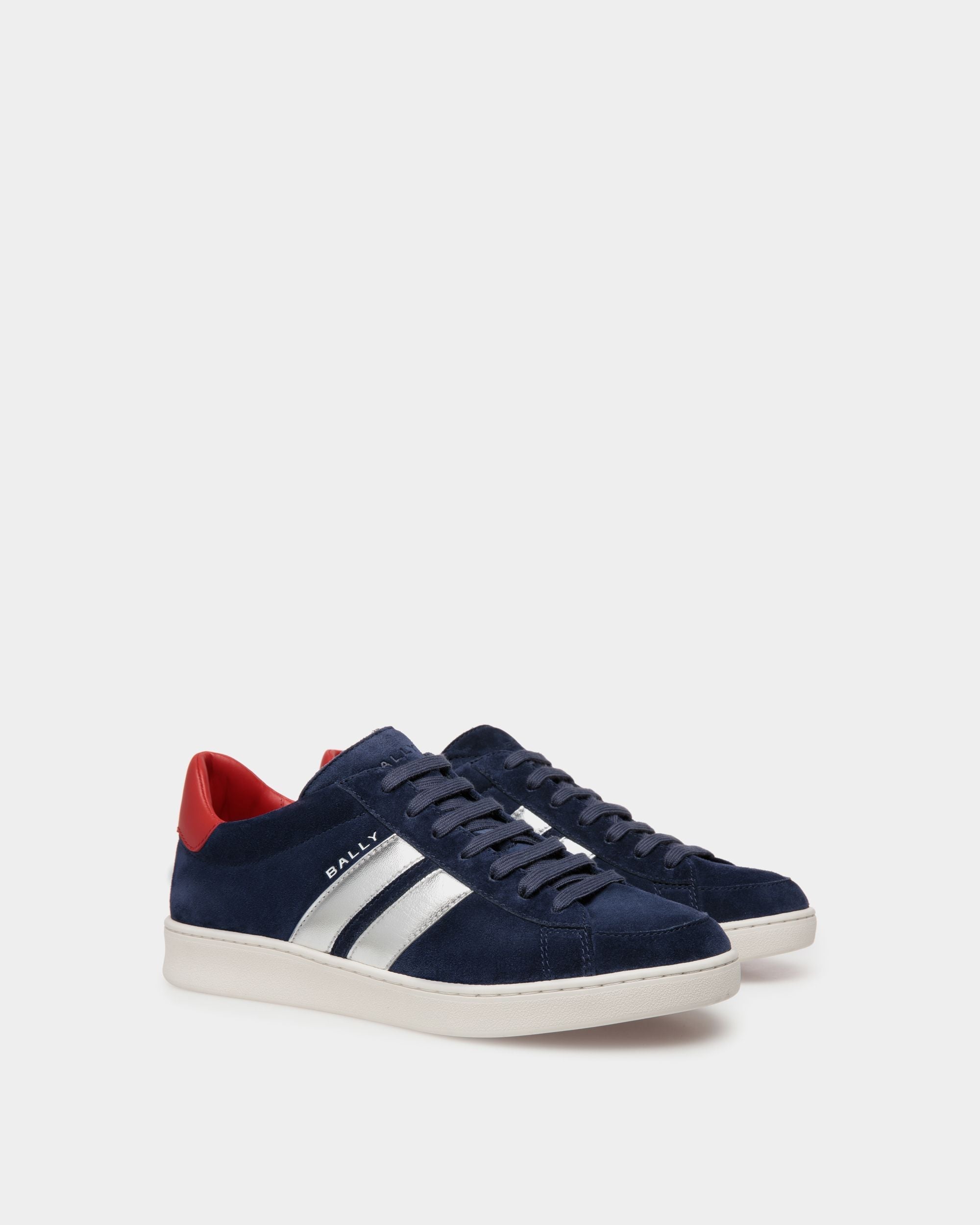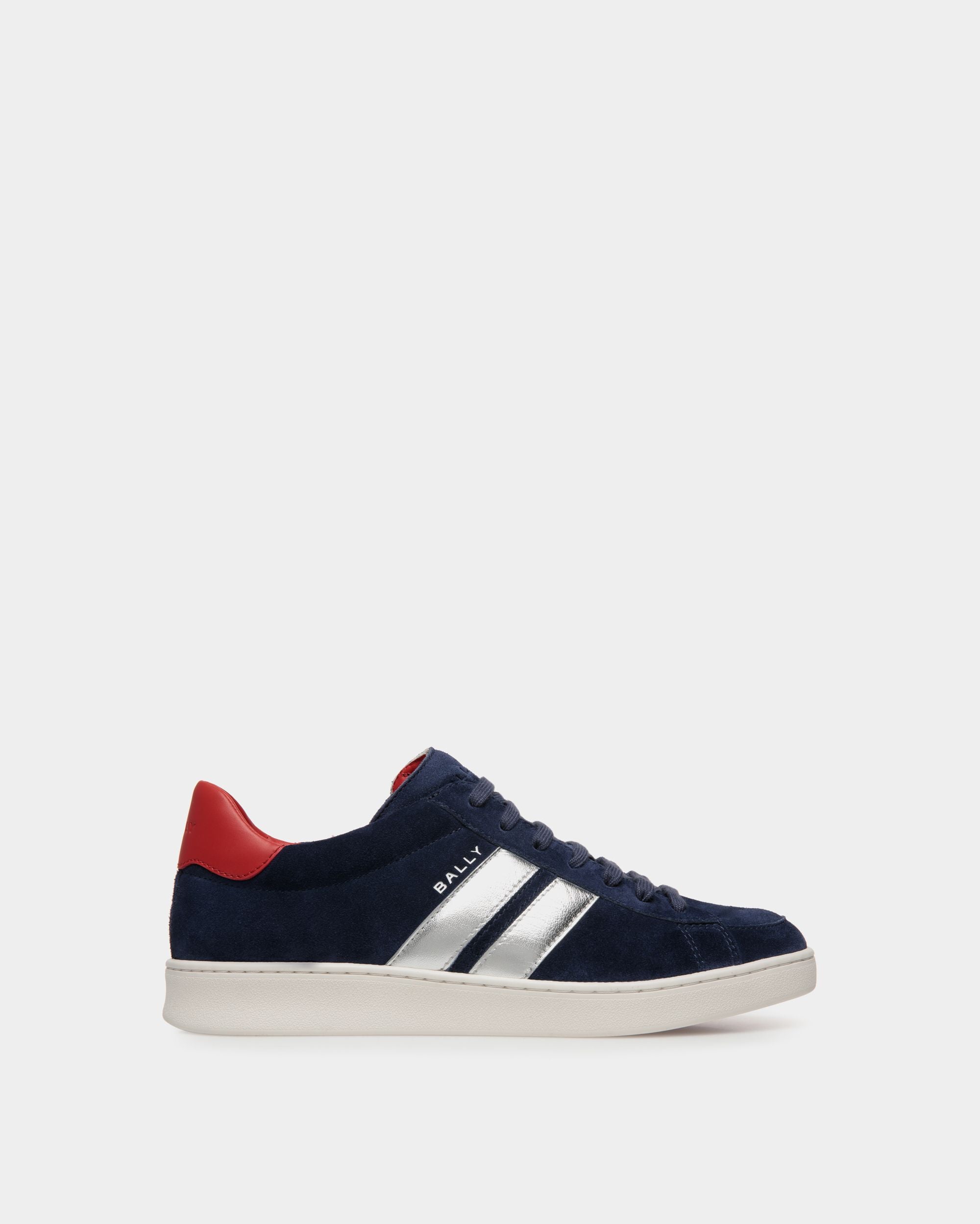 This Tennis sneaker in navy blue suede has a colorful pop of Candy Red leather on the heel counter and lining. A padded Bally Ribbon in silver leather decorates the quarter.