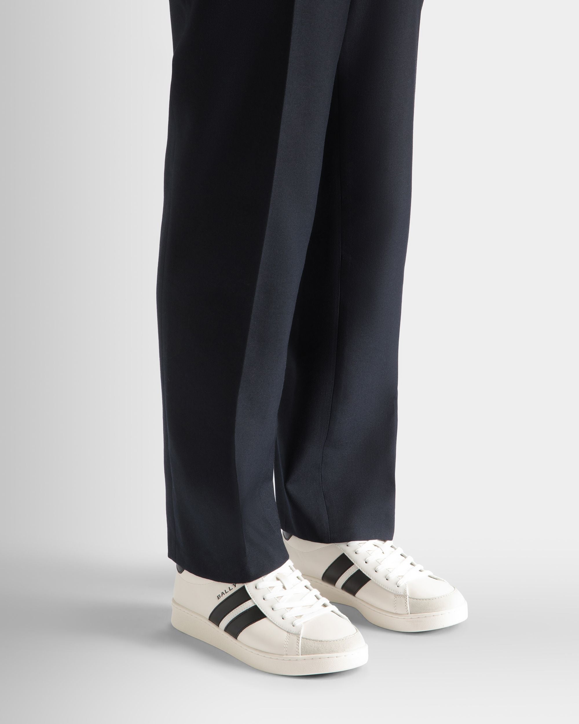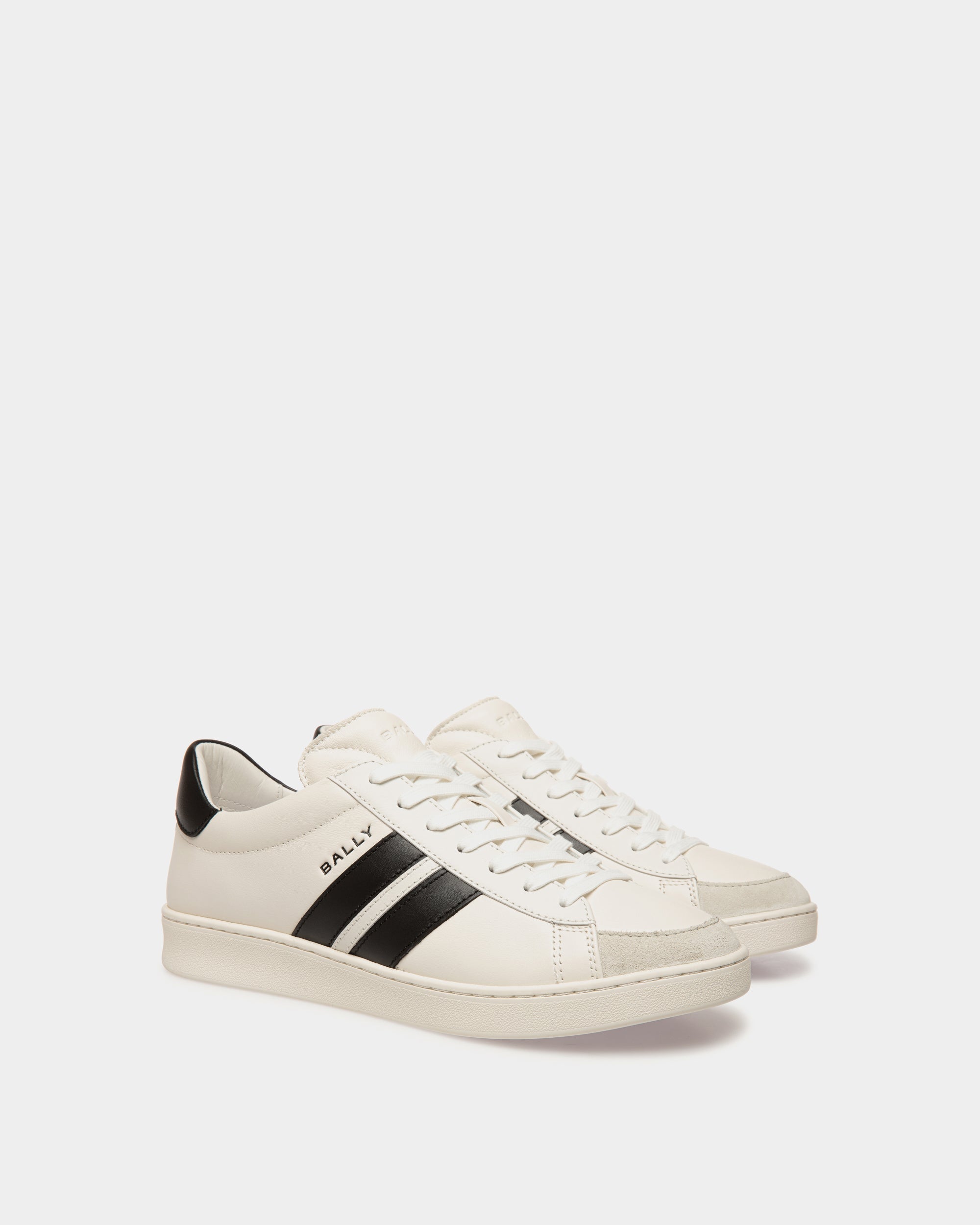 Crafted from premium white leather and finished with a classic rubber sole. these sneakers offer a modern twist on a timeless design. The Bally Ribbon in a high-contrast black and white version trims the outer sides.