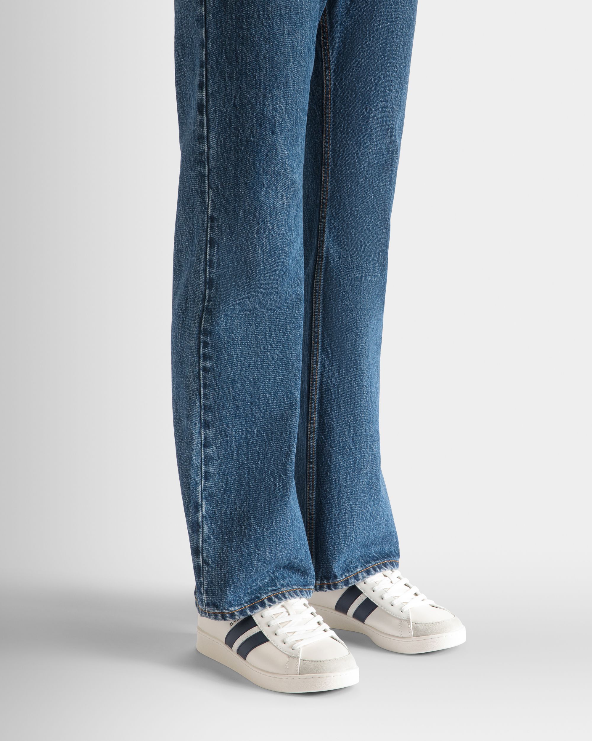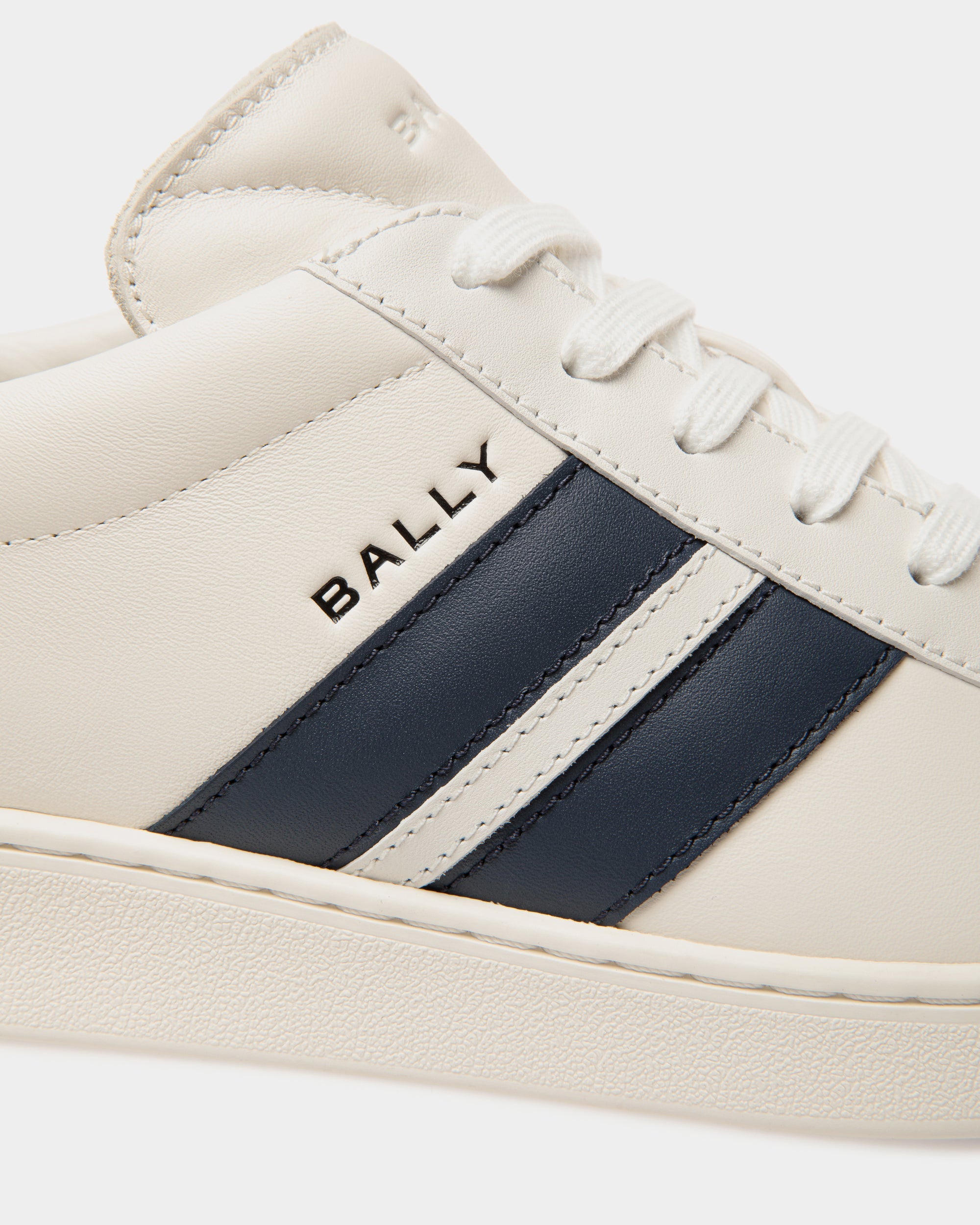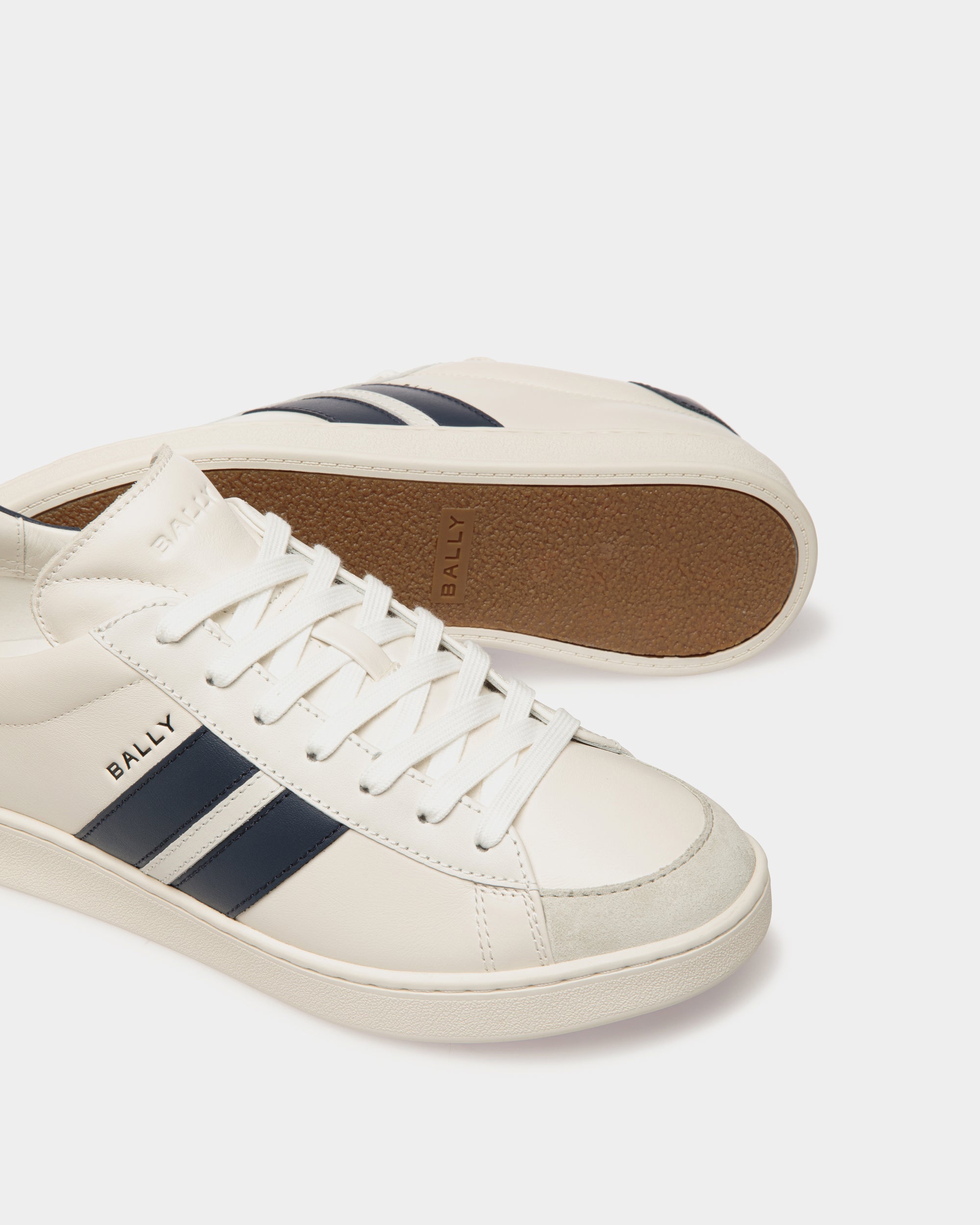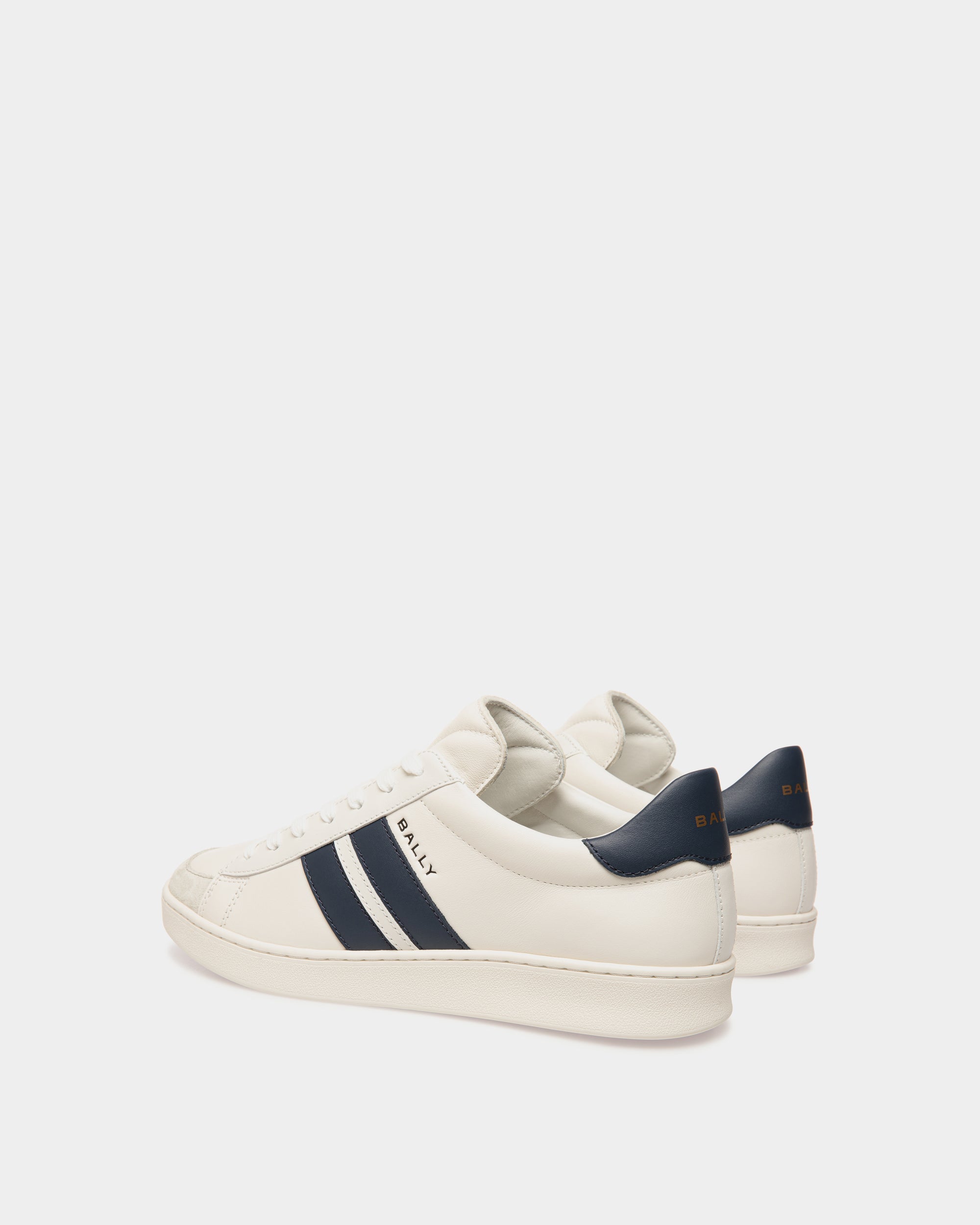 Crafted from premium white leather and finished with a classic rubber sole. these sneakers offer a modern twist on a timeless design. The Bally Ribbon and heel tab in navy blue add subtle color to this essential shoe.