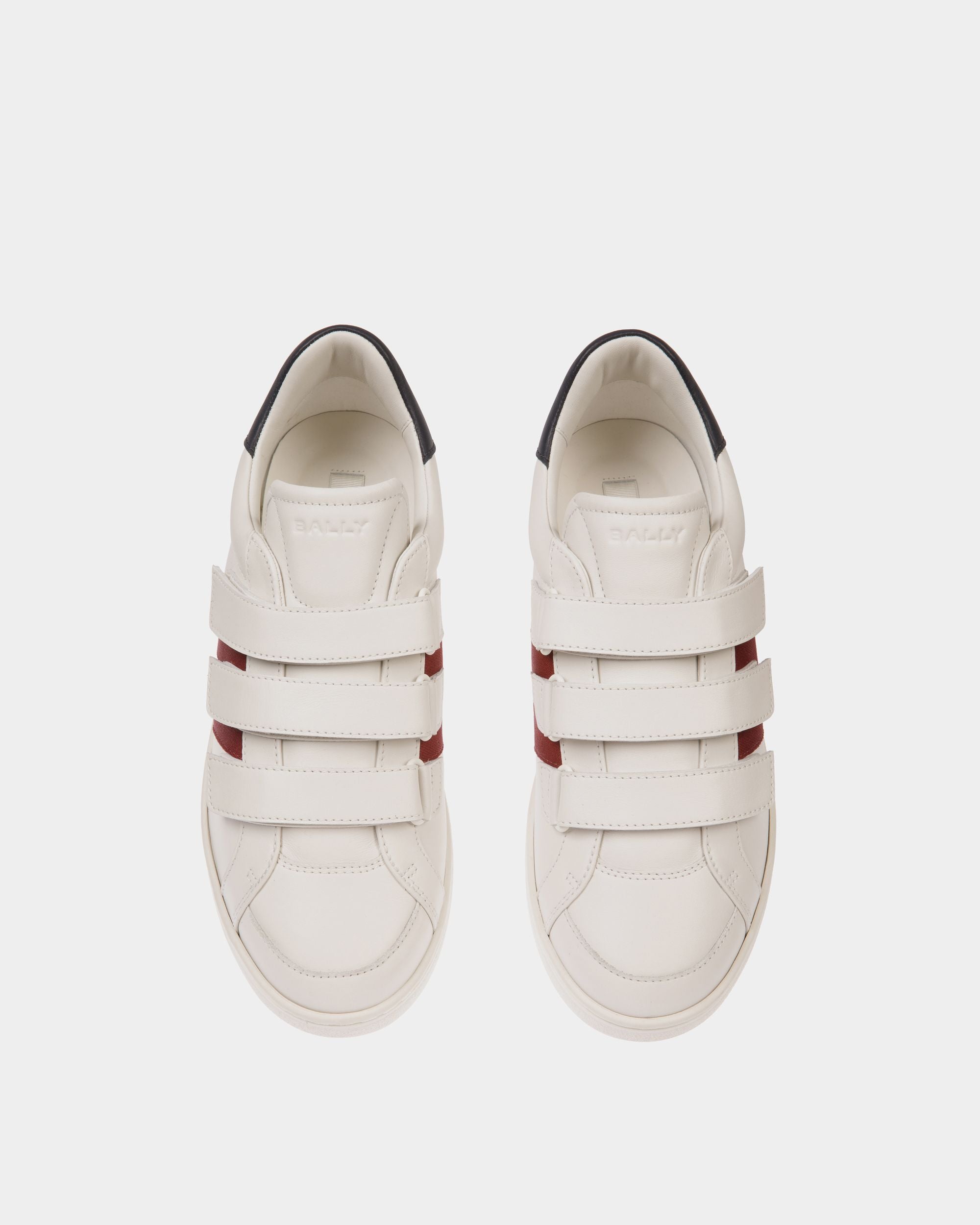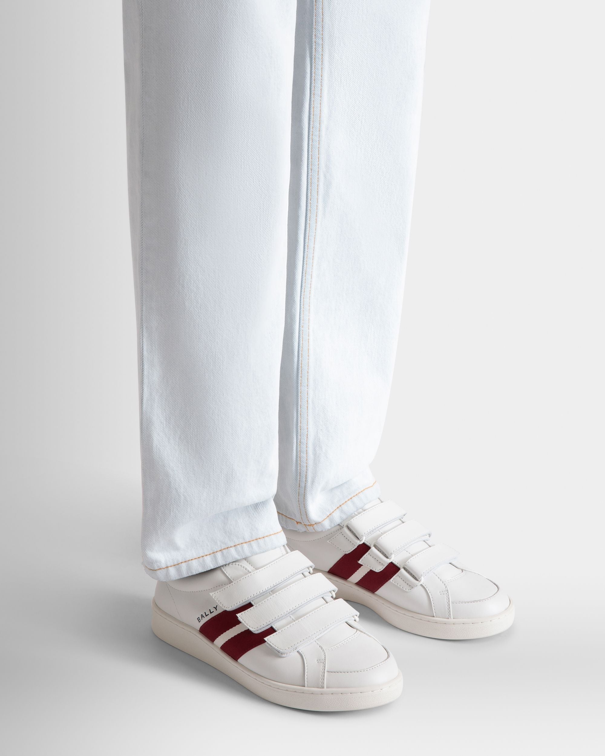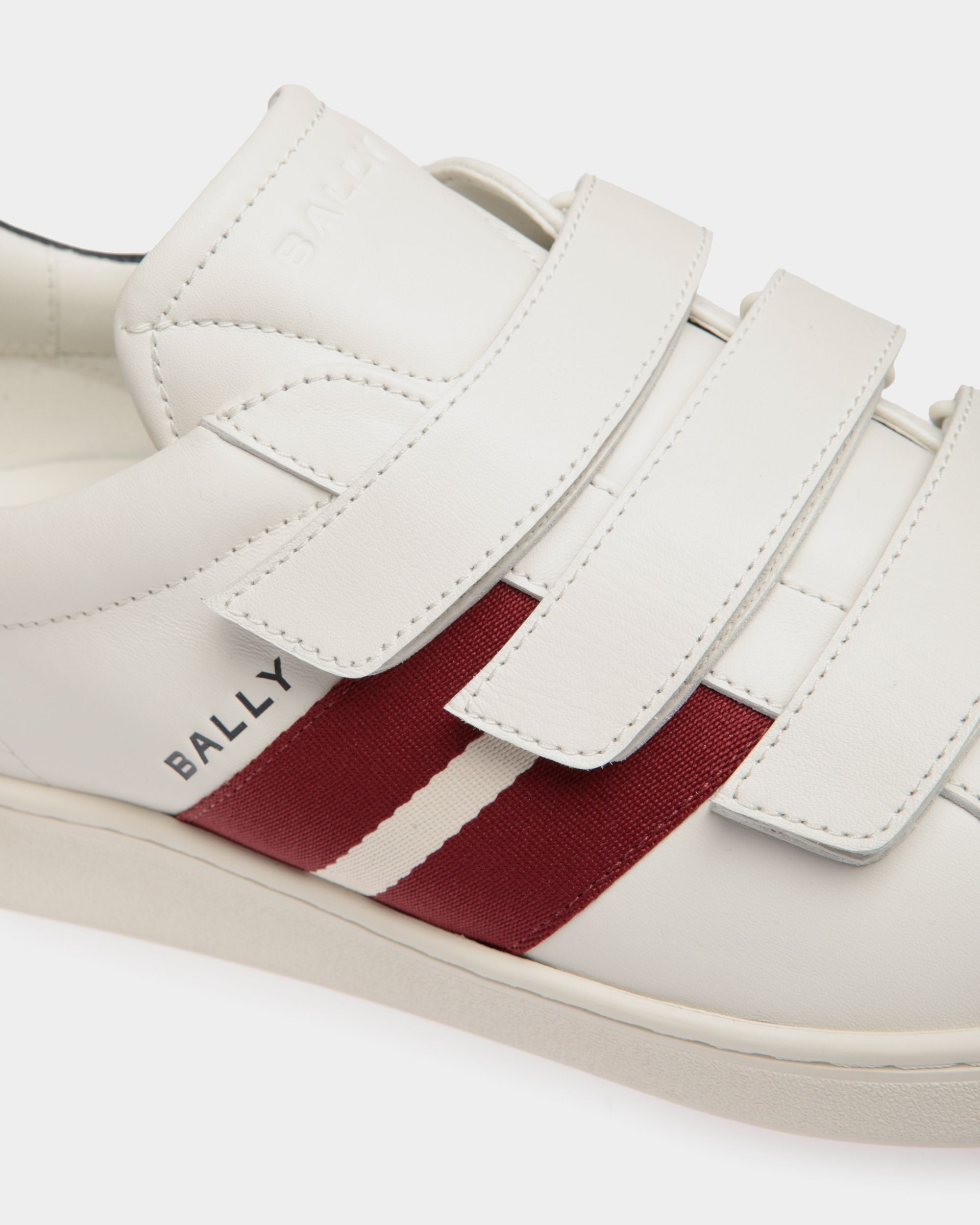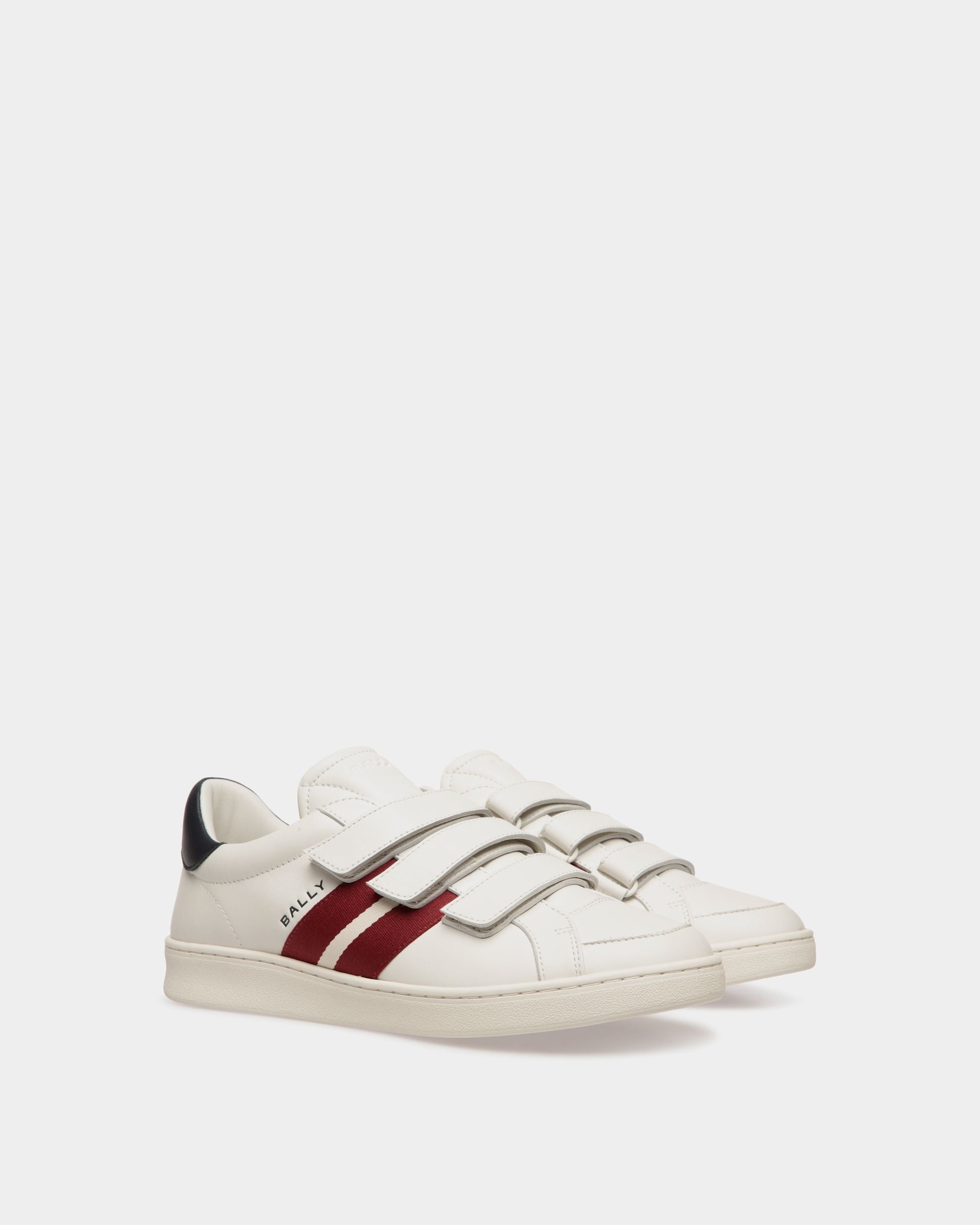 This round-toe sneaker reimagines a classic Tennis style with three Velcro straps. a red and white grosgrain Ribbon to the side. and a navy blue heel tab with a debossed Bally logo.