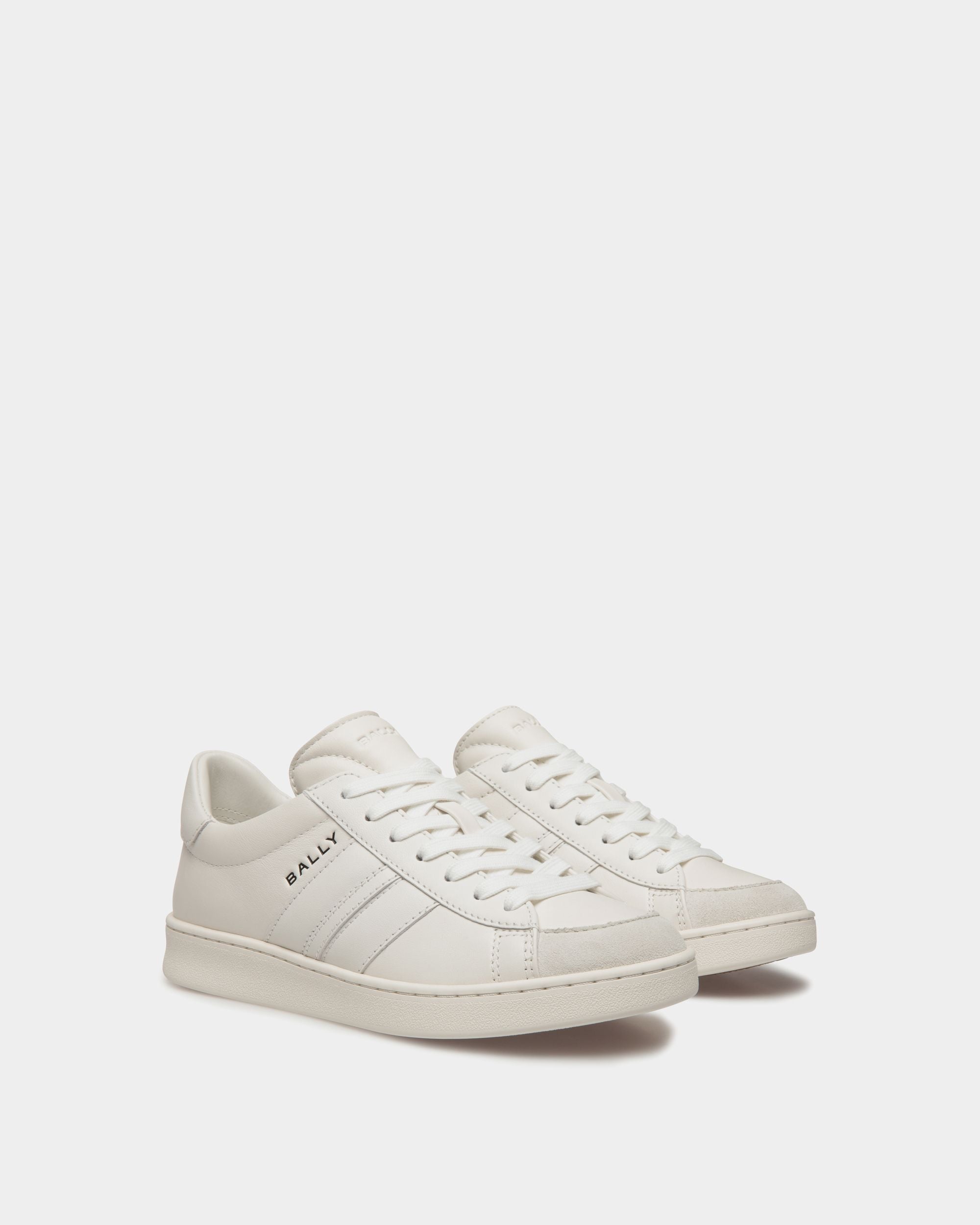 In white calfskin. the Tennis sneaker is decorated by an intarsia Bally ribbon and a debossed logo at the side. A rubber sole offers grip and comfort.