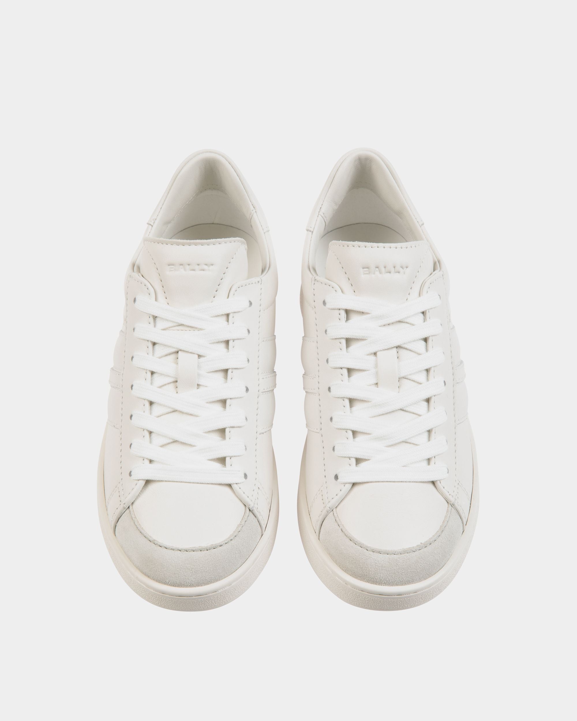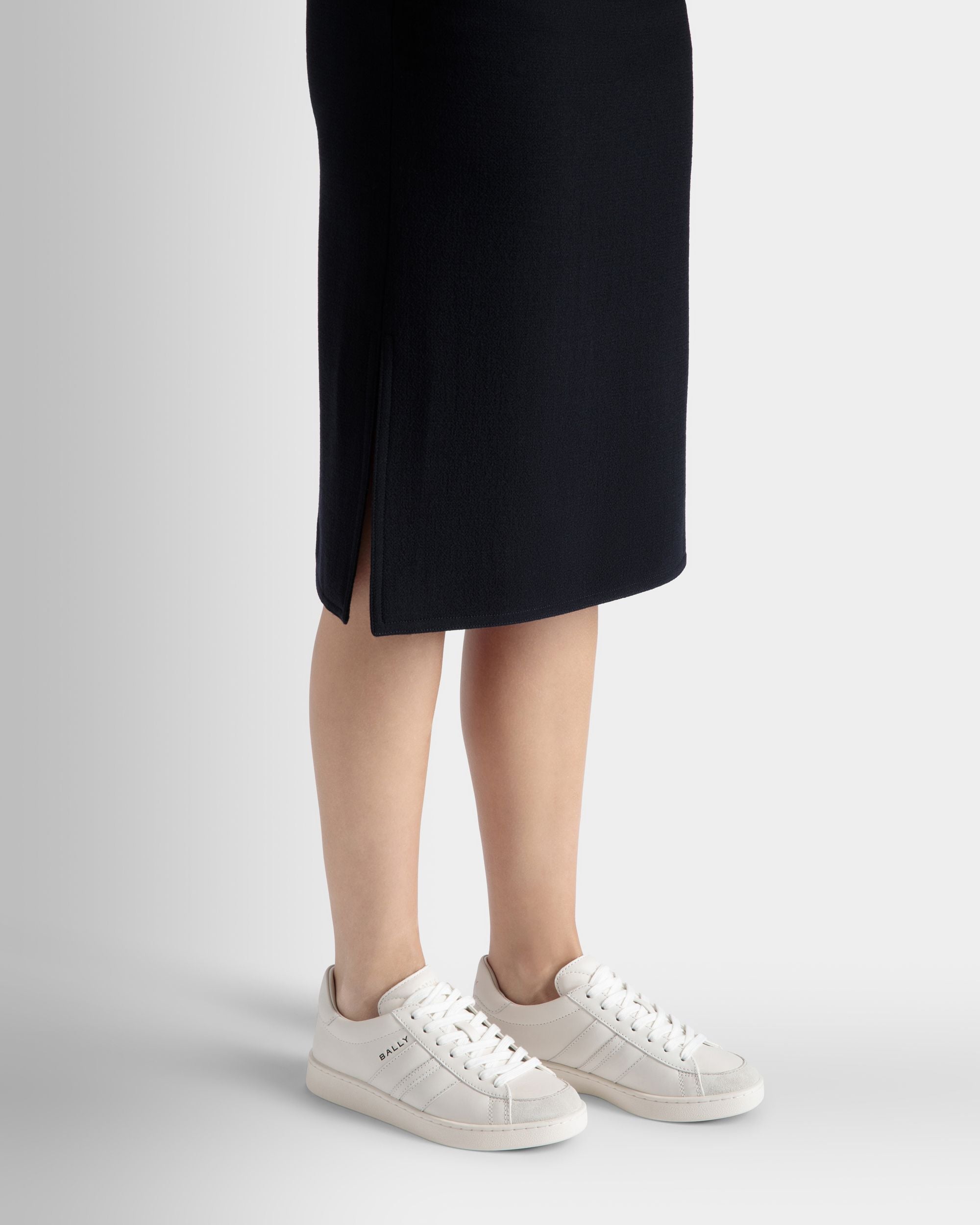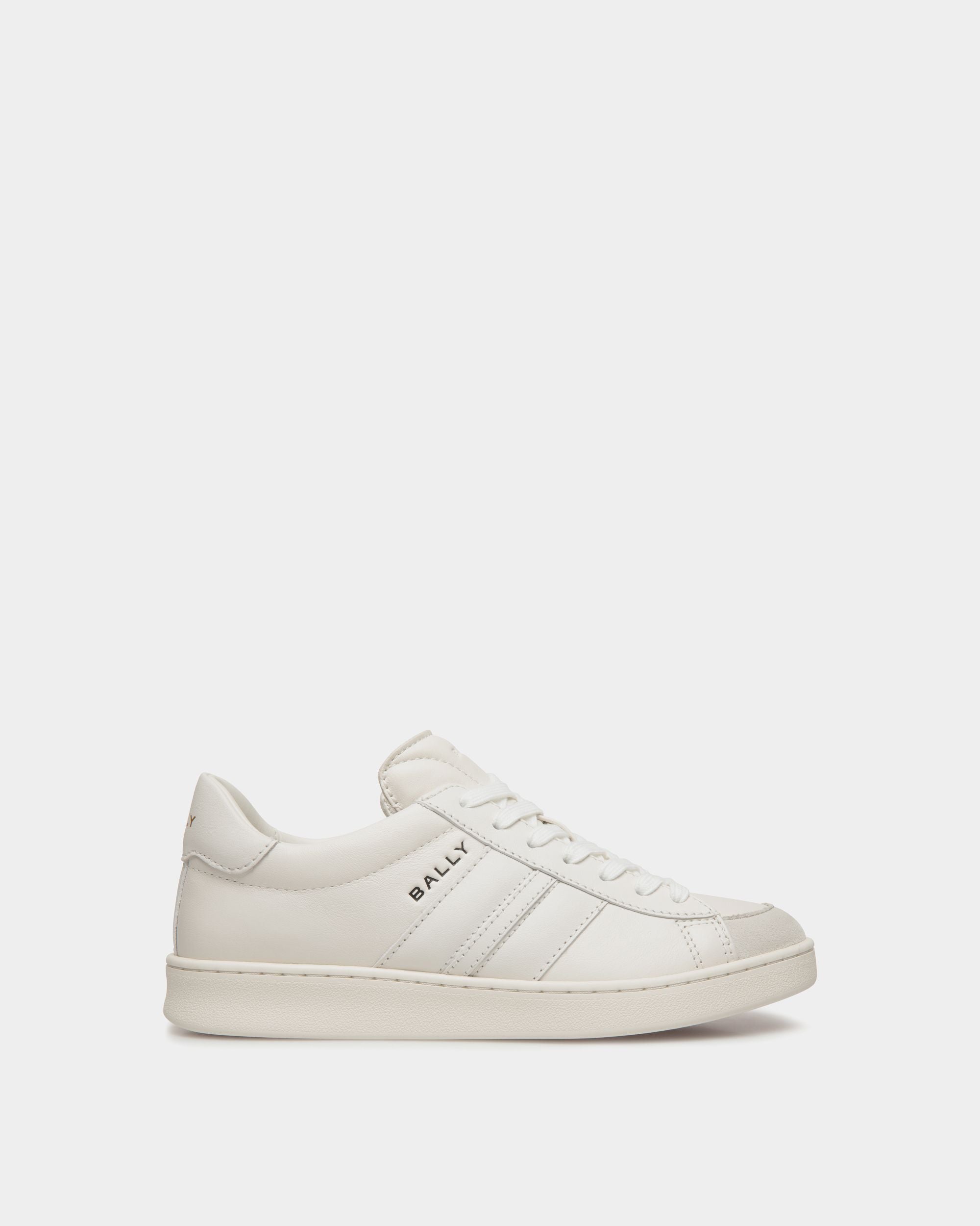 In white calfskin. the Tennis sneaker is decorated by an intarsia Bally ribbon and a debossed logo at the side. A rubber sole offers grip and comfort.