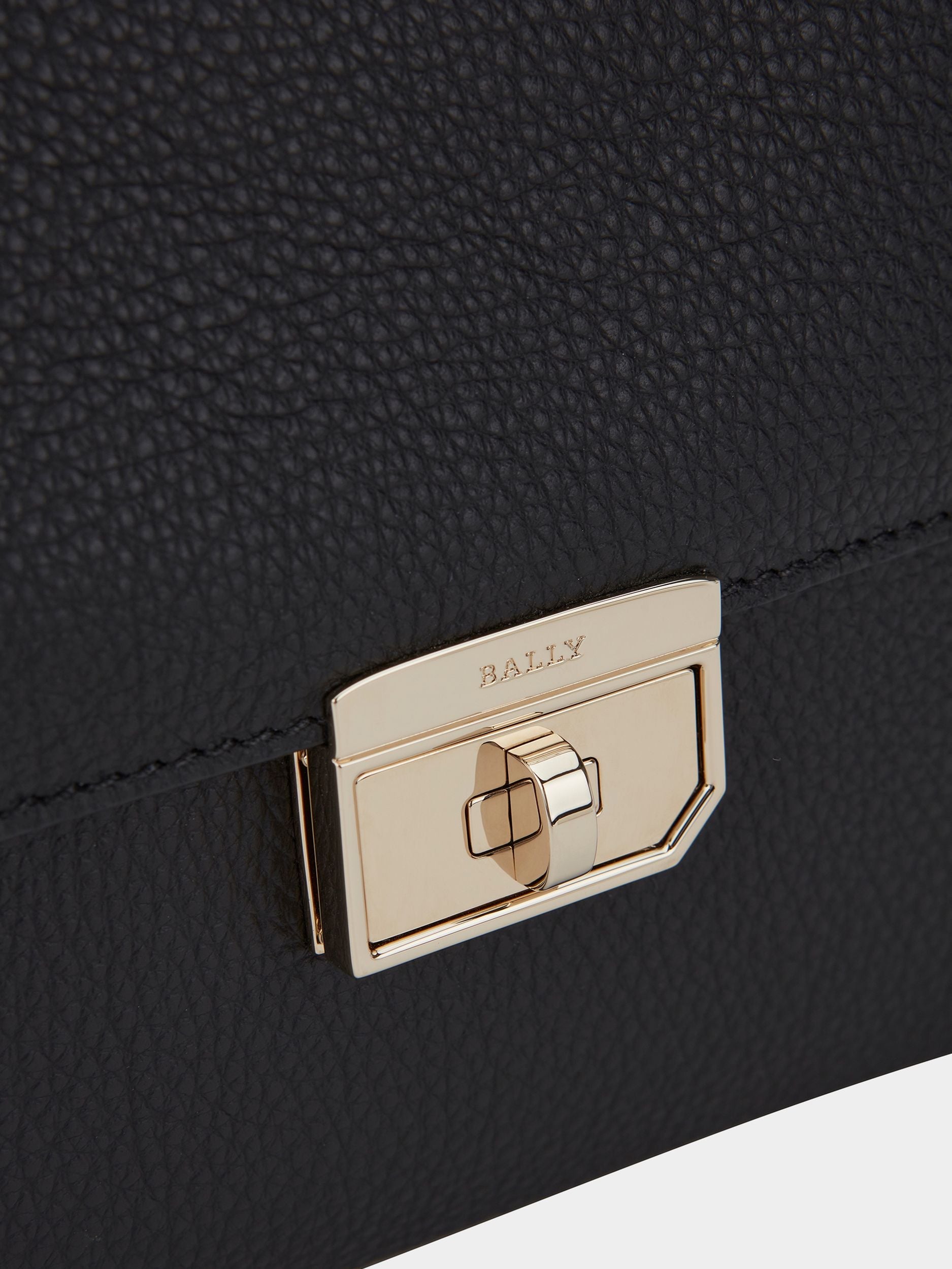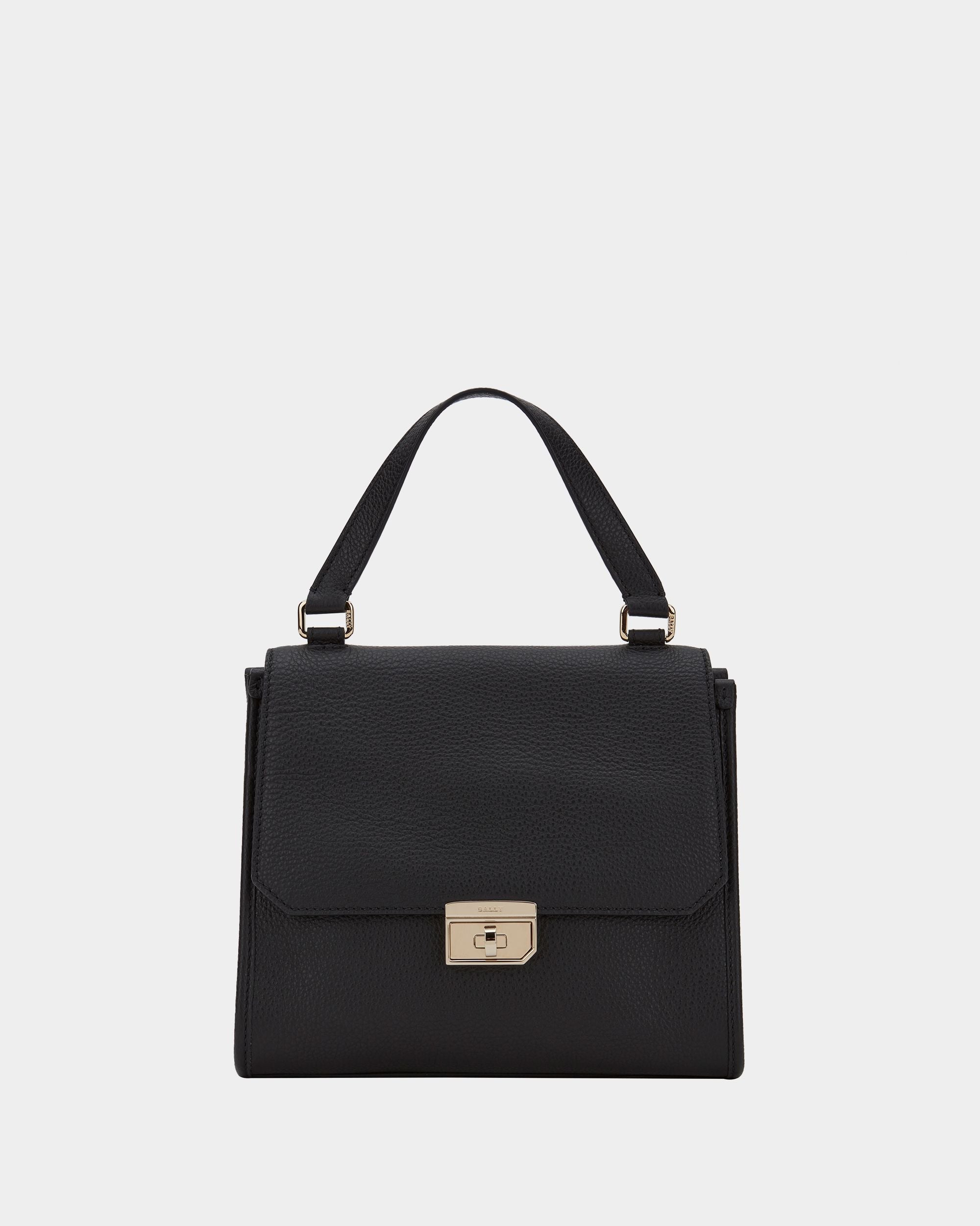 This top handle bag is made from grained leather. It fastens with a gold-tone metal clasp.