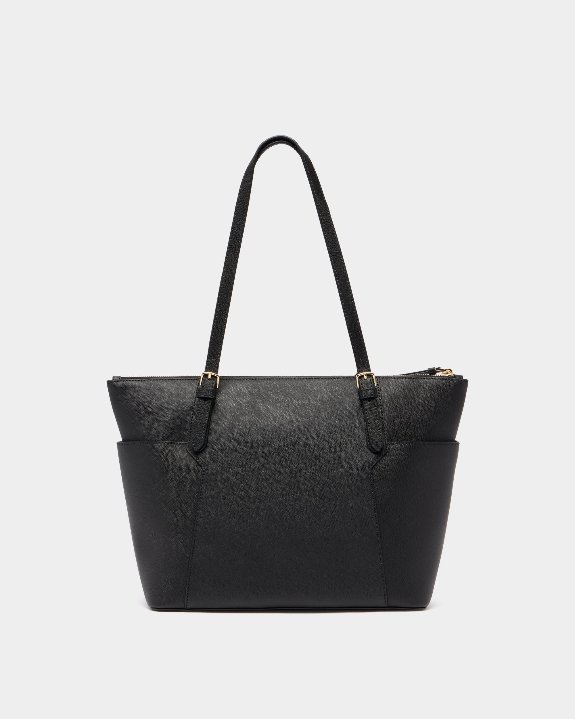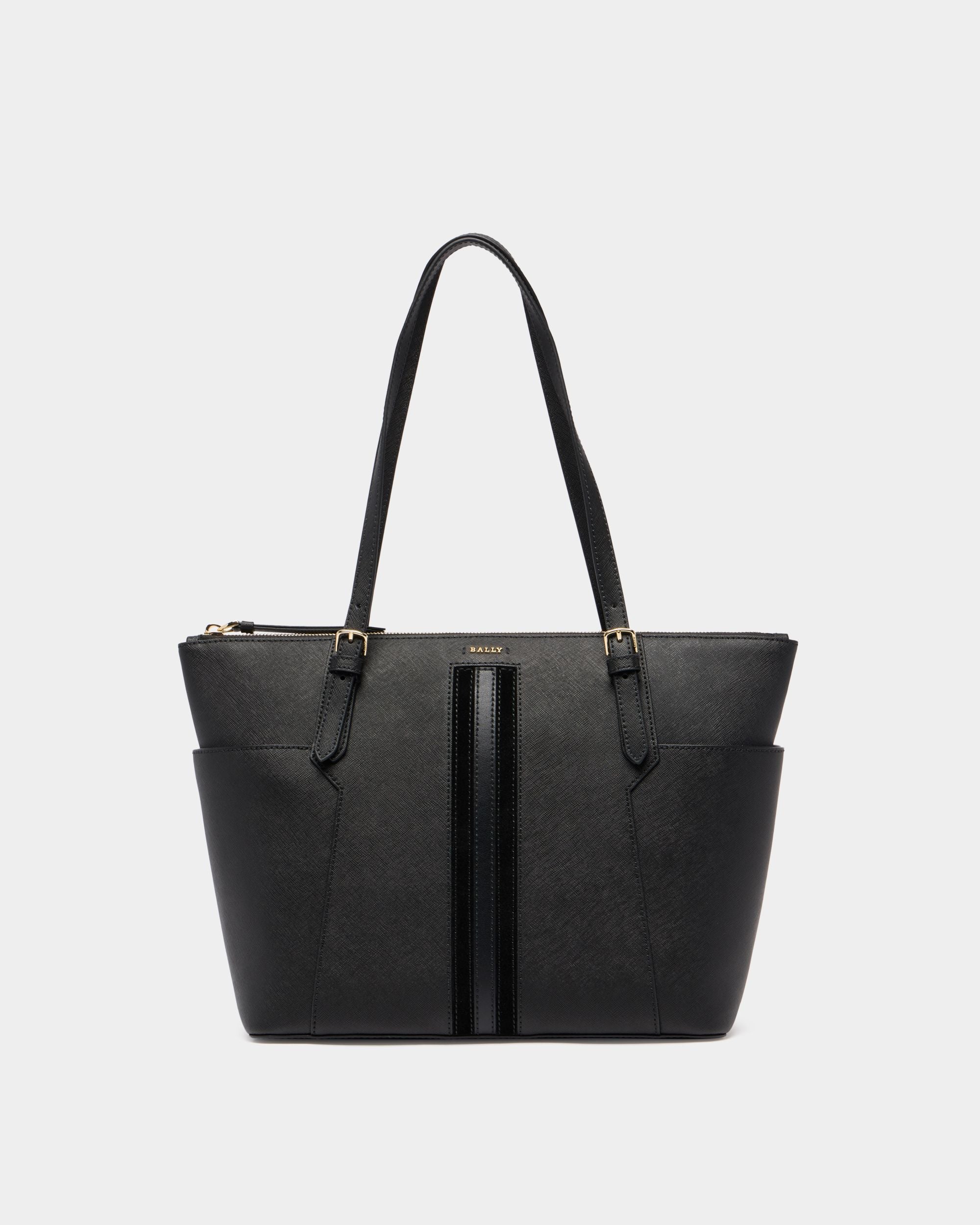 This tote bag in black textural leather is enriched with a chic tone-on-tone Bally Ribbon in leather inlay and gold-tone logo hardware to the front. Adjustable top handles ensure easy carry.