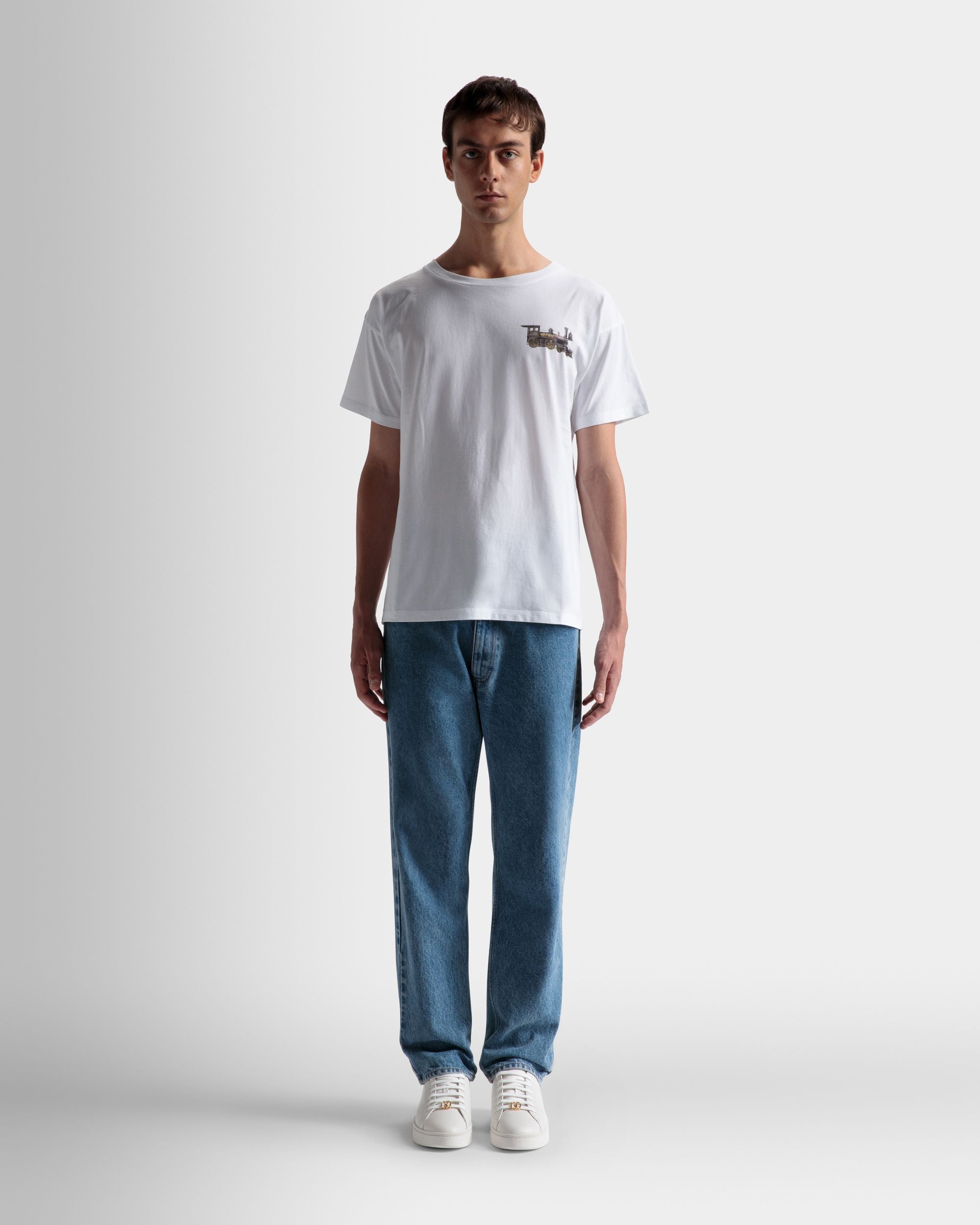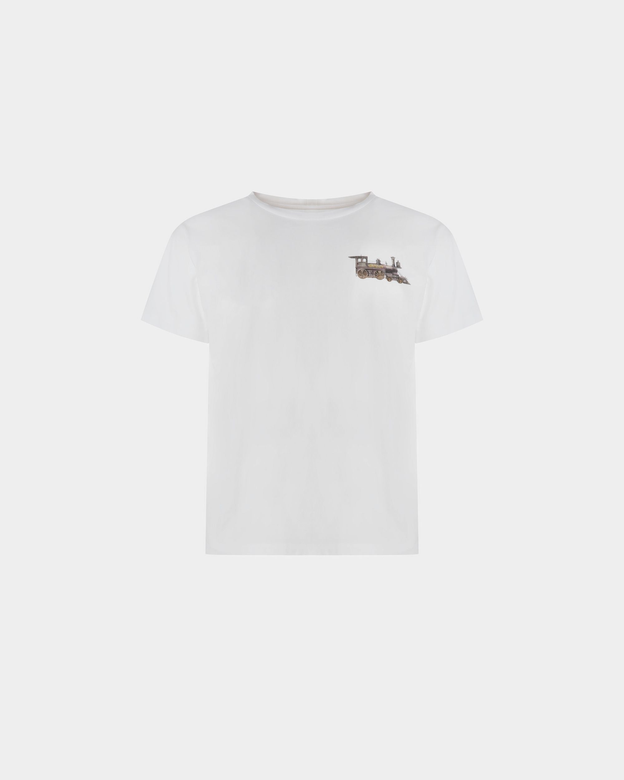 In 100% cotton. this classic crew neck T-shirt. seen here in white. is given a train motif to the chest.