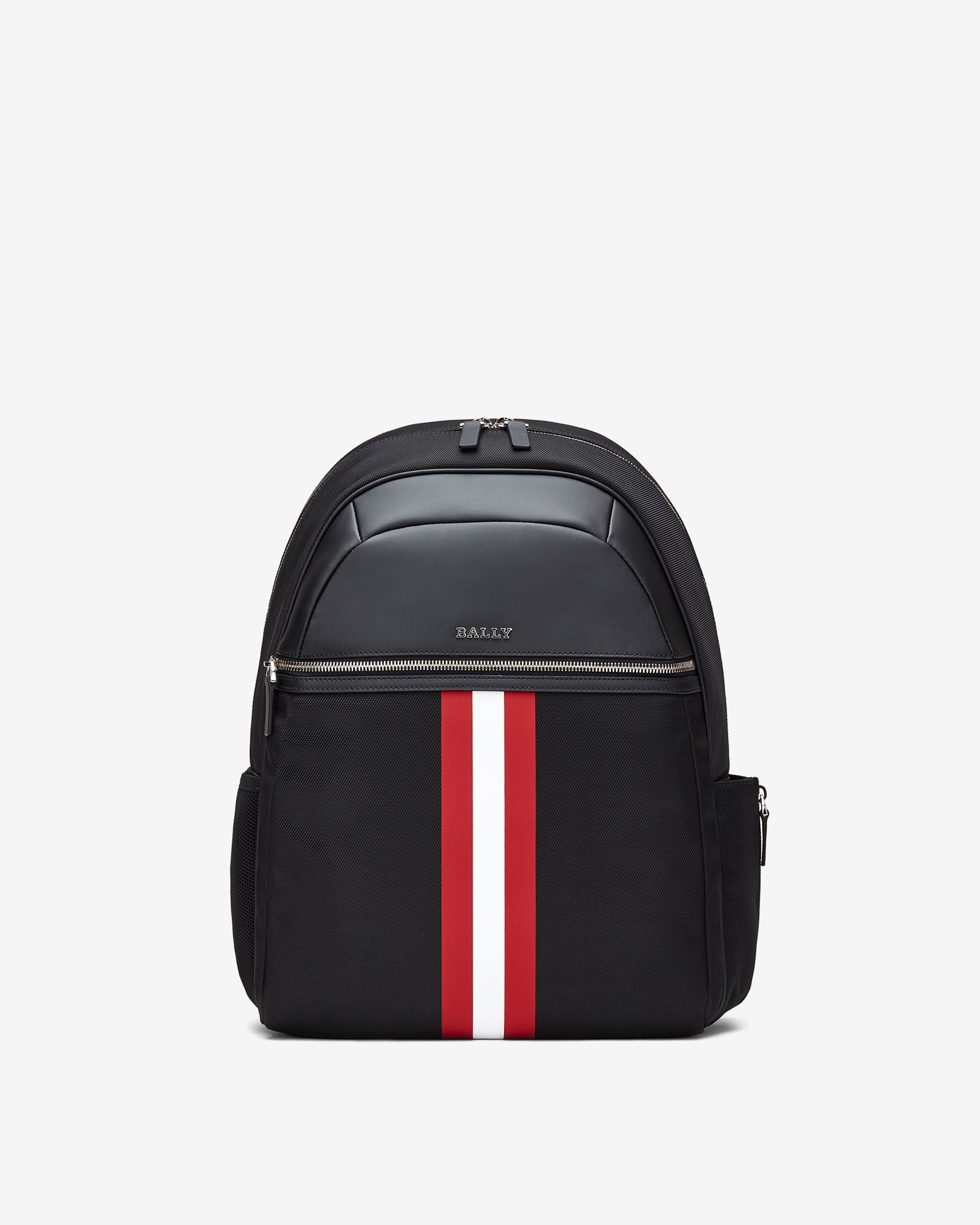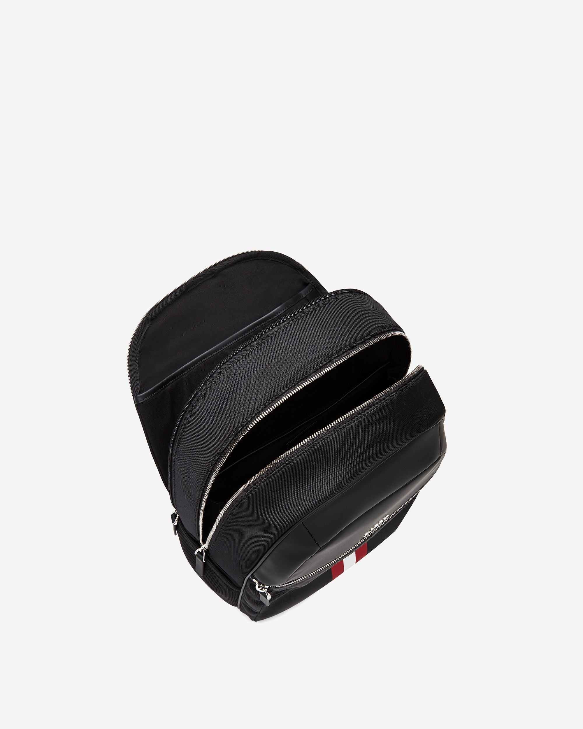 This Travel backpack is constructed in fine synthetic fabric with leather detailing and a Bally Ribbon to the front. A top handle. padded shoulder straps and multiple pockets ensure effortless practicality.