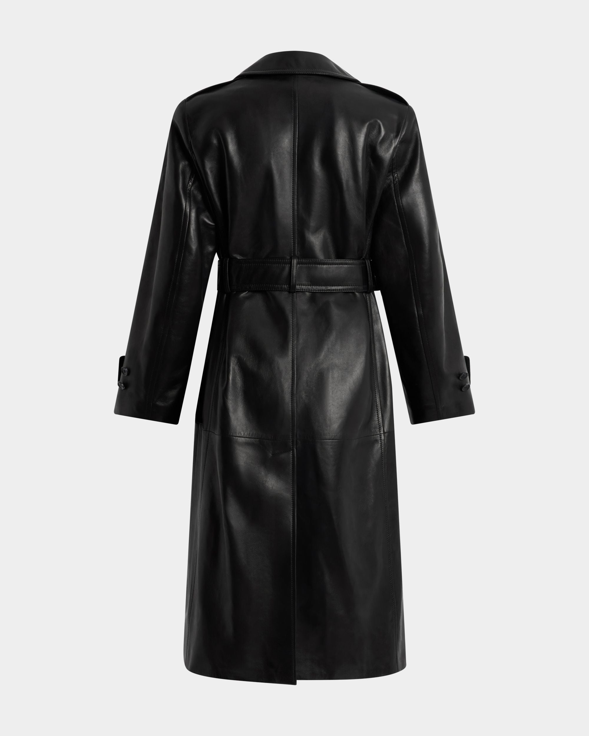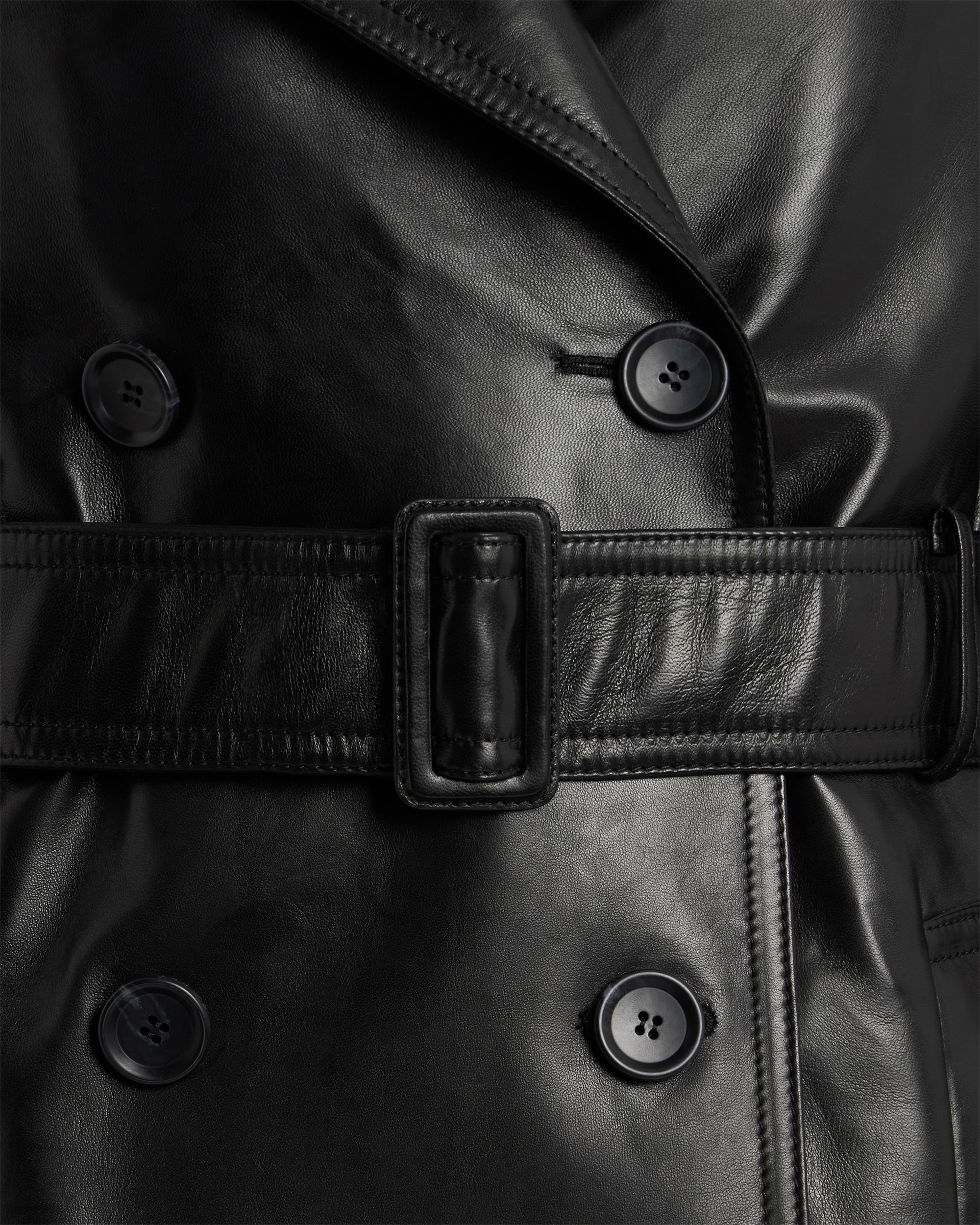 This chic double-breasted trench coat is in soft black lambskin with a nappa-effect finish. The notched lapel conceals a detachable neck guard to keep the cold out and warmth in. A self-belt with a leather-covered buckle adjusts the silhouette.