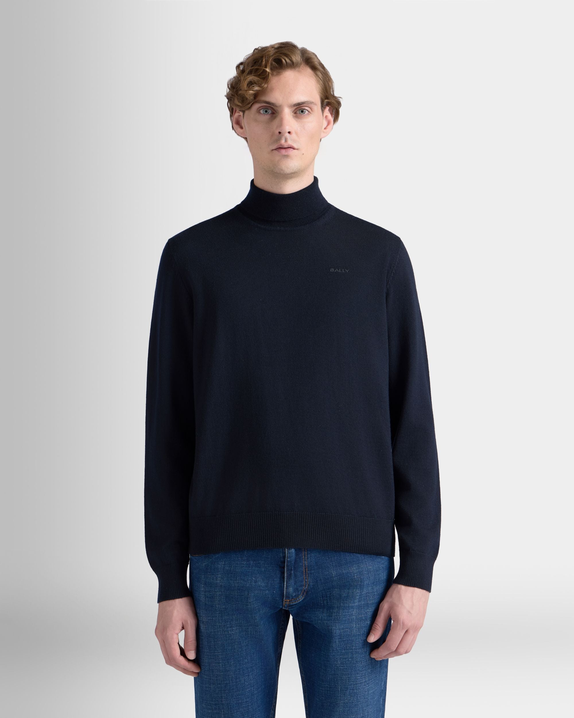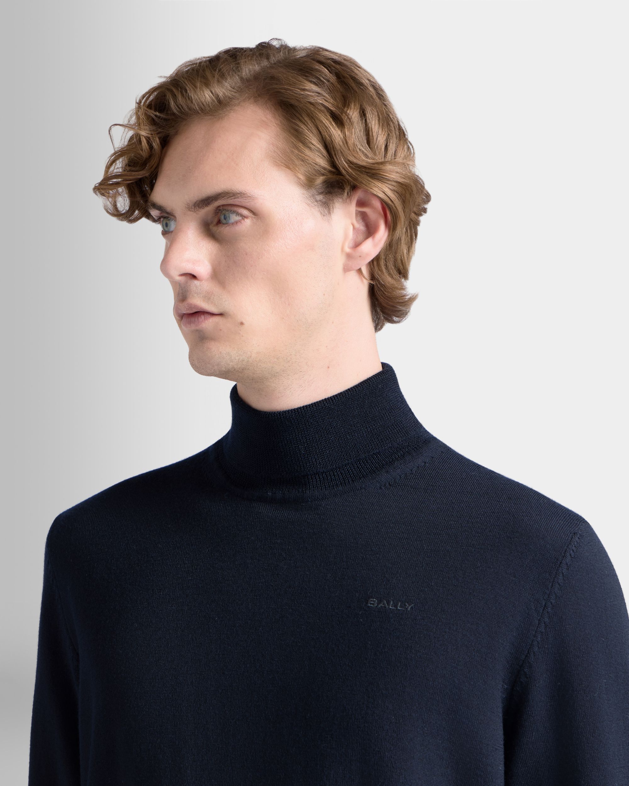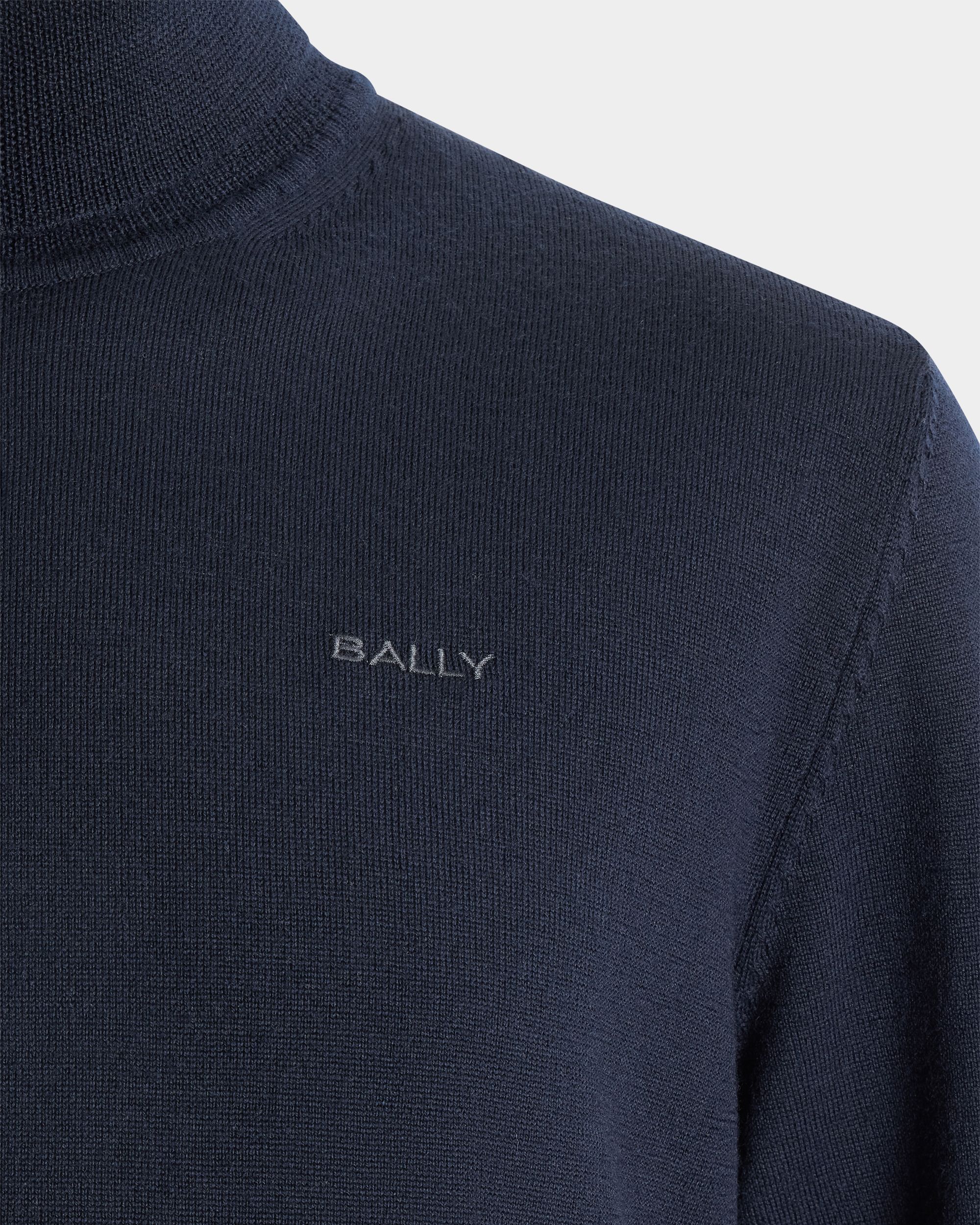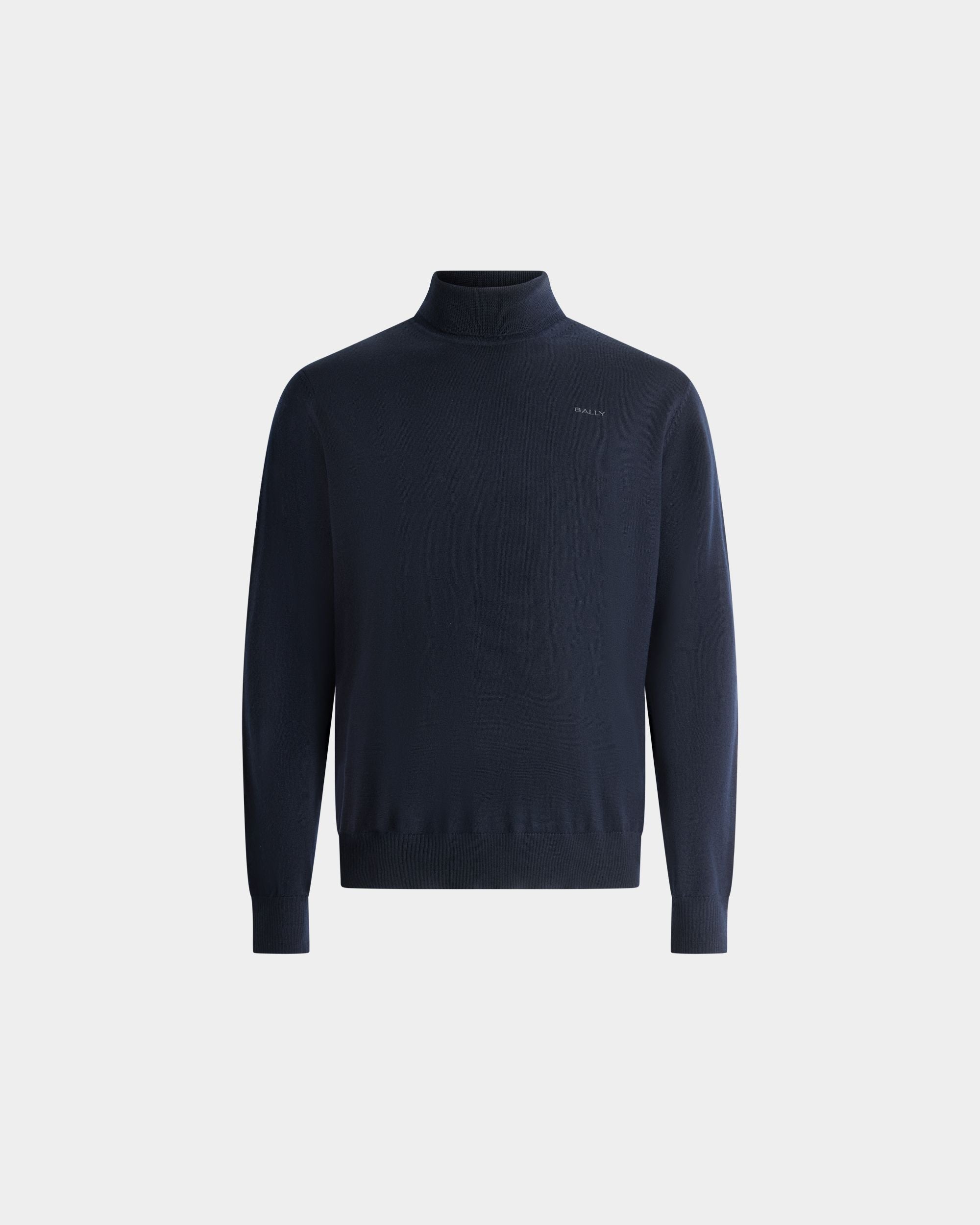 This classic turtleneck sweater in navy blue wool is finished with a tonal embroidered Bally logo on the left chest.
