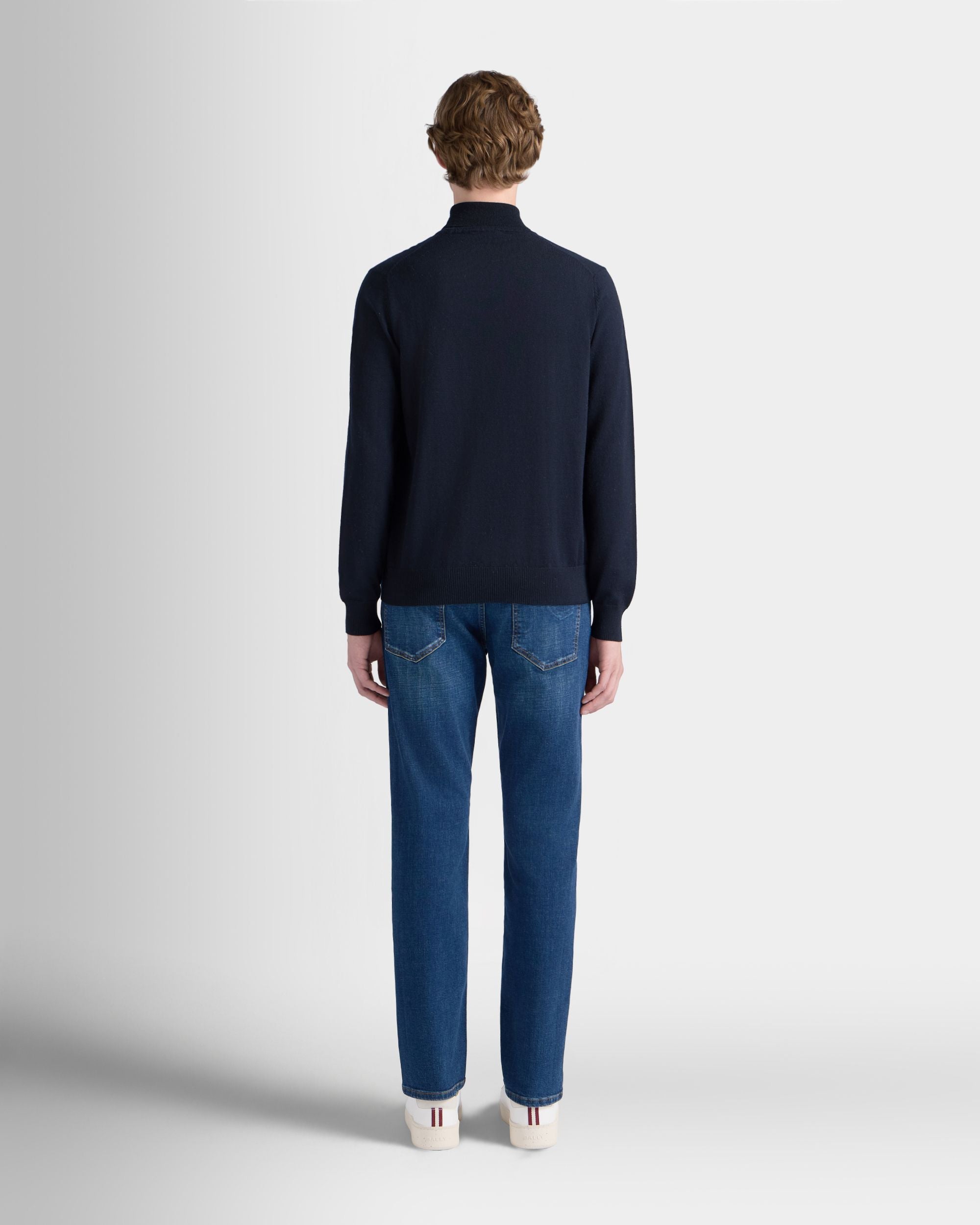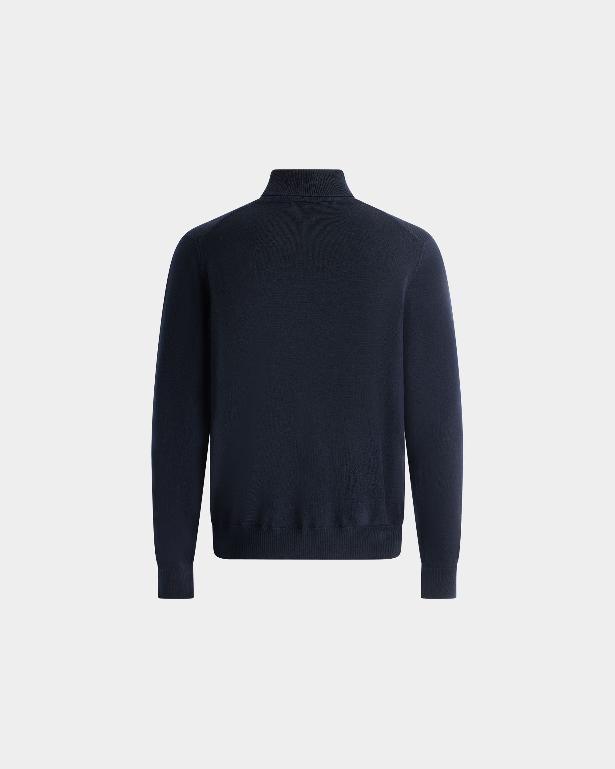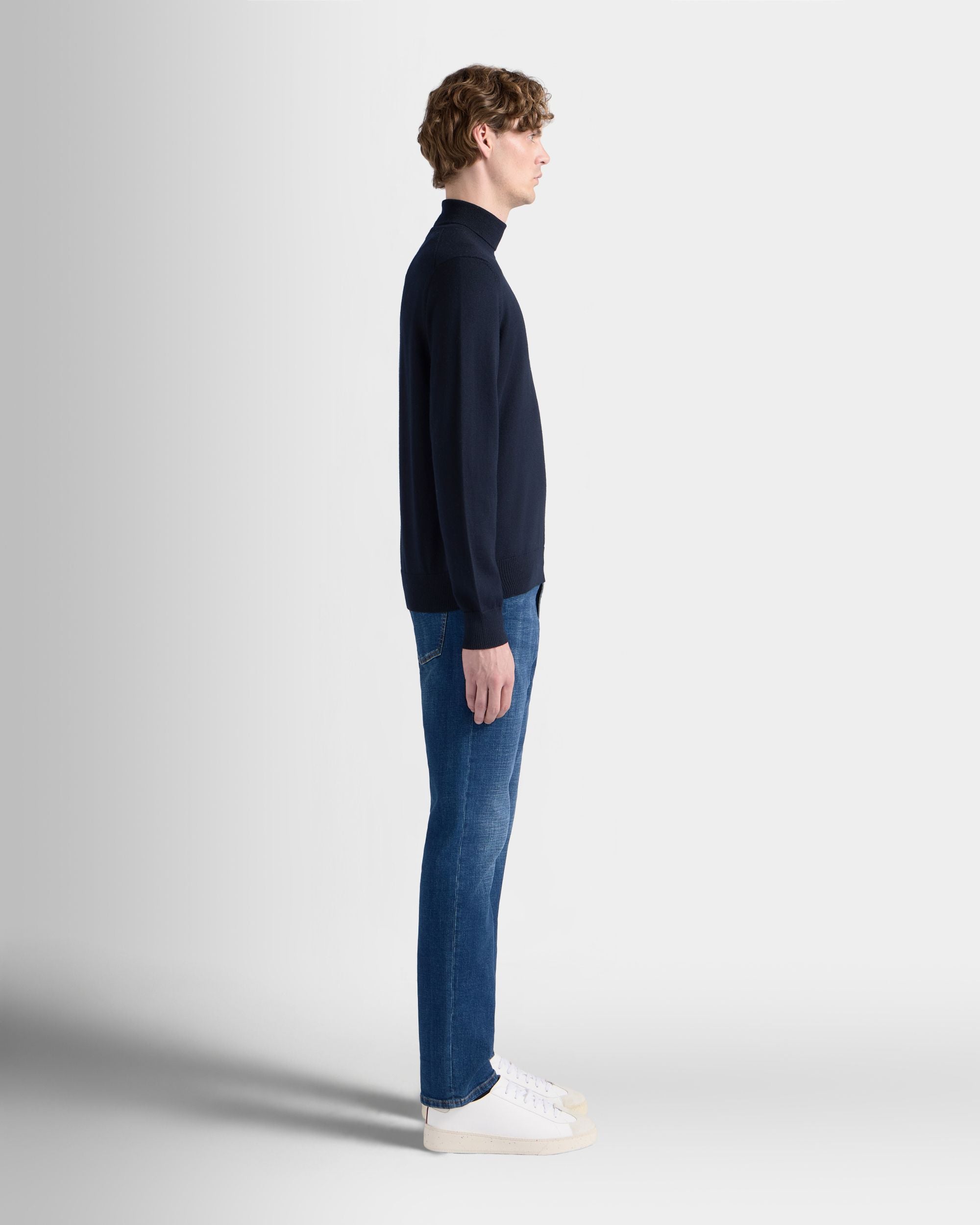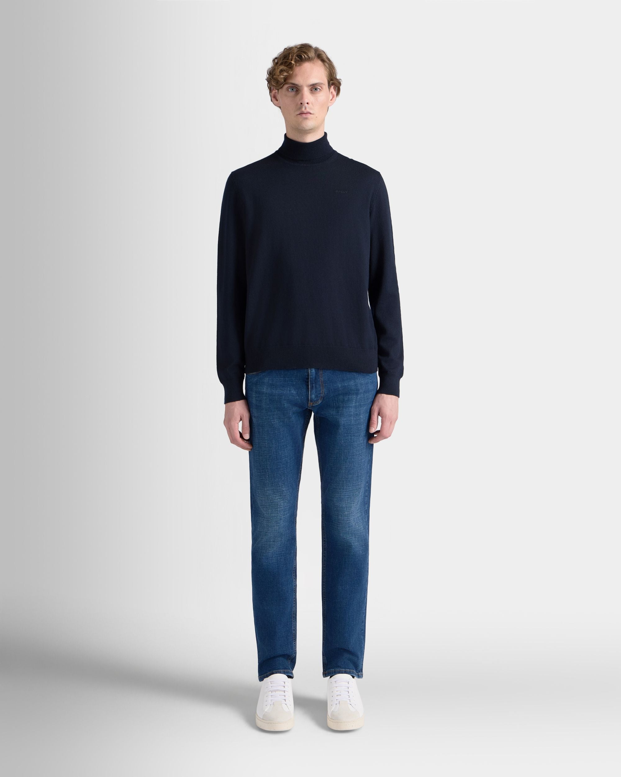 This classic turtleneck sweater in navy blue wool is finished with a tonal embroidered Bally logo on the left chest.