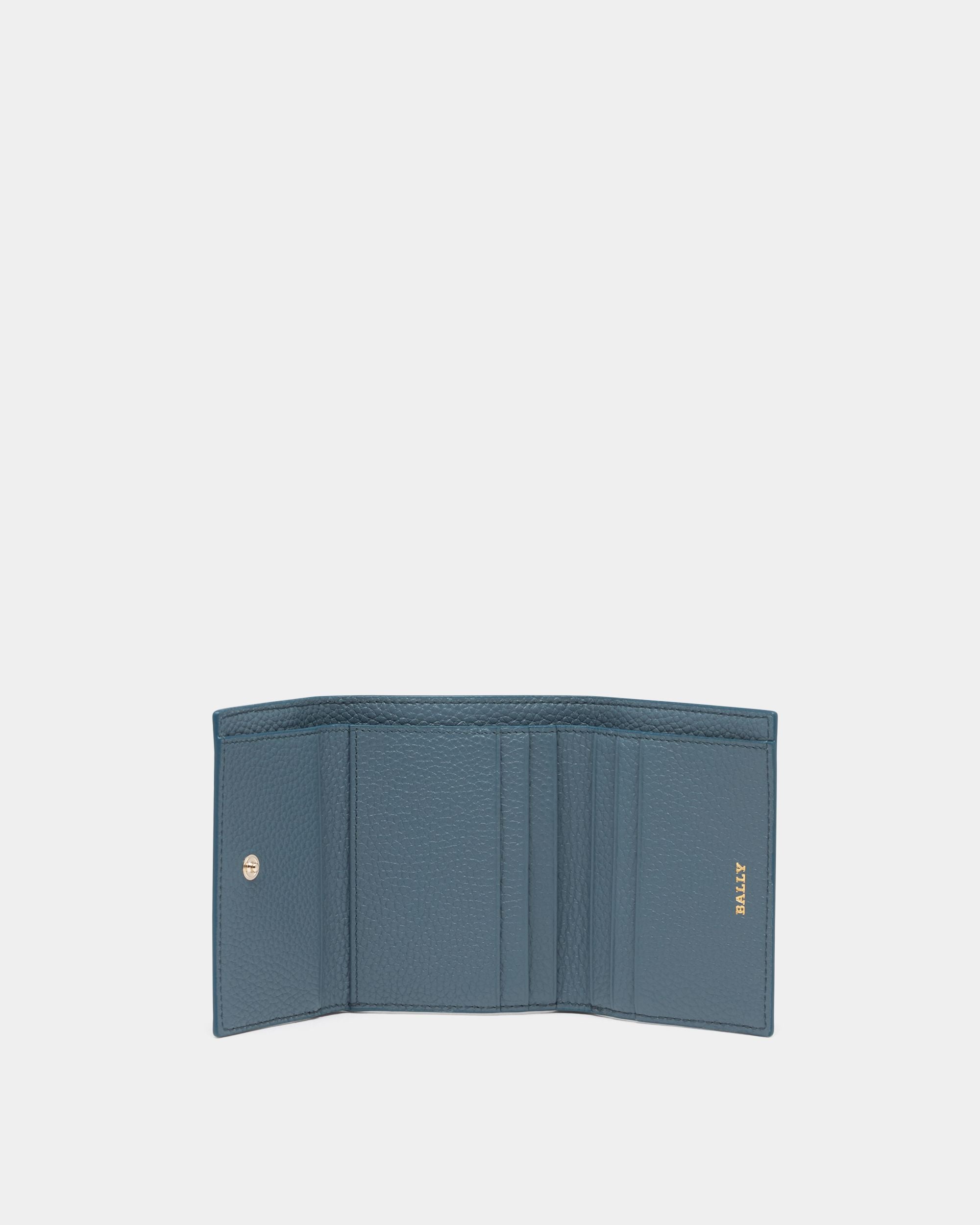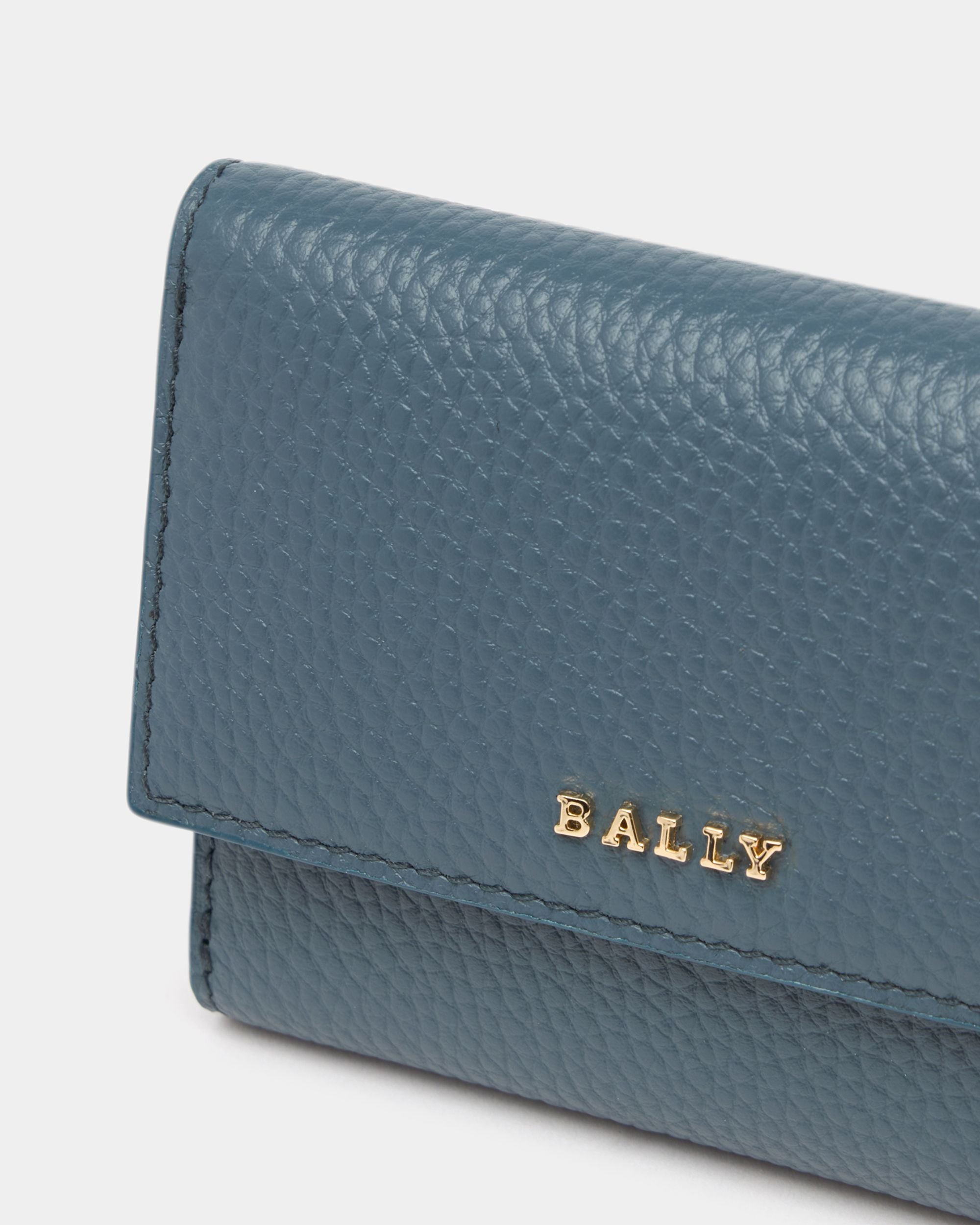 This simple and elegant wallet is meticulously crafted in blue calfskin with a grained finish. A gold-tone metal Bally logo decorates the front snap closure.