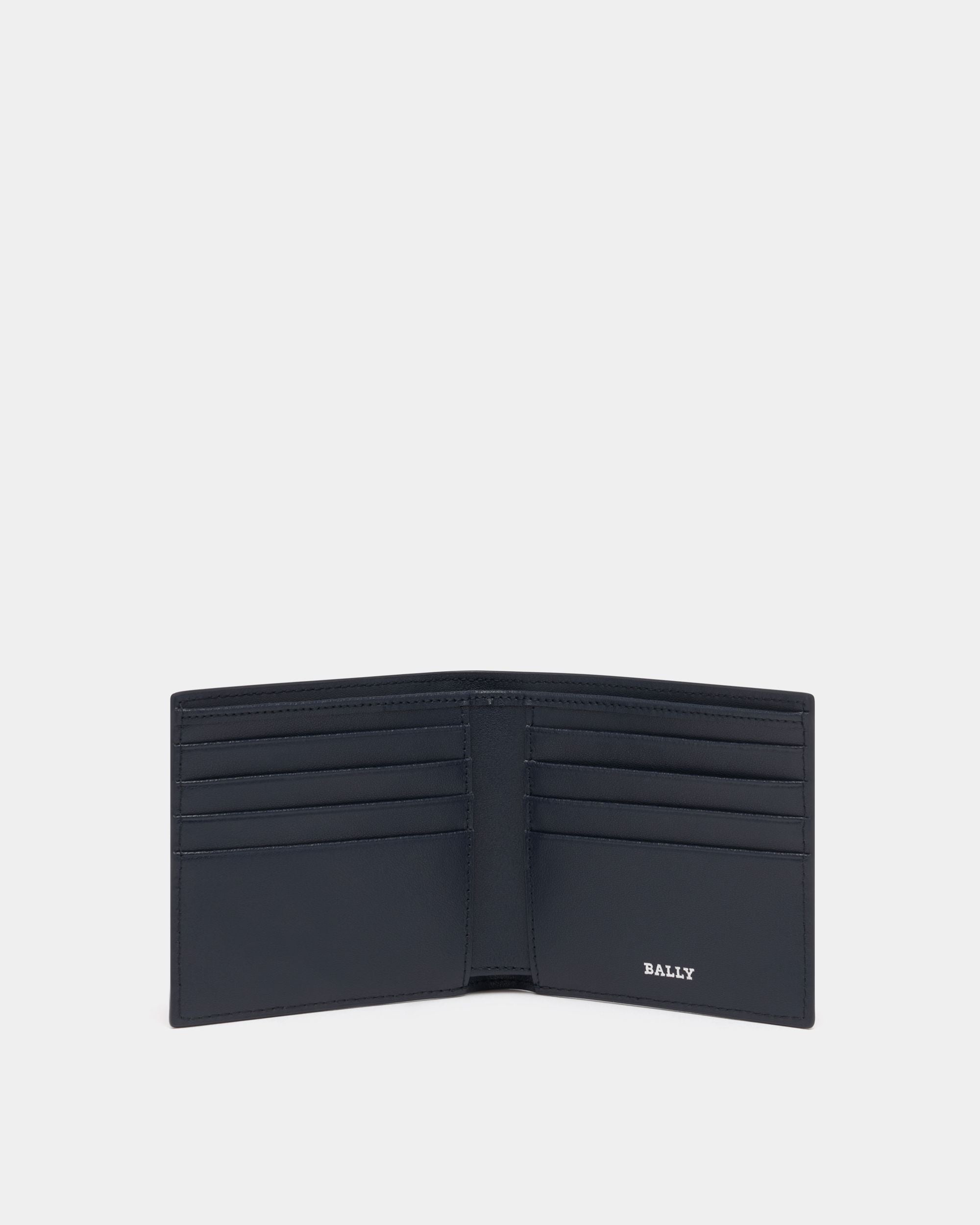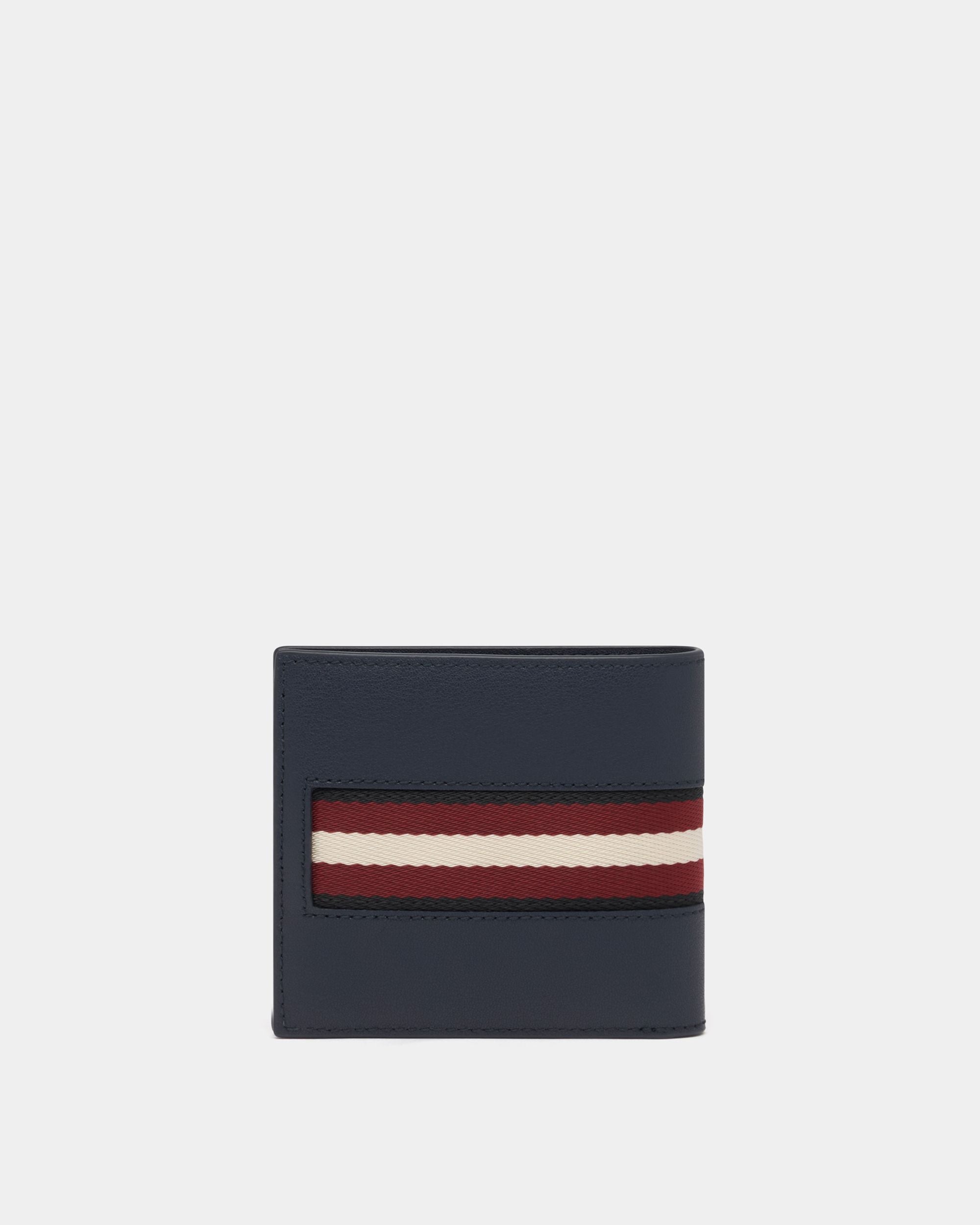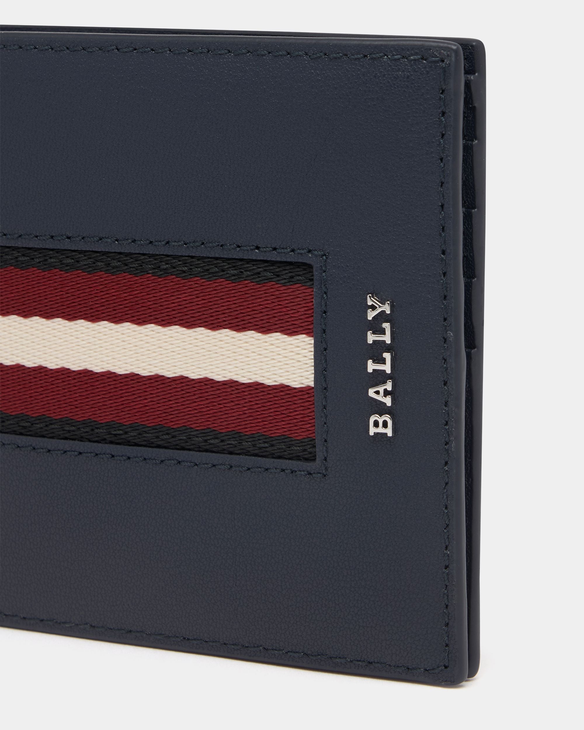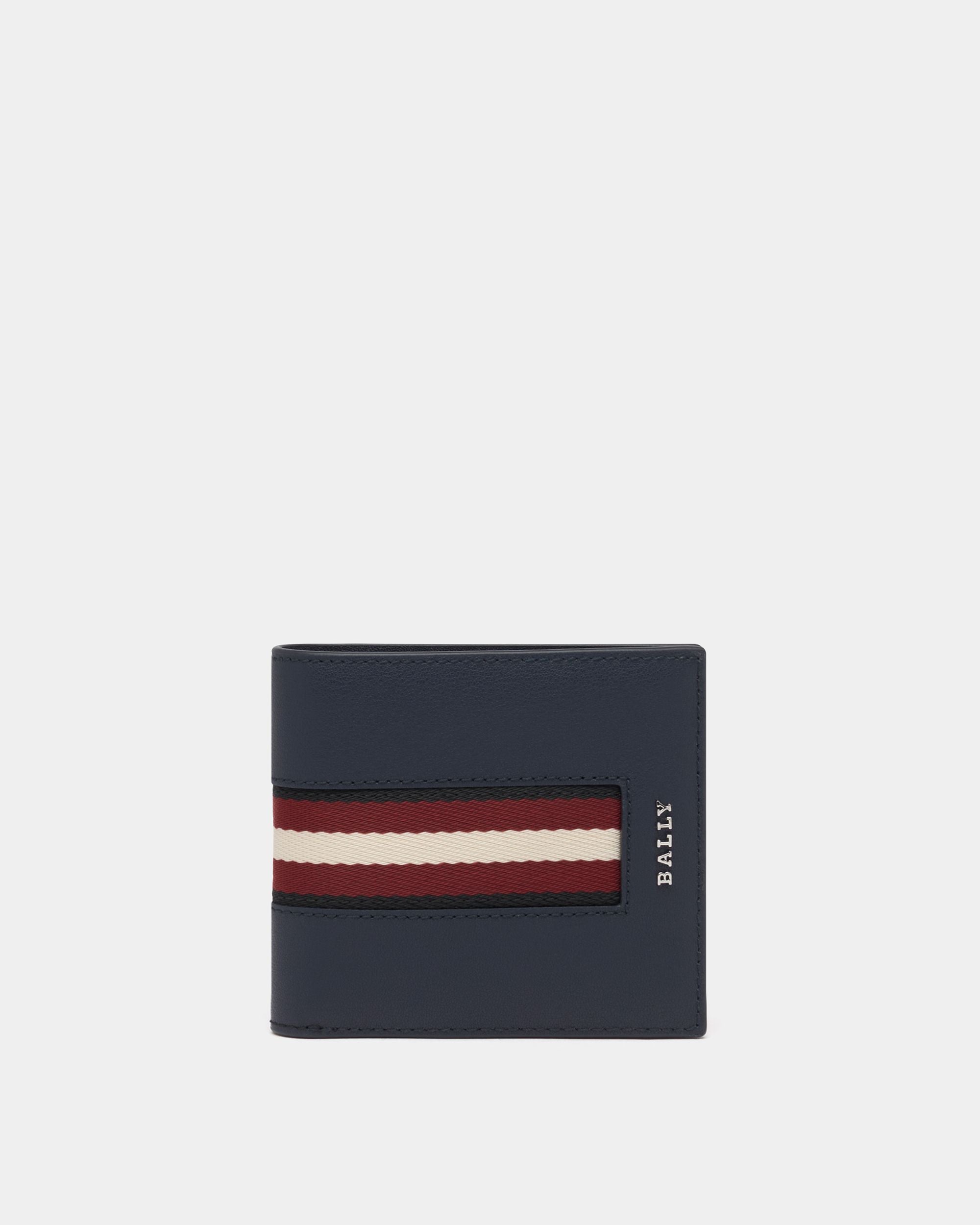 This wallet in navy blue leather is decorated by a Bally Ribbon in grosgrain and a metal Bally logo.