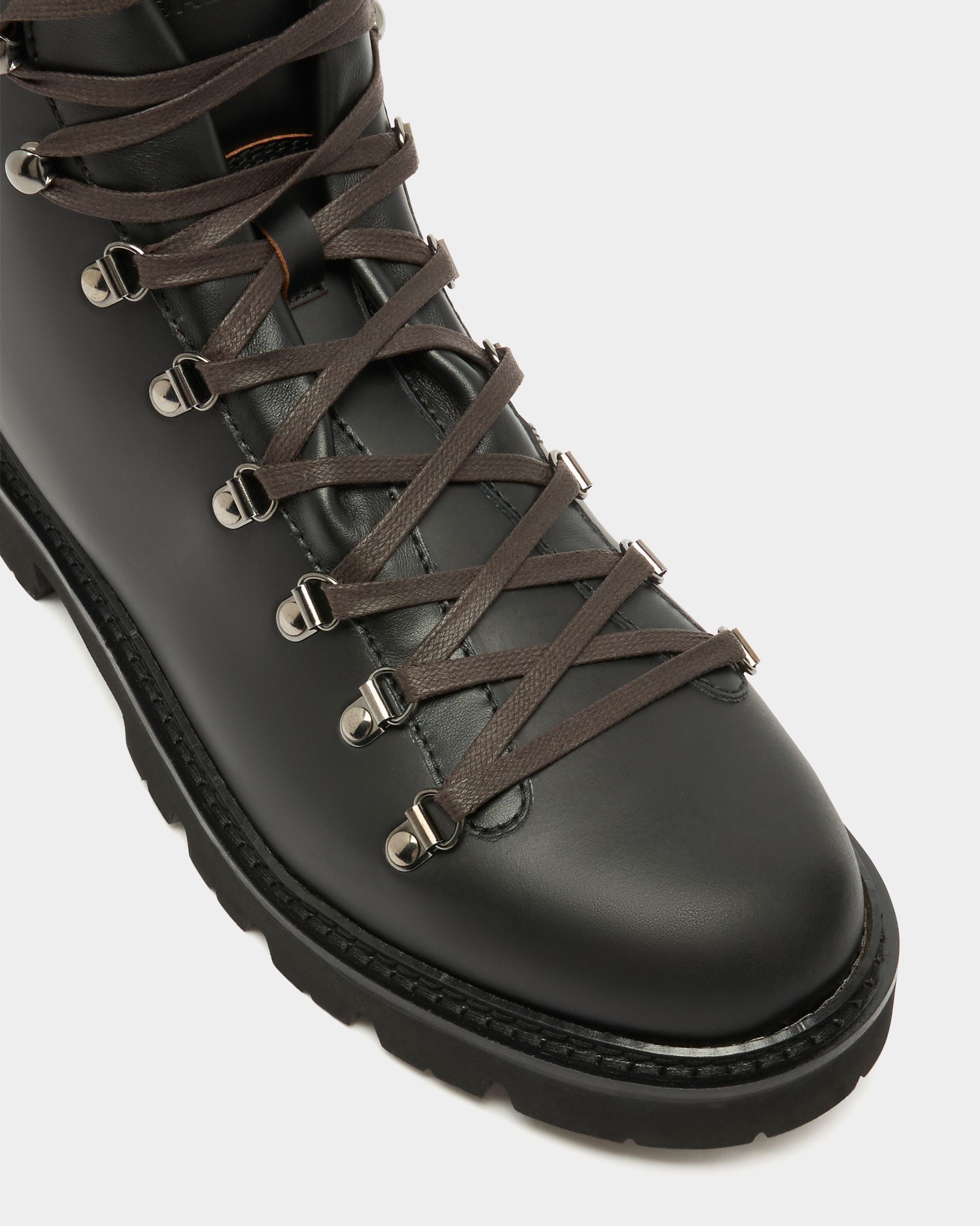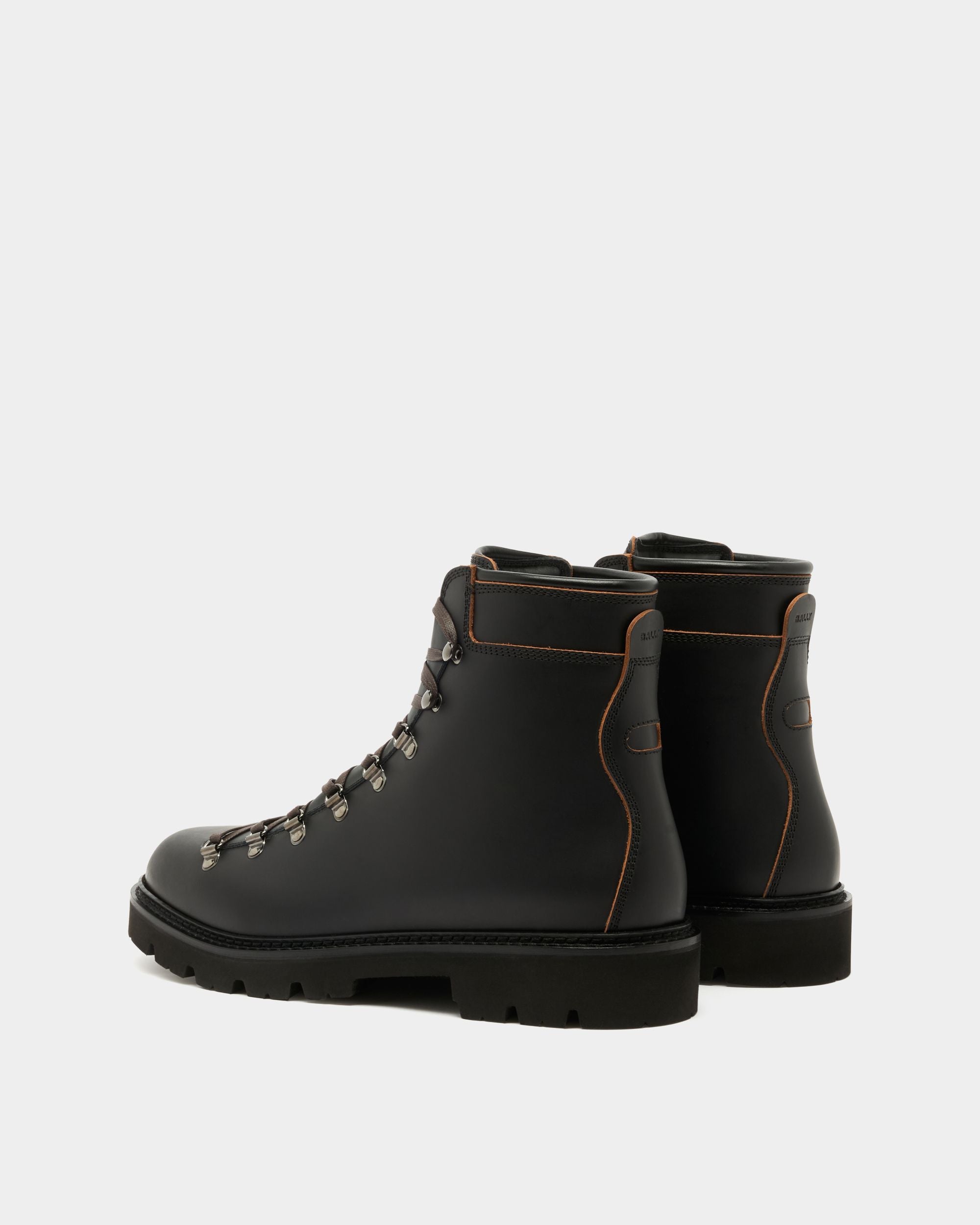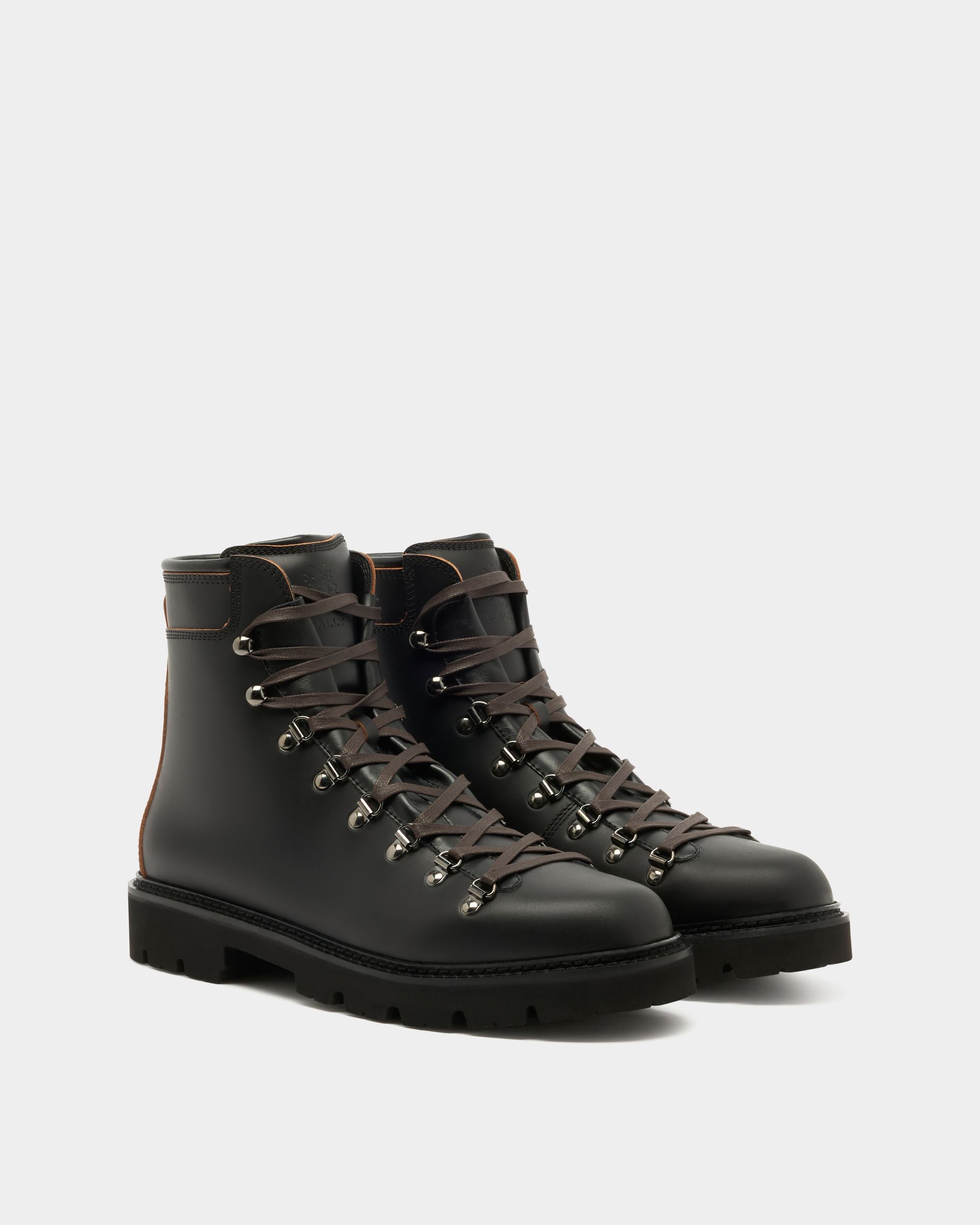 A modern reinterpretation of a 1954 archival design. this round-toe Wandern boot in black calf leather features hiking-inspired elements and a no-slip chunky rubber sole.