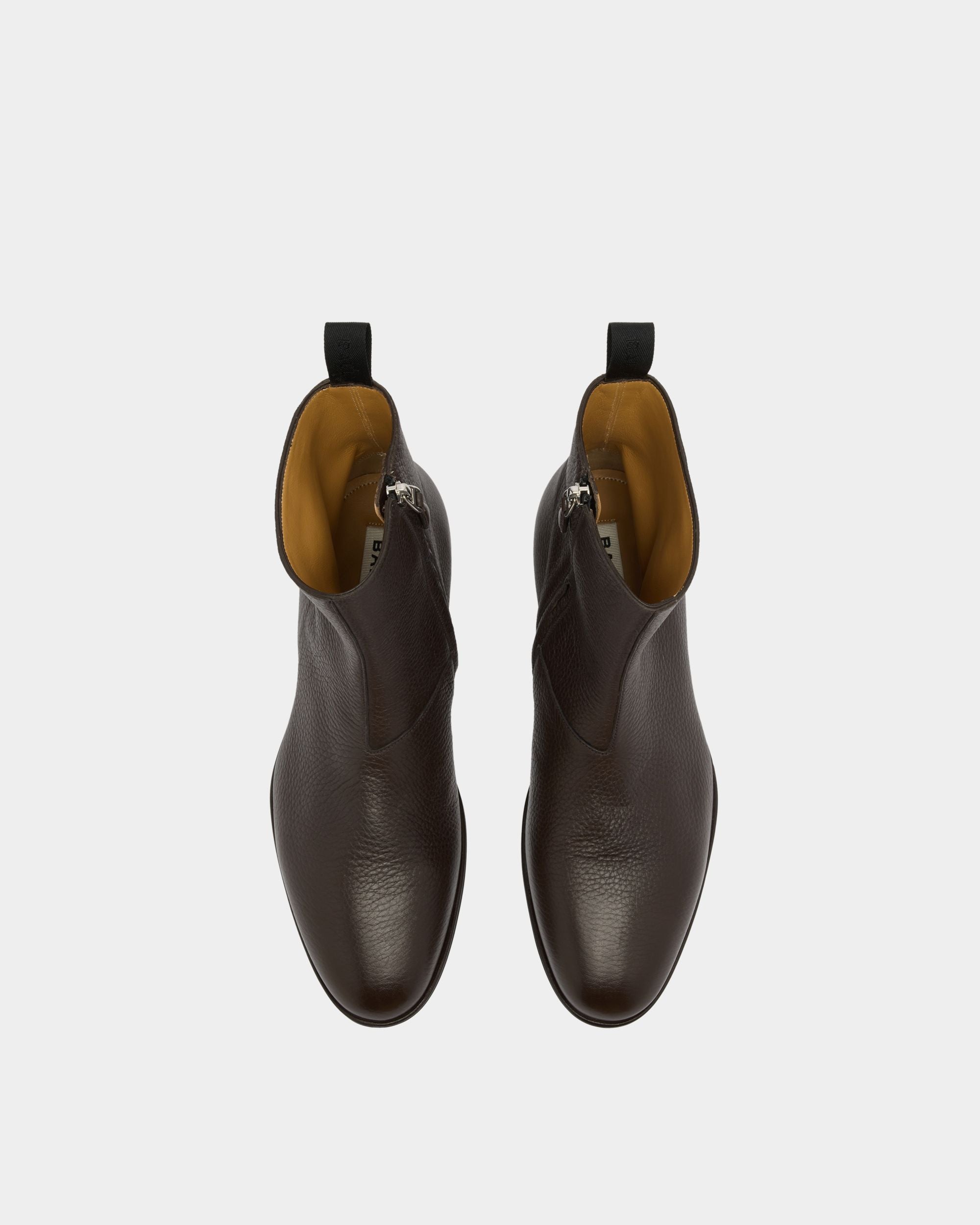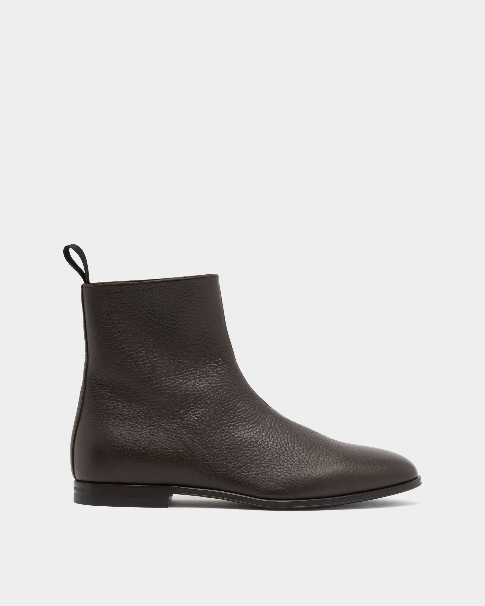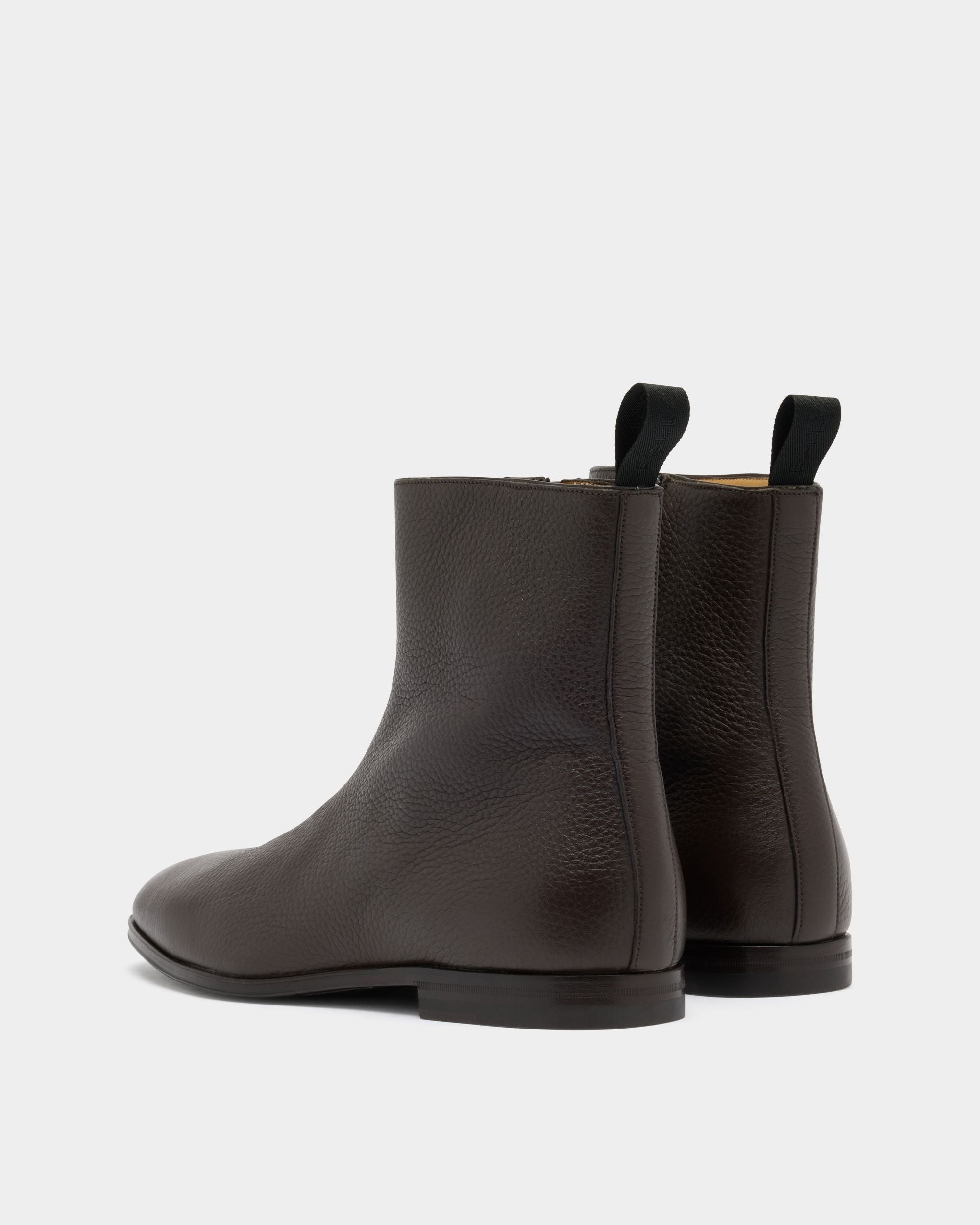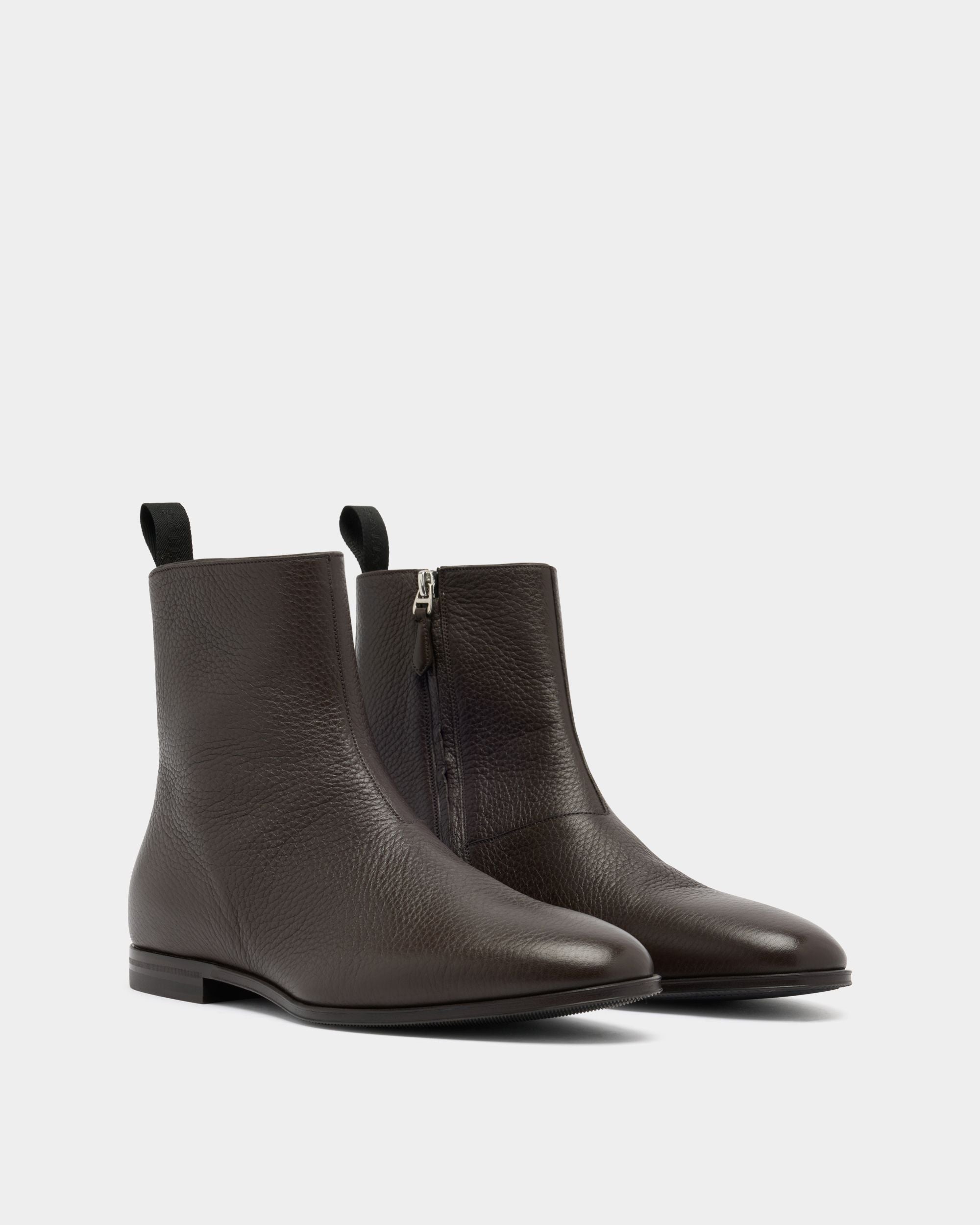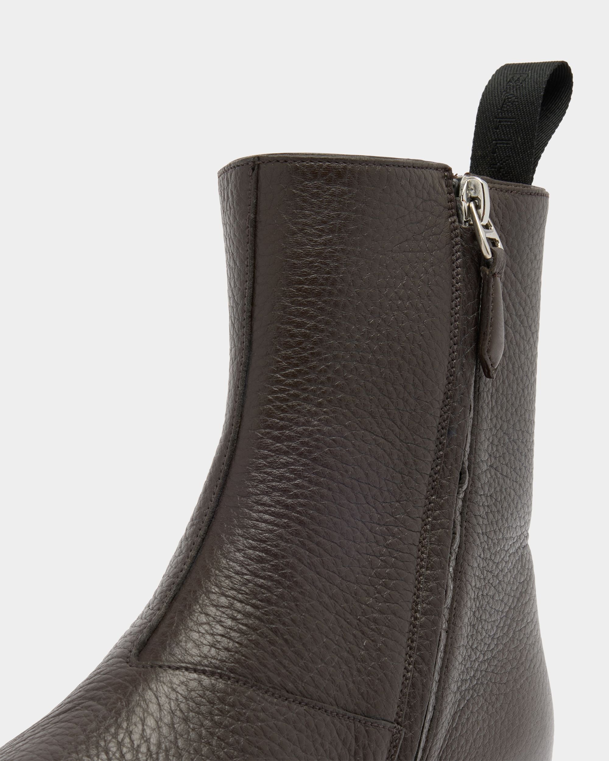 An essential silhouette defines this Westminster boot in Ebano grained deer leather. The upper is sleek. with seams kept to a minimum. and embellished by a simple strip of leather and a pull loop at the back. A zipper is concealed on the inner ankle. for easy slip on and off.