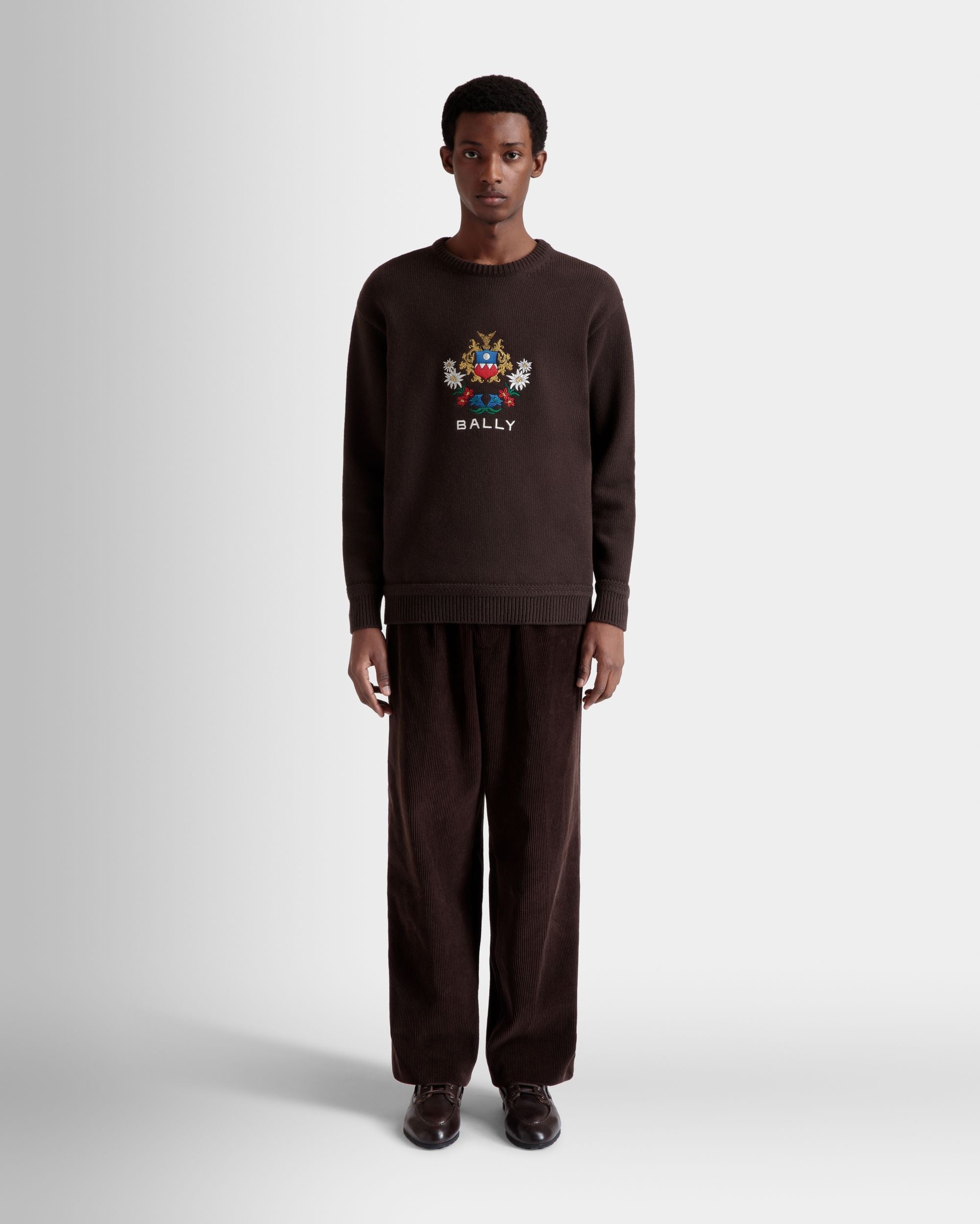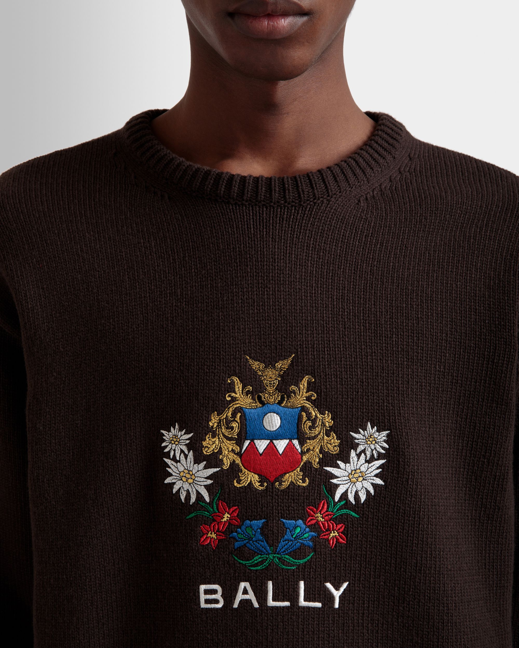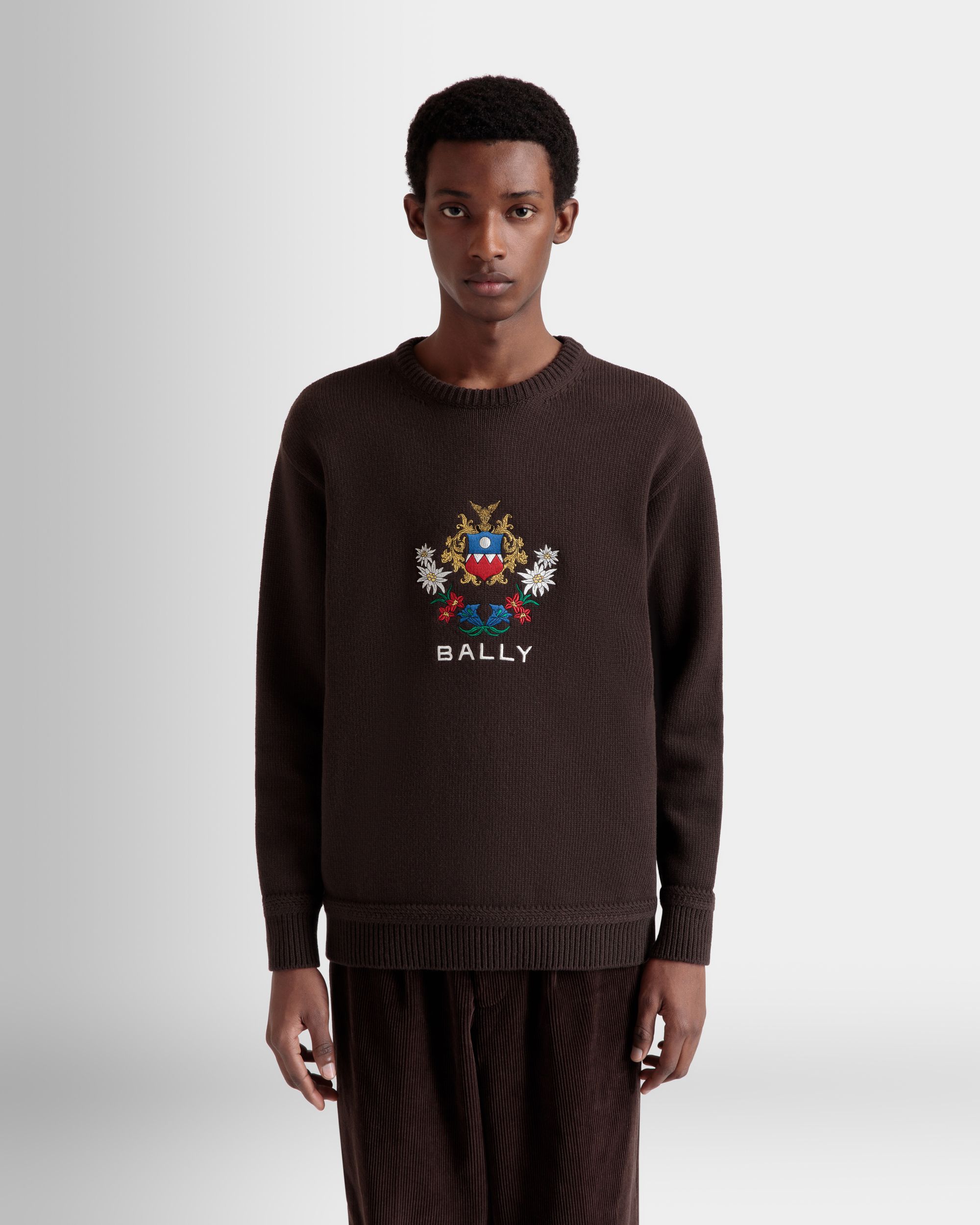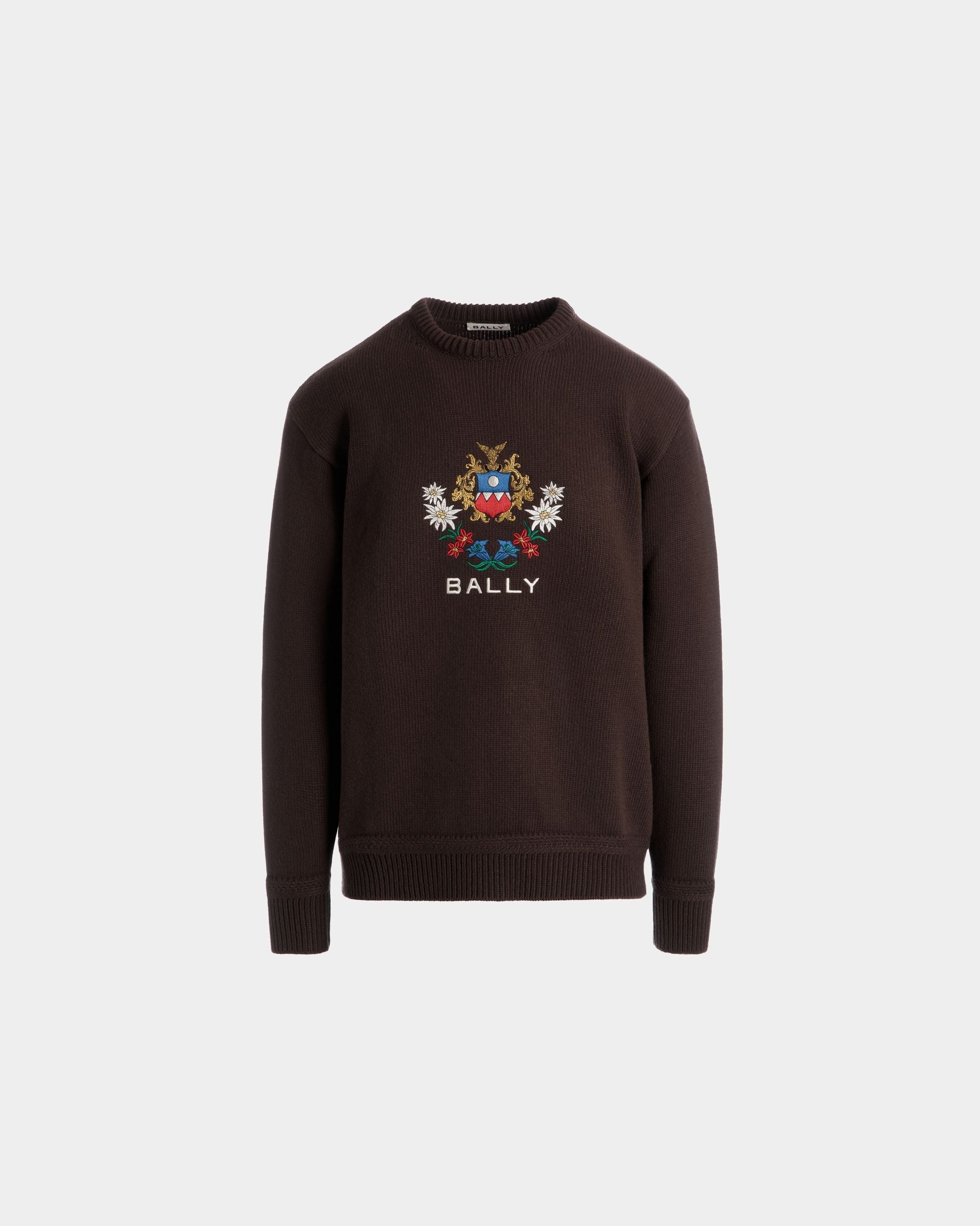 Embroidered Alpine Flowers and a Bally Crest emblazon the front of this knit wool sweater in an Ebano brown hue.