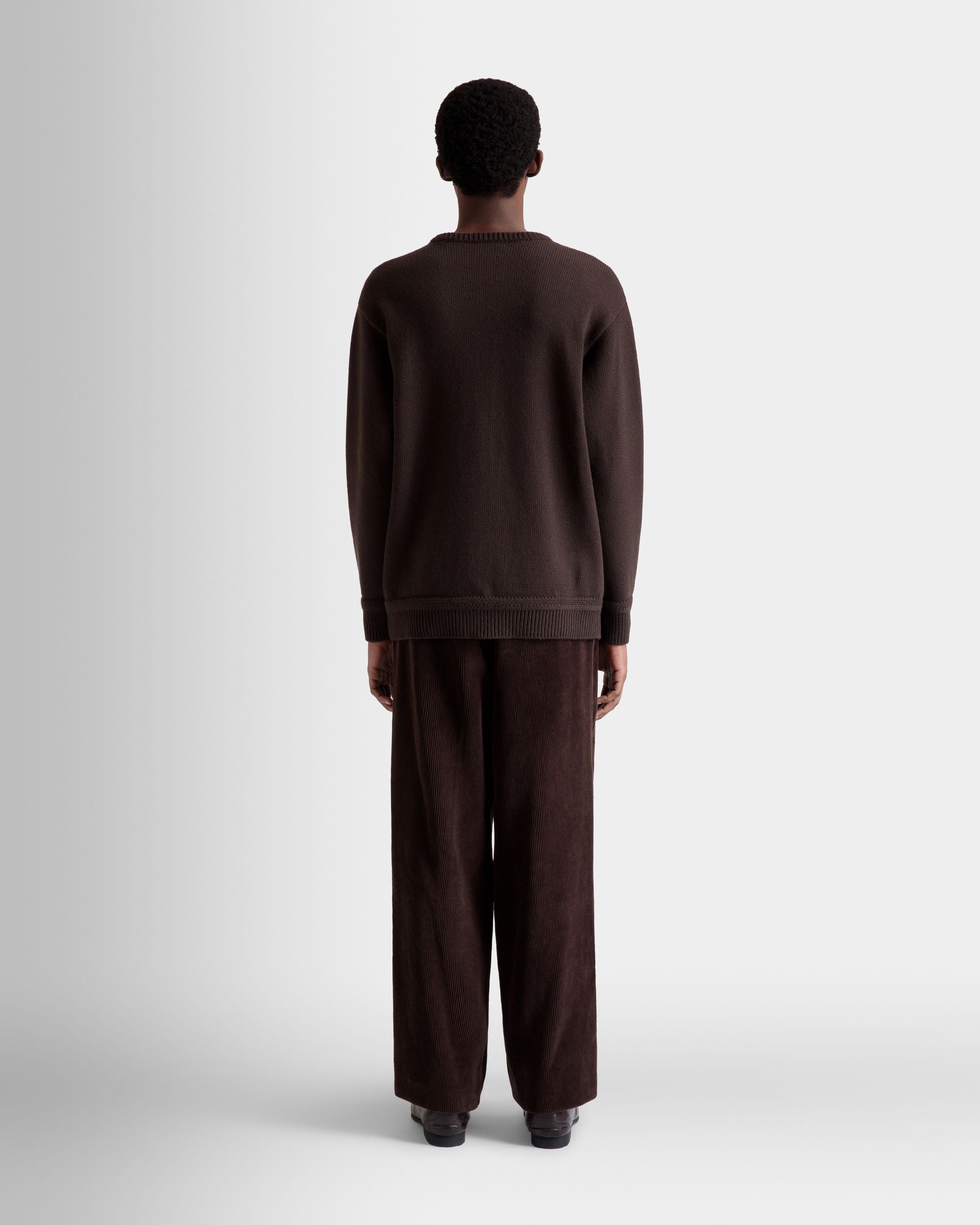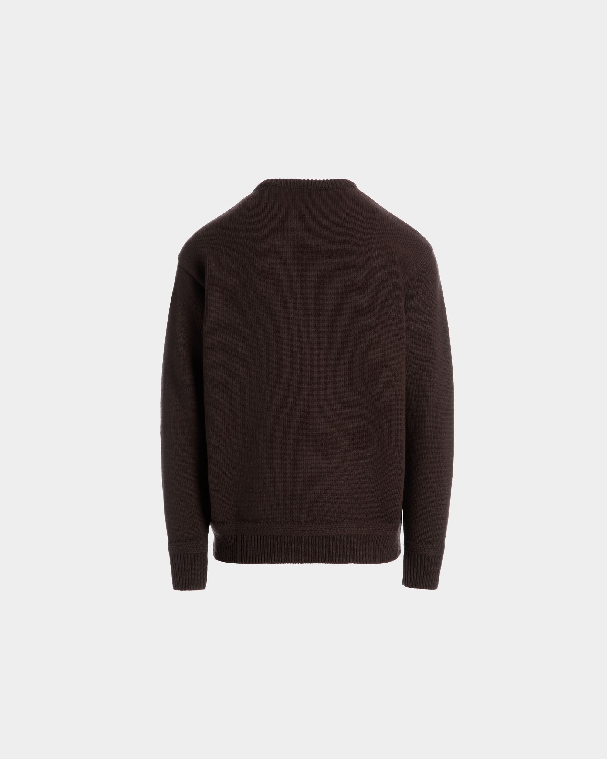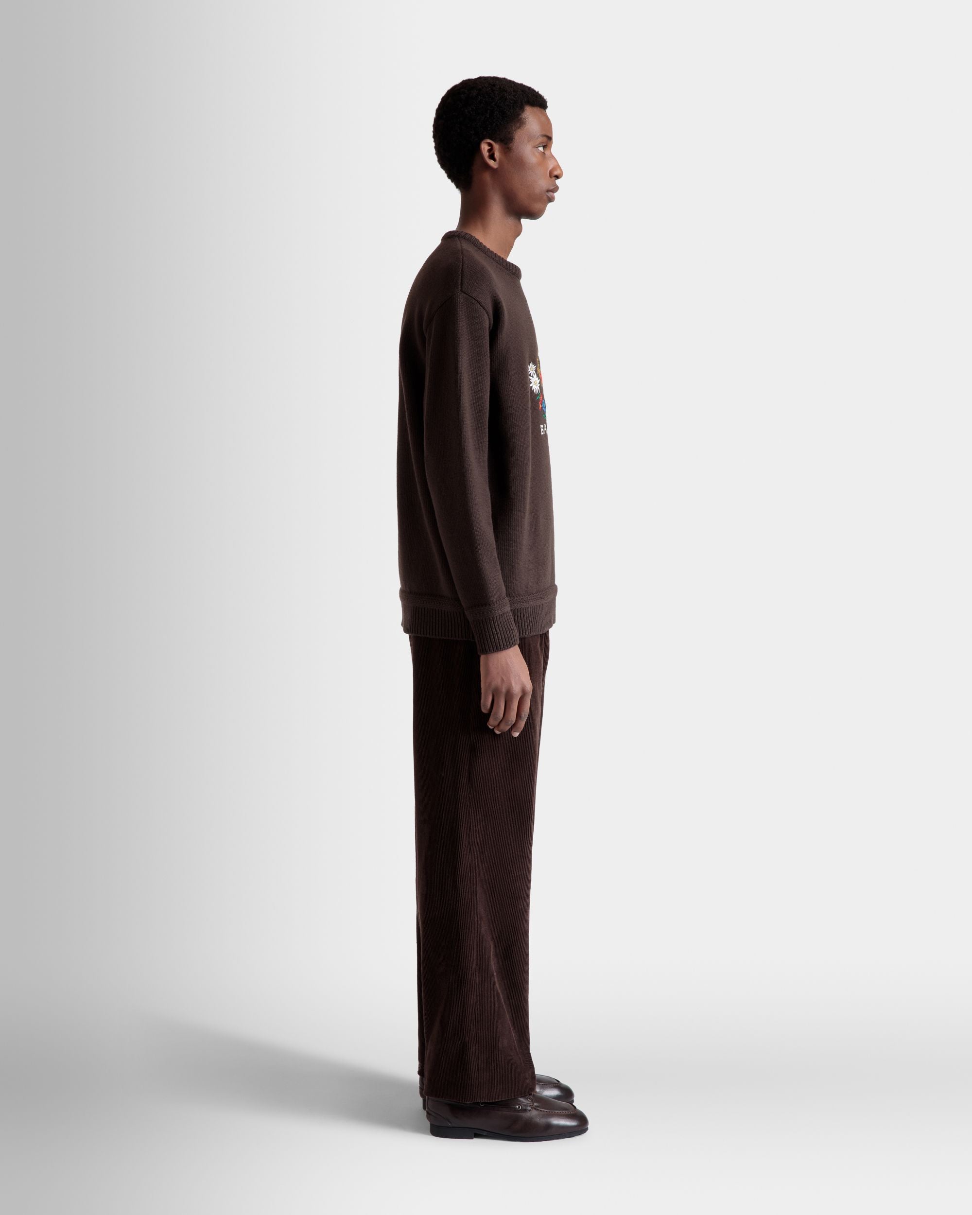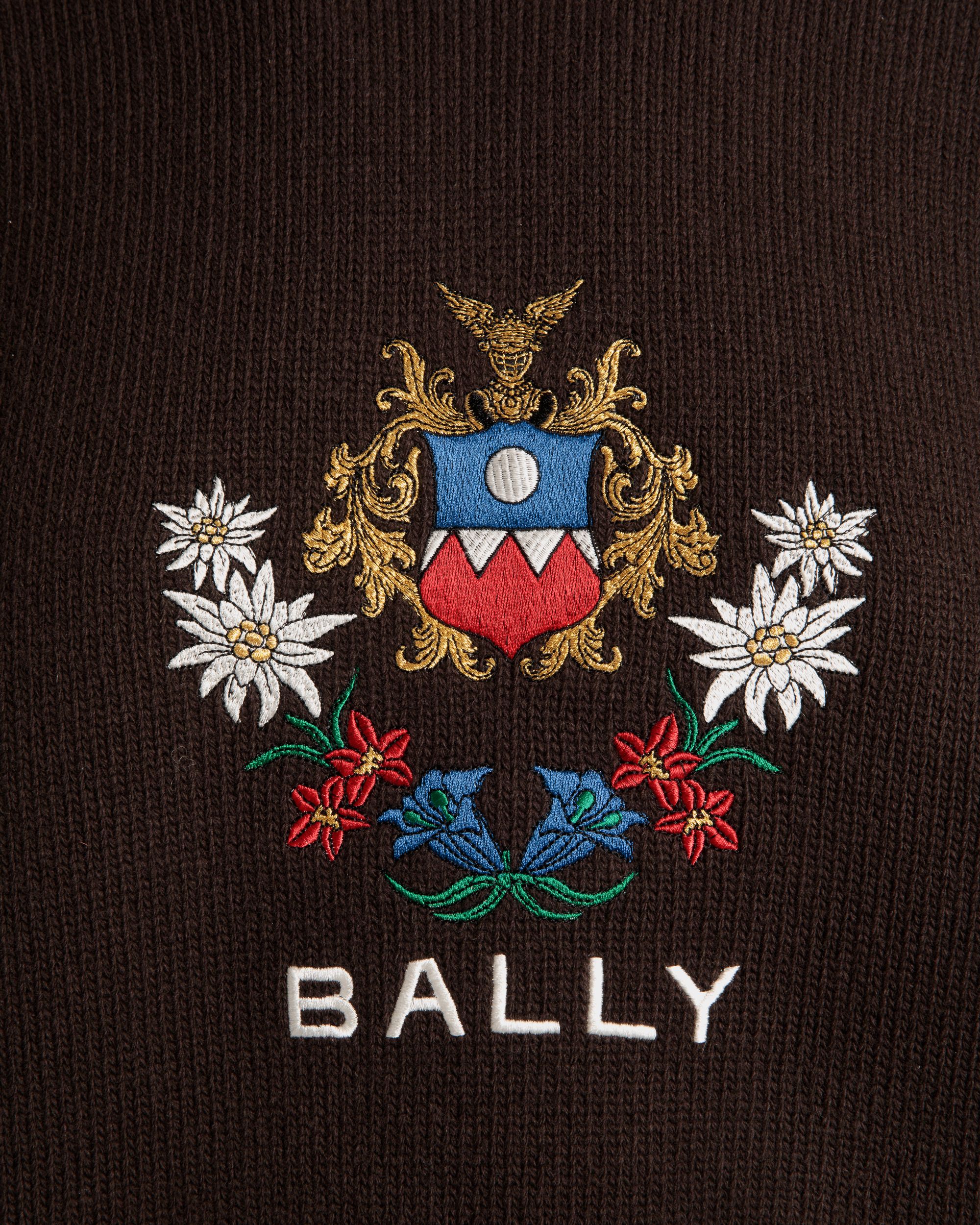 Embroidered Alpine Flowers and a Bally Crest emblazon the front of this knit wool sweater in an Ebano brown hue.